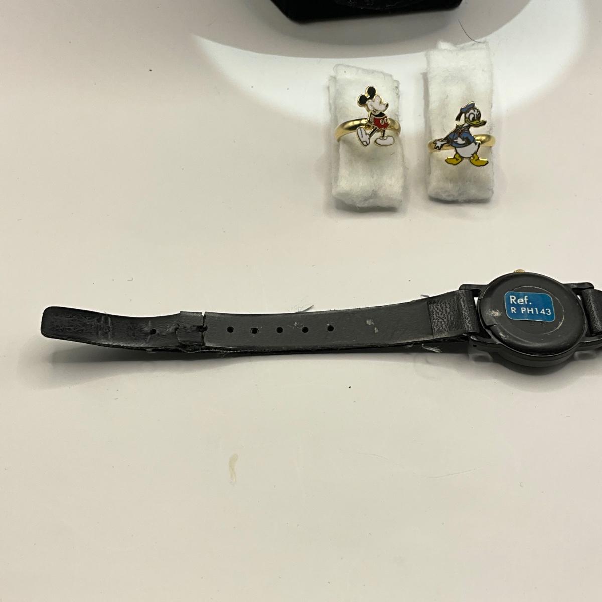 Two Adjustable mickey and daffy duck rings with small enamel mickey pendant on a 13" chain