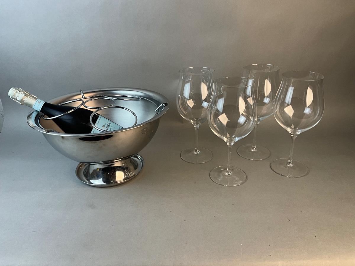 1228 Large Stainless Steel Wine Cooler with Four Wine Enthusiasts Balloon Goblets