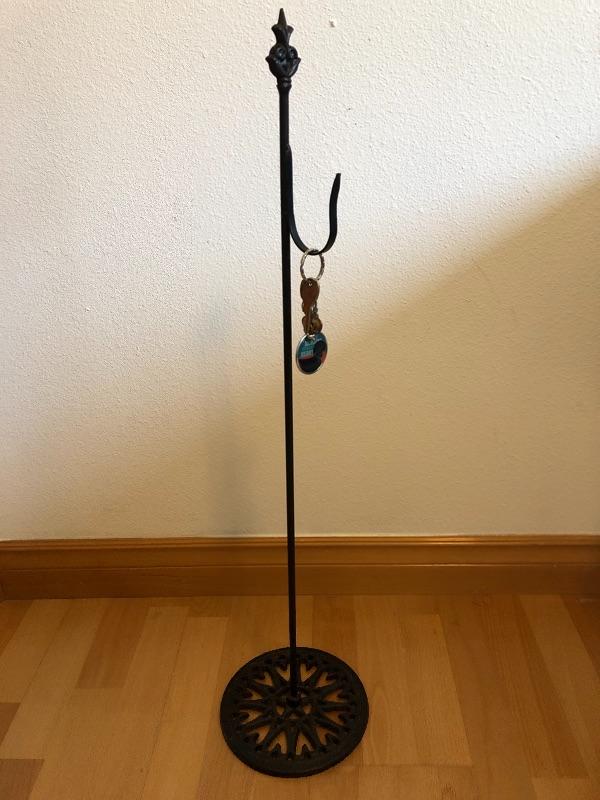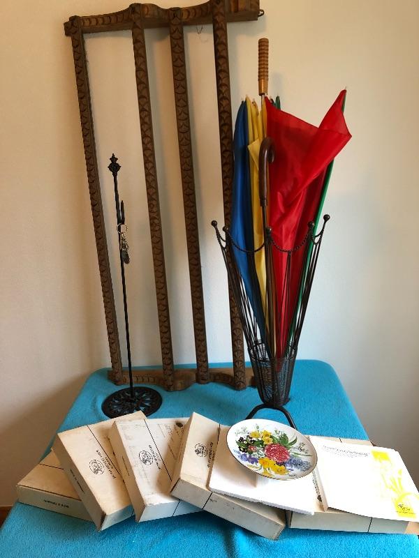 I know it's hard to tell from the picture but the wood plate rack is very nice. I put the collectors plate in this lot to go with plate rack. There is a metal free standing umbrella stand and free standing key hanger.