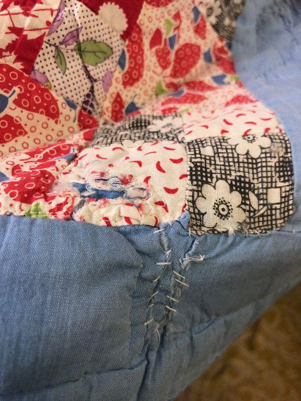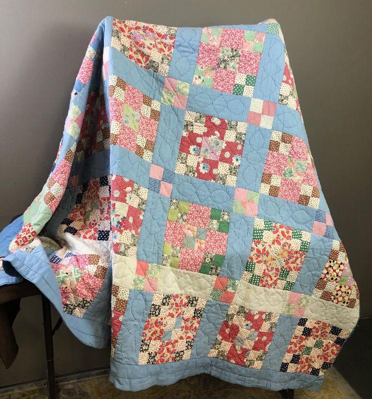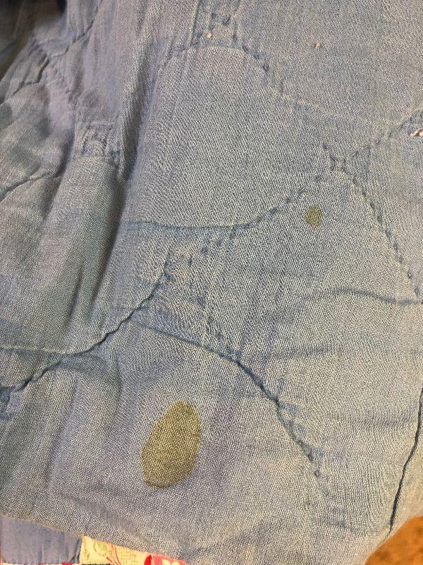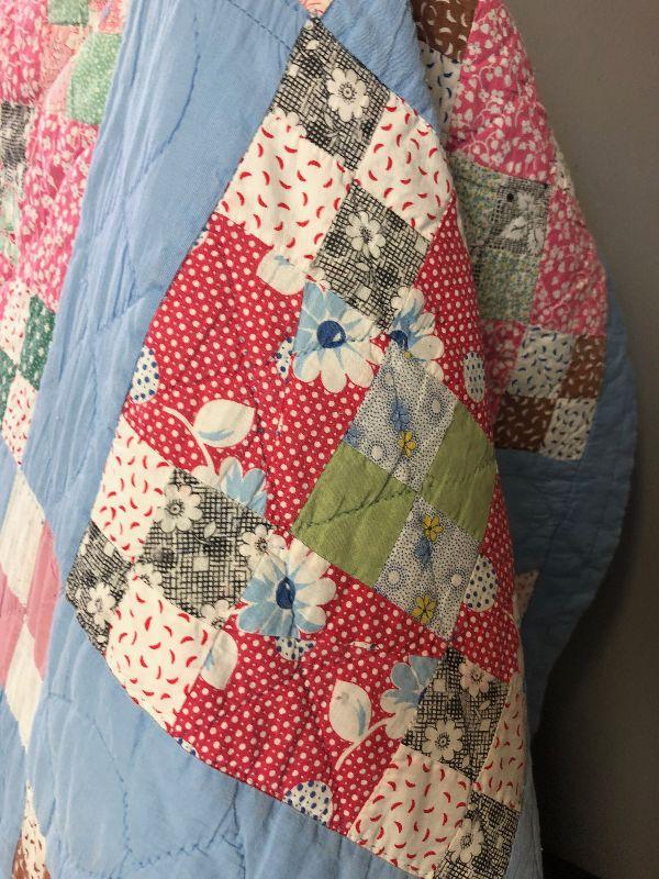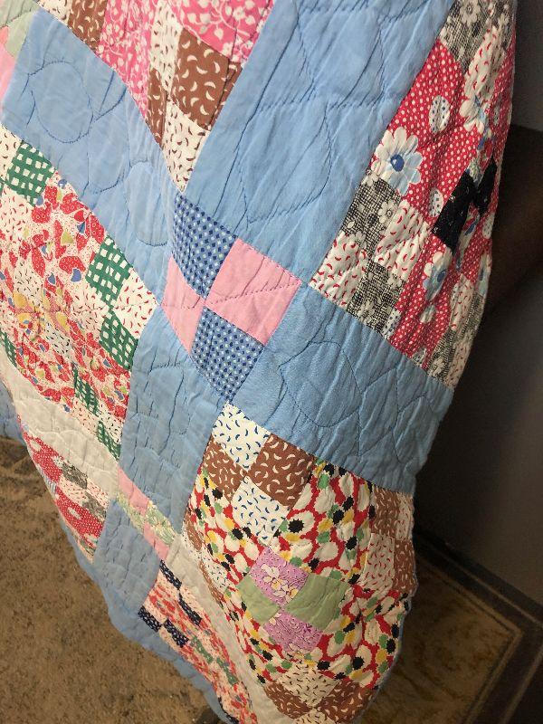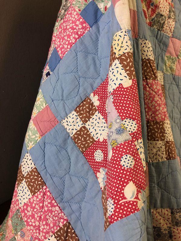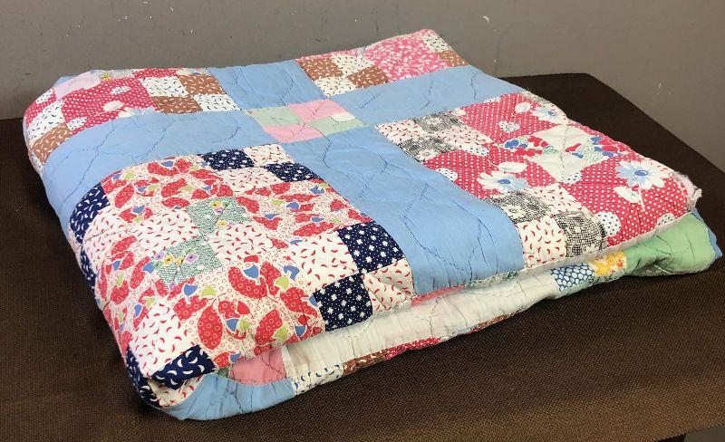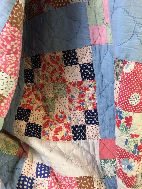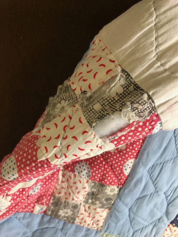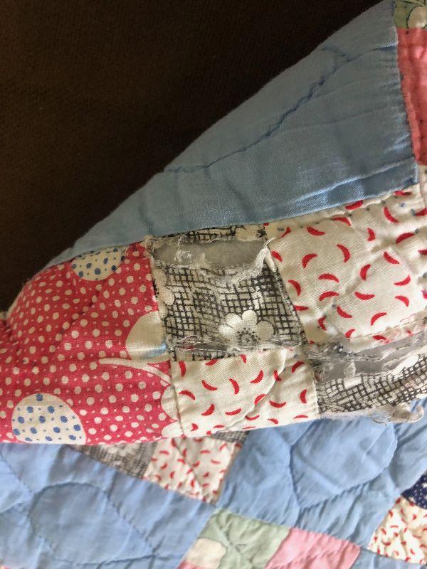 70 X 82" a few small tears, Reds, Pinks, Green and Brown GOOD Condition. No major stains, a few small ones that may launder out. old repairs,