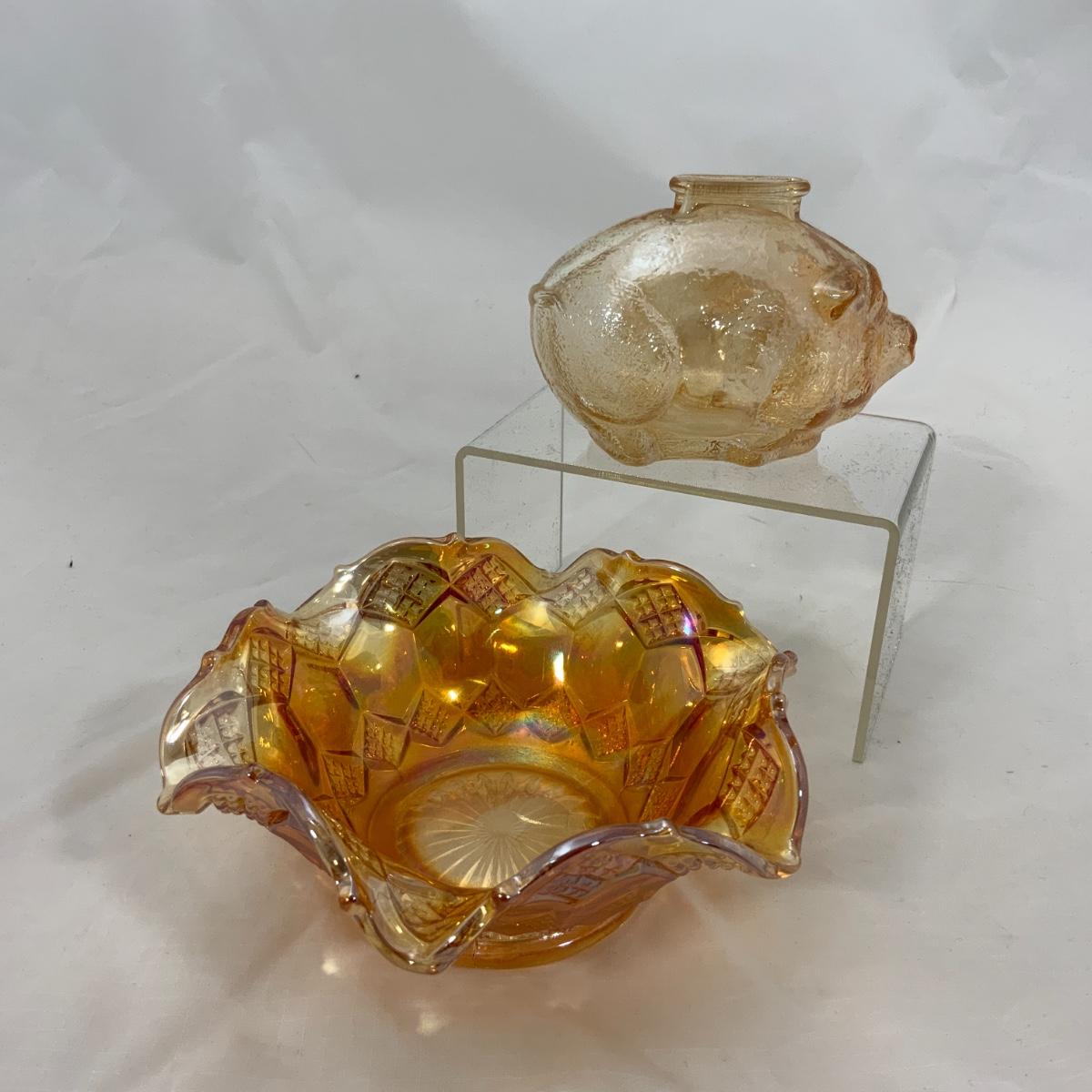 From the Estate of Peter and Alice Radovanovich: Two Carnival Glass pieces, a Pig Piggy Bank and a Bon Bon Dish. Both in exceptional vintage condition, no cracks or chips noted. Please see photos for details and condition. ::: Shipping is available on this lot. If you require shipping you must let us know at the close of the auction. We will coordinate with you after the item has been won. Shipping fees will include insurance up to or exceeding the value of all items being mailed. If you have any questions regarding this lot please contact the auctioneer either via this website, by direct email or by phone. PICK UP TIMES and other important information can be found in the TERMS and DESCRIPTION of the auction. Please take a look for pertinent information. Thanks!