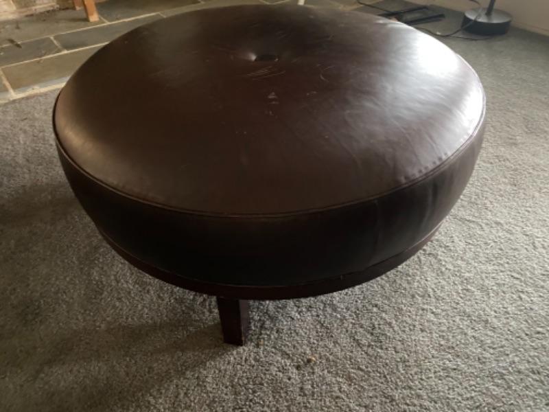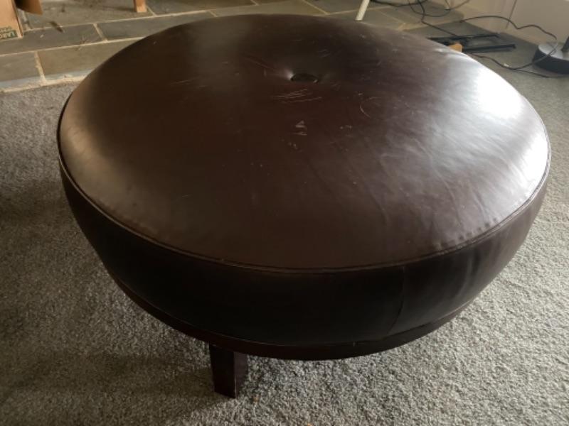 Crate and Barrel Brown Round Faux Leather Ottoman with a few light scratches from wear. Measures 36” round and 15” high