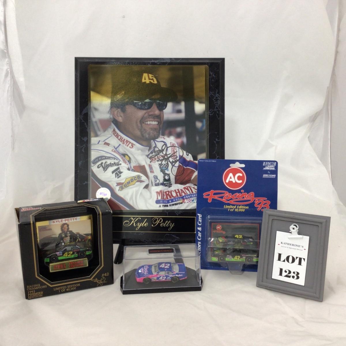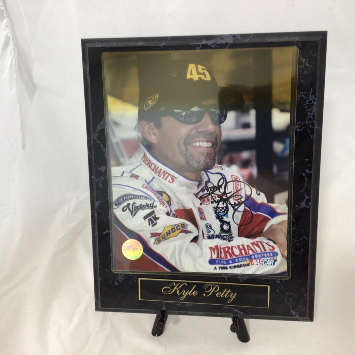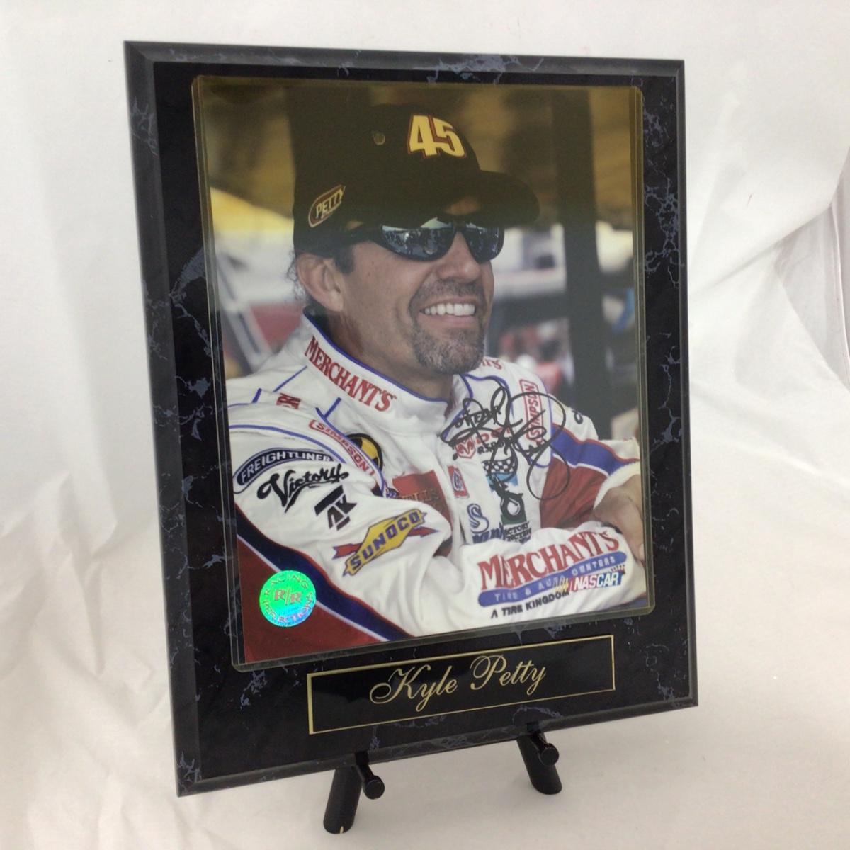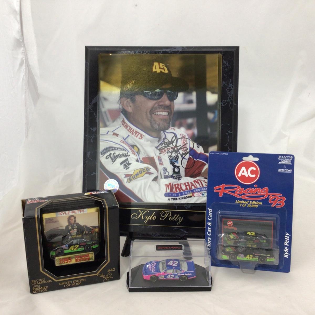 Kyle Petty plaque 10.5 inches by 13 inches. Signed with no Certificate of Authenticity, item is assumed authentic however not guaranteed. Three Kyle Petty collector cars.