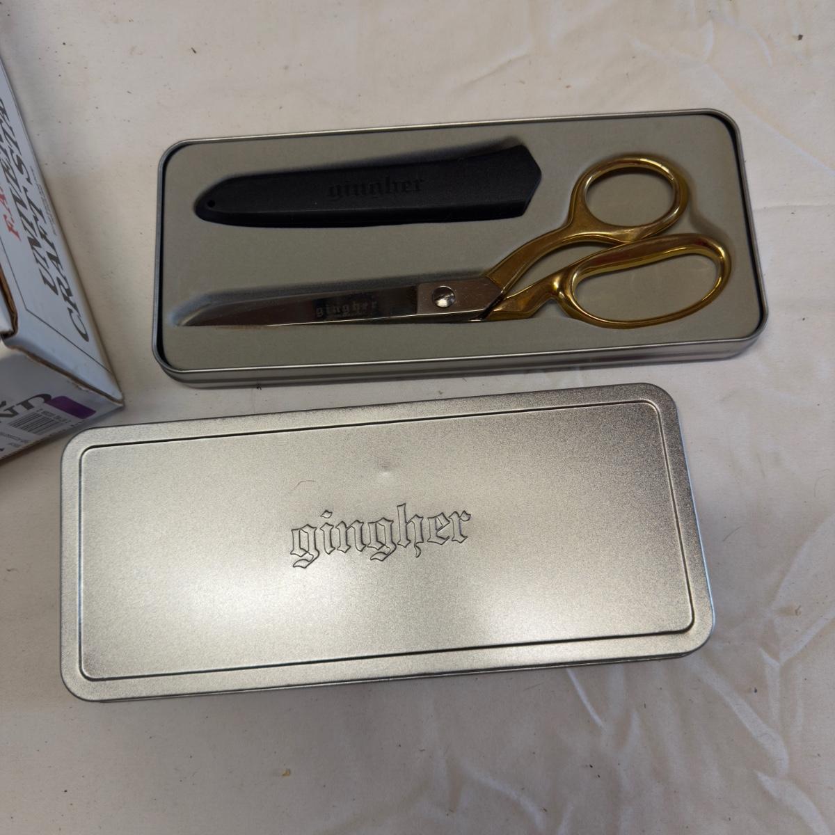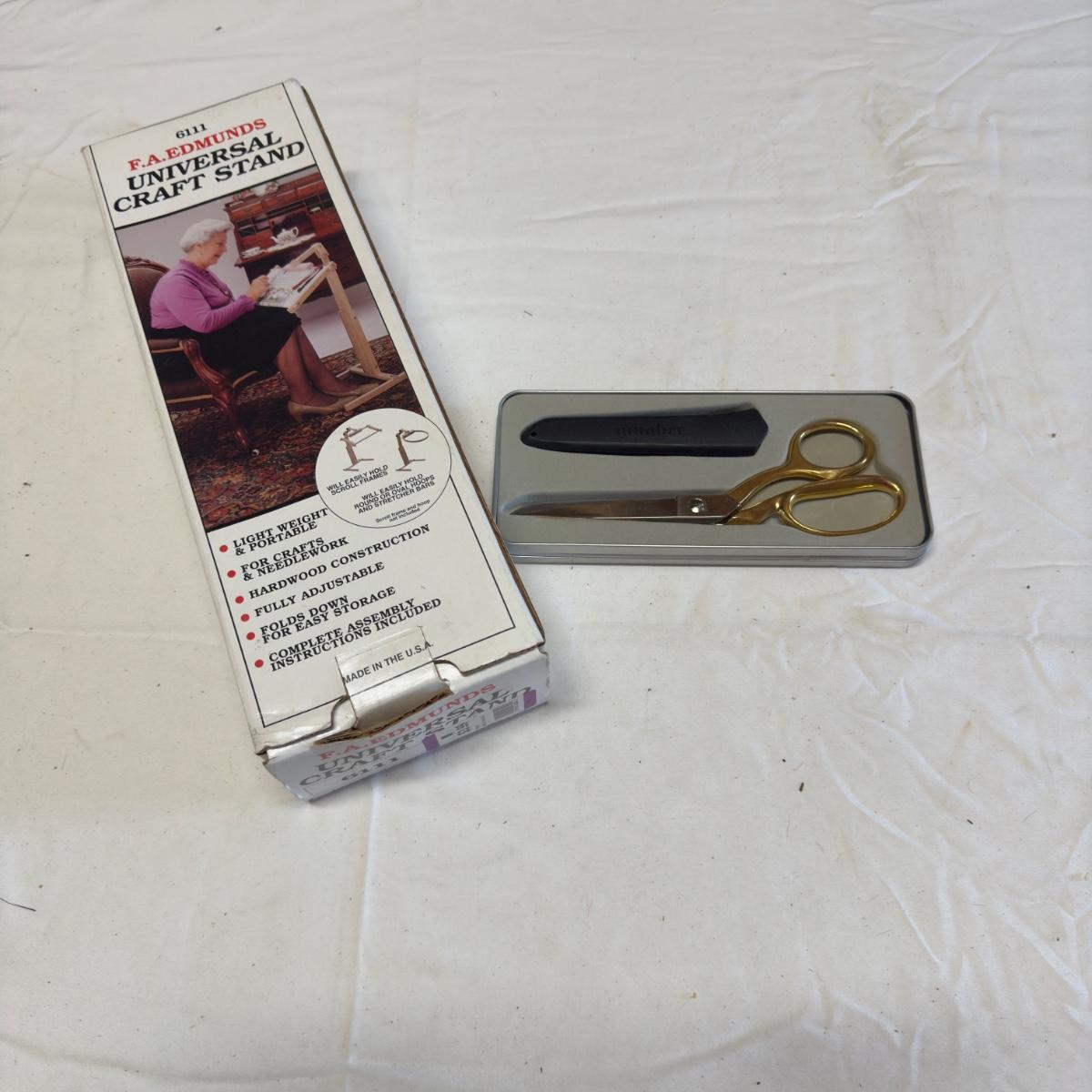 U1232 New Edmunds Universal Craft Stand & Gingher Gold Handled Shears in Metal Case