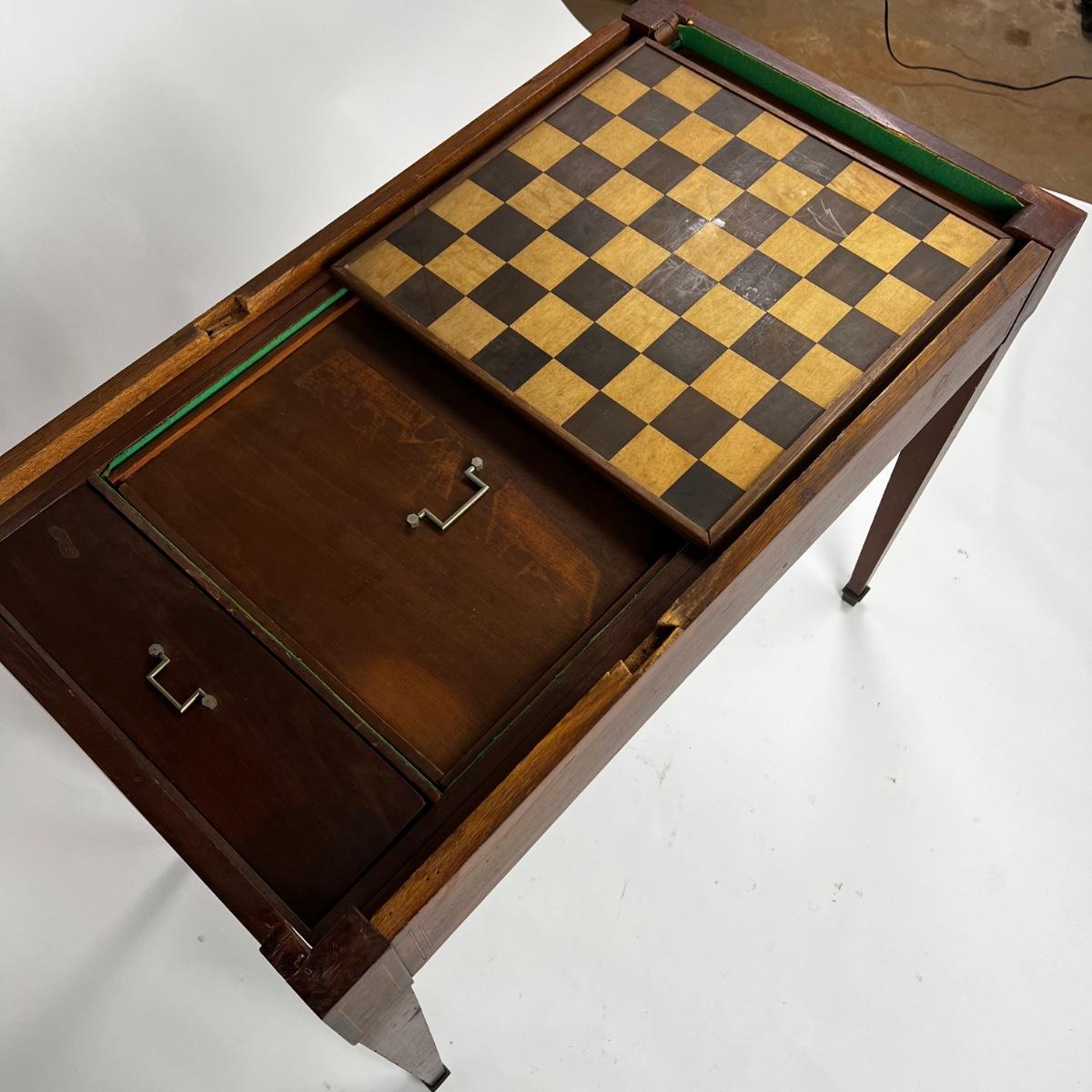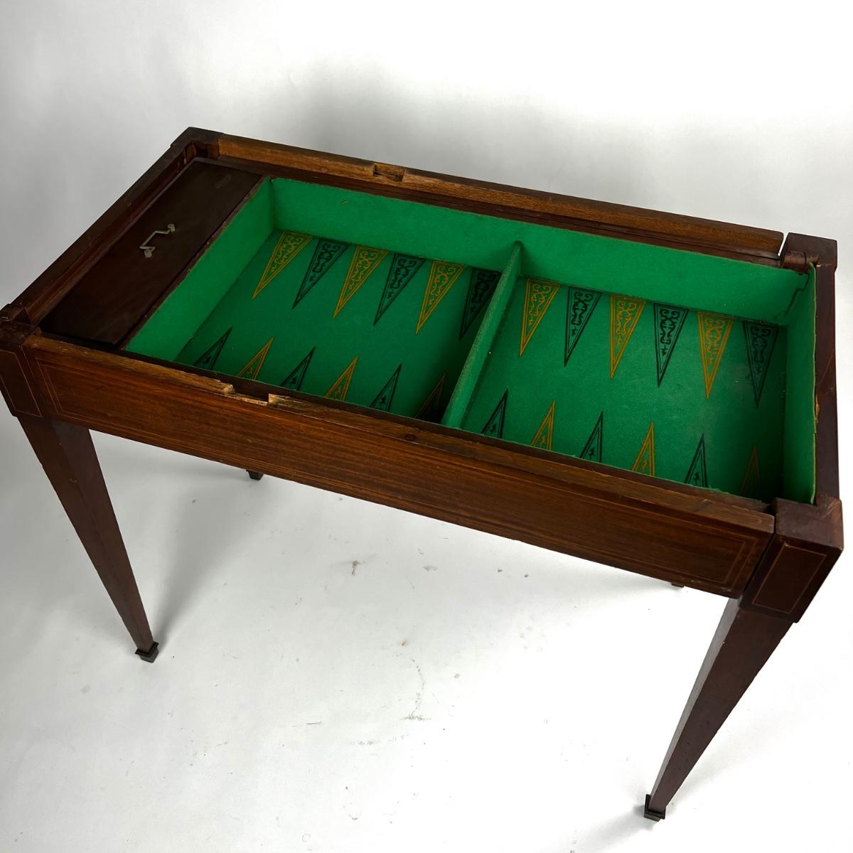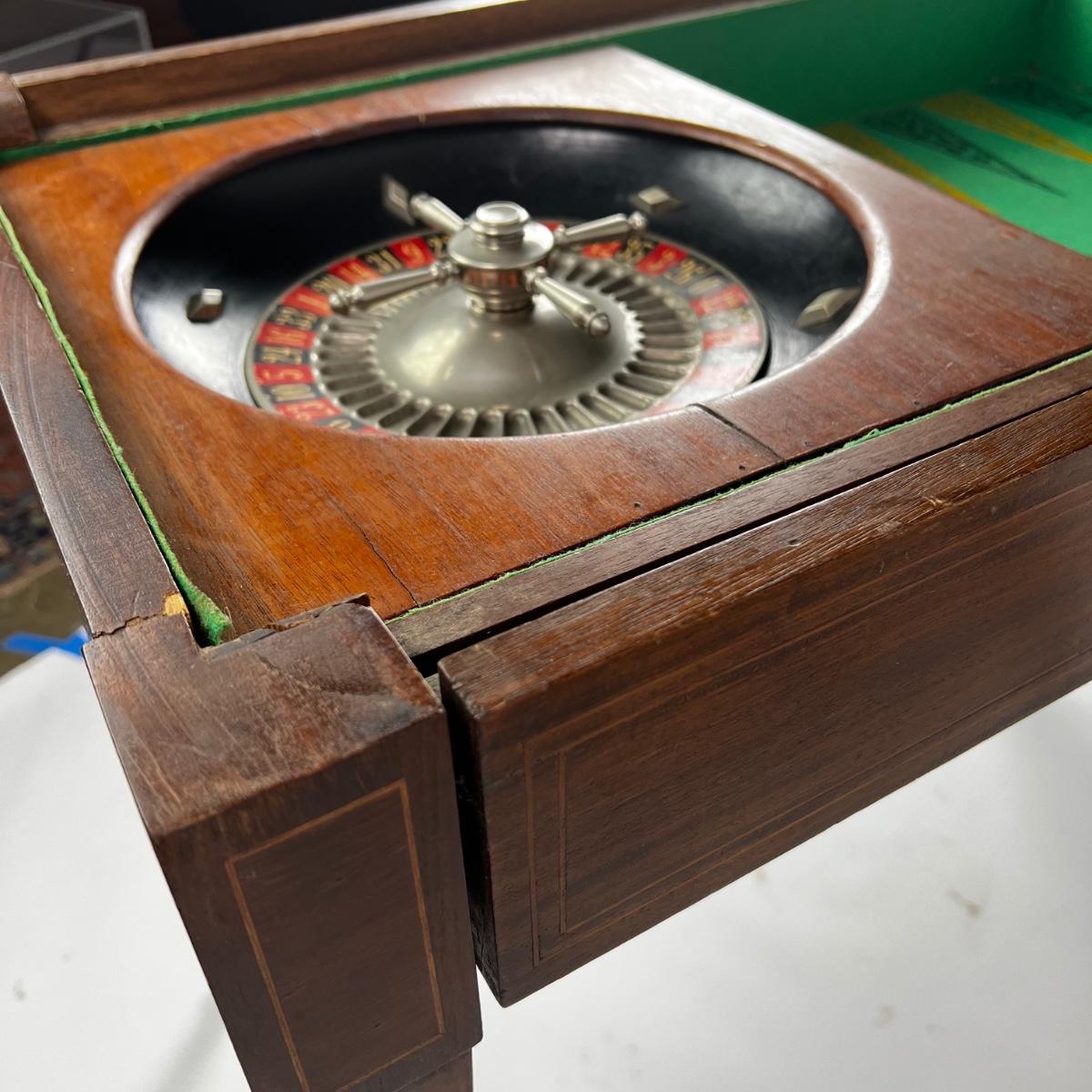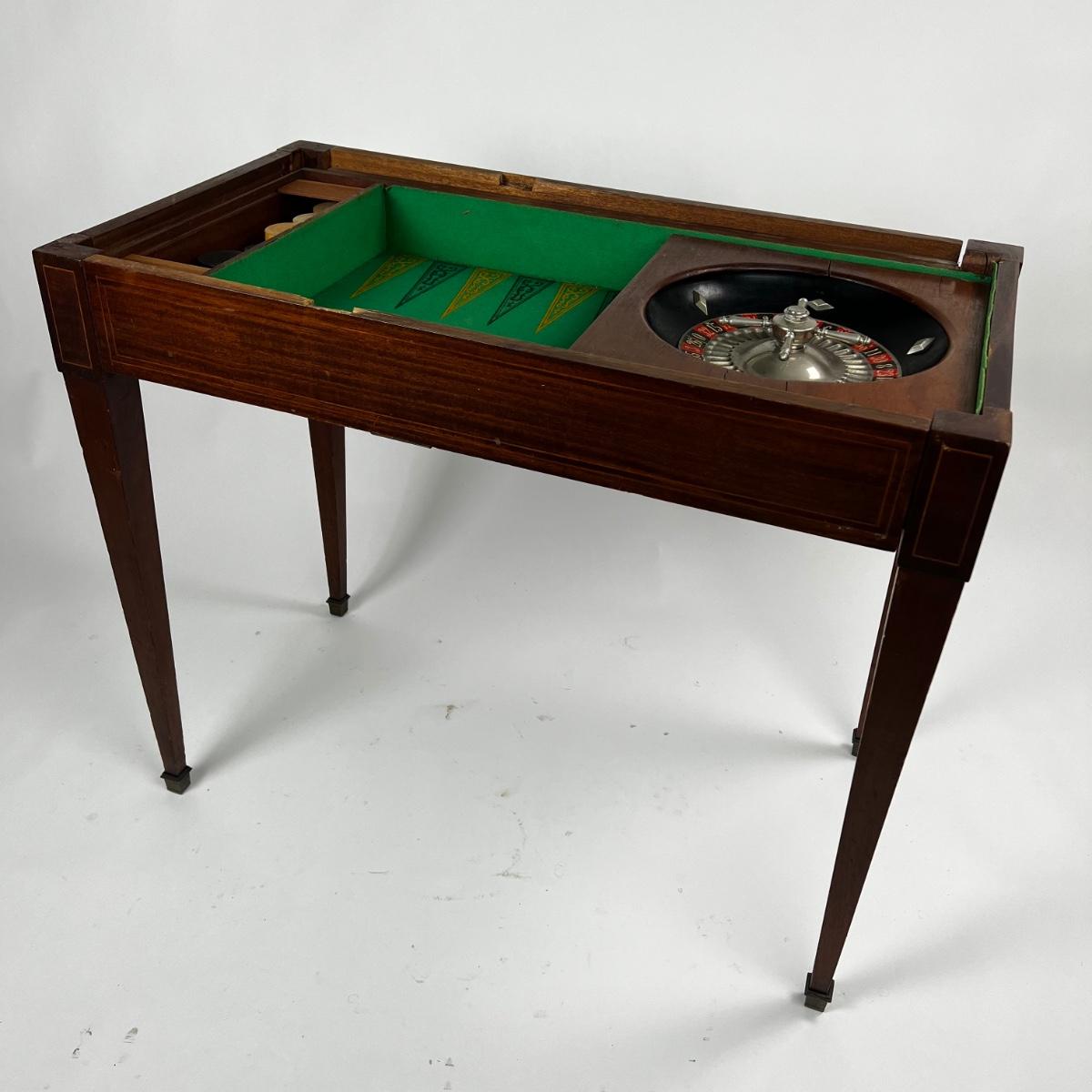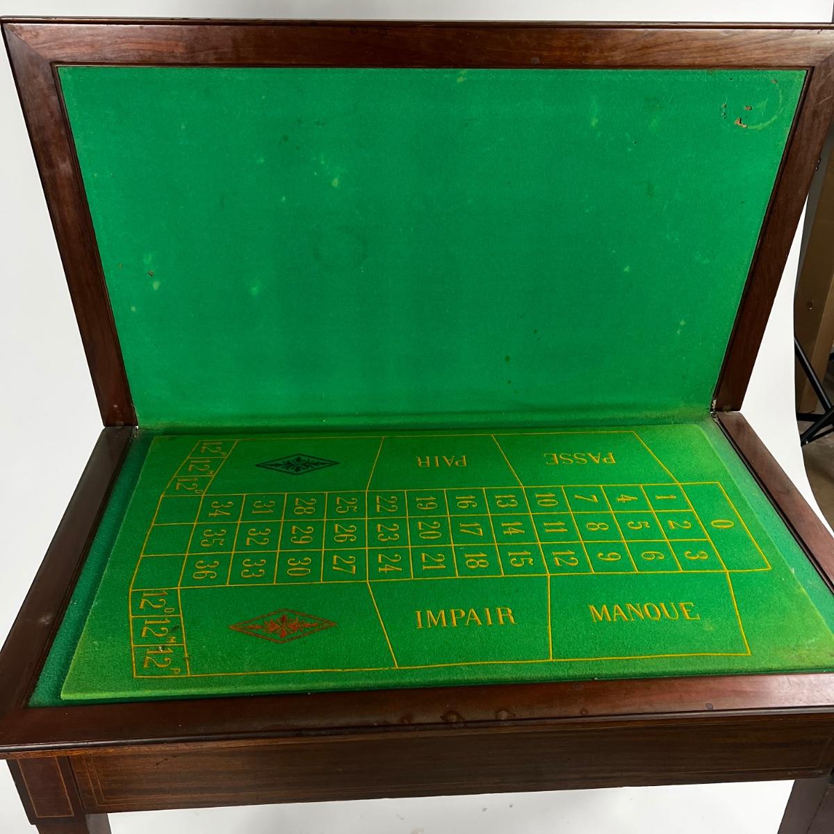Antique Edwardian Period Mahogany Roulette & Games Table. Line inlay. Tapered legs with squared brass castors. Rear legs extend out to support the double top. Table has multiple compartments for different games such as roulette, chess, dominoes, backgammon. **there are two missing pawns pieces for chess**