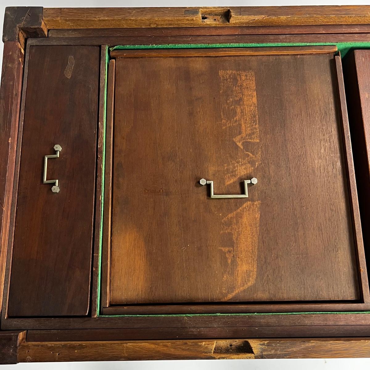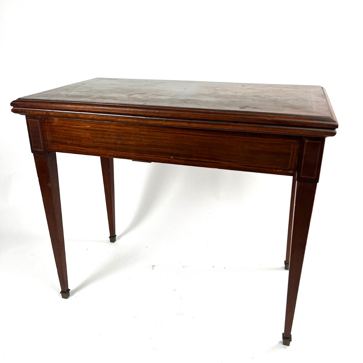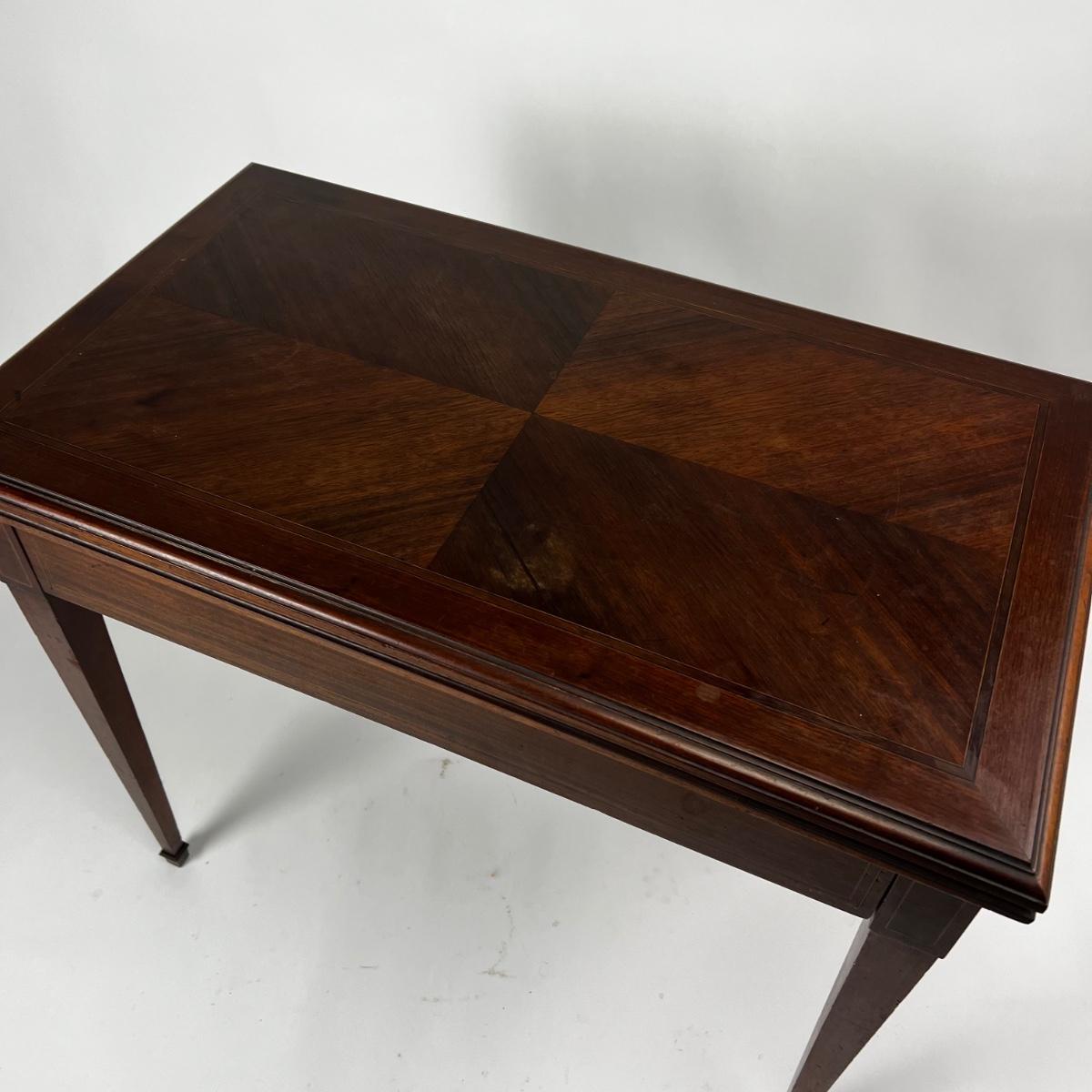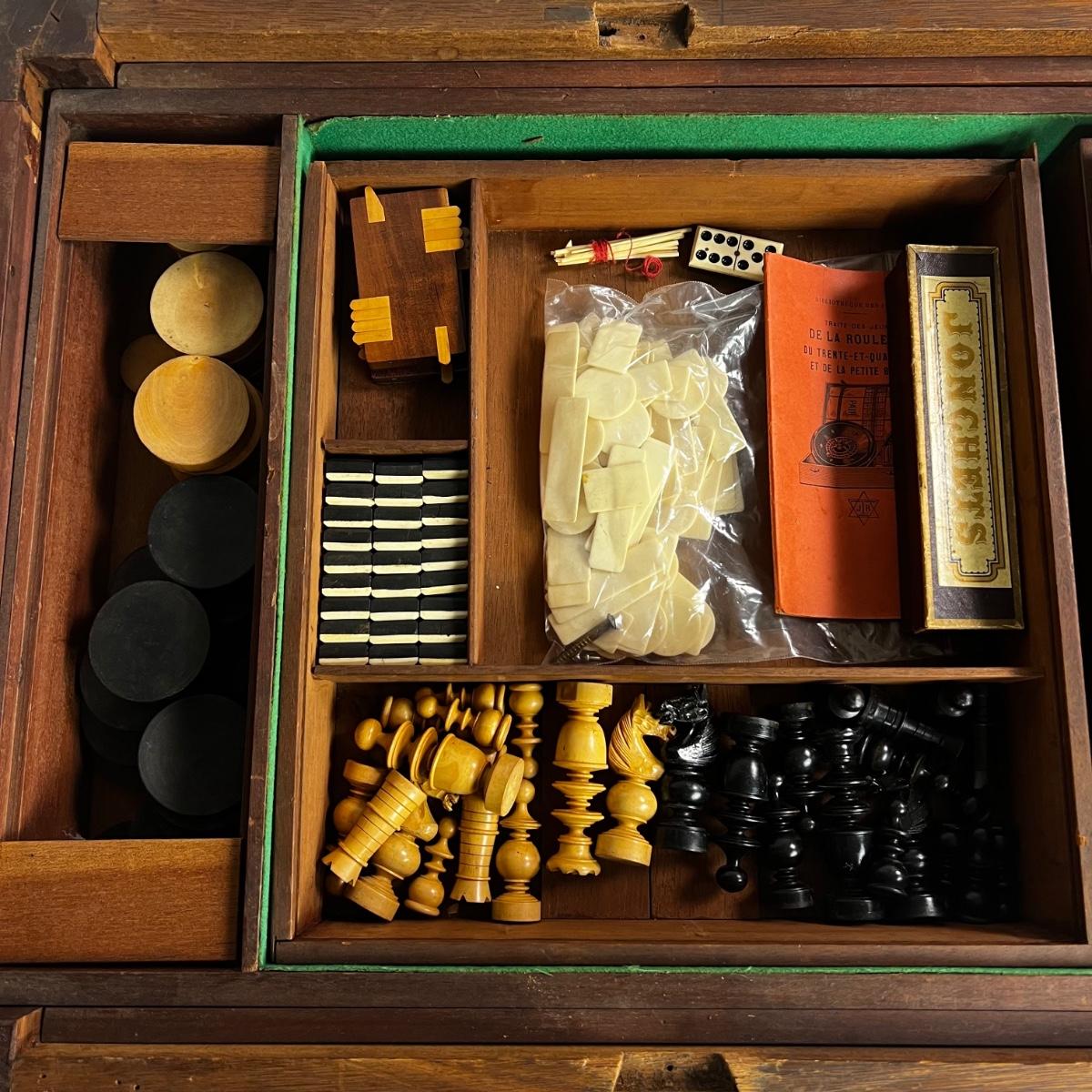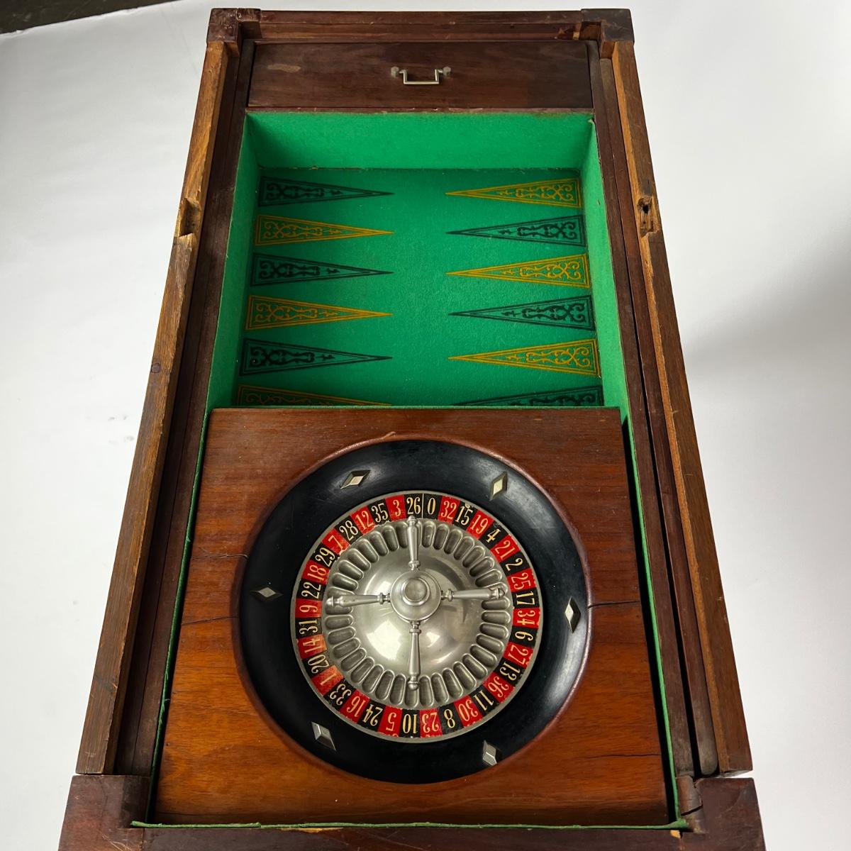 Antique Edwardian Period Mahogany Roulette & Games Table. Line inlay. Tapered legs with squared brass castors. Rear legs extend out to support the double top. Table has multiple compartments for different games such as roulette, chess, dominoes, backgammon. **there are two missing pawns pieces for chess**