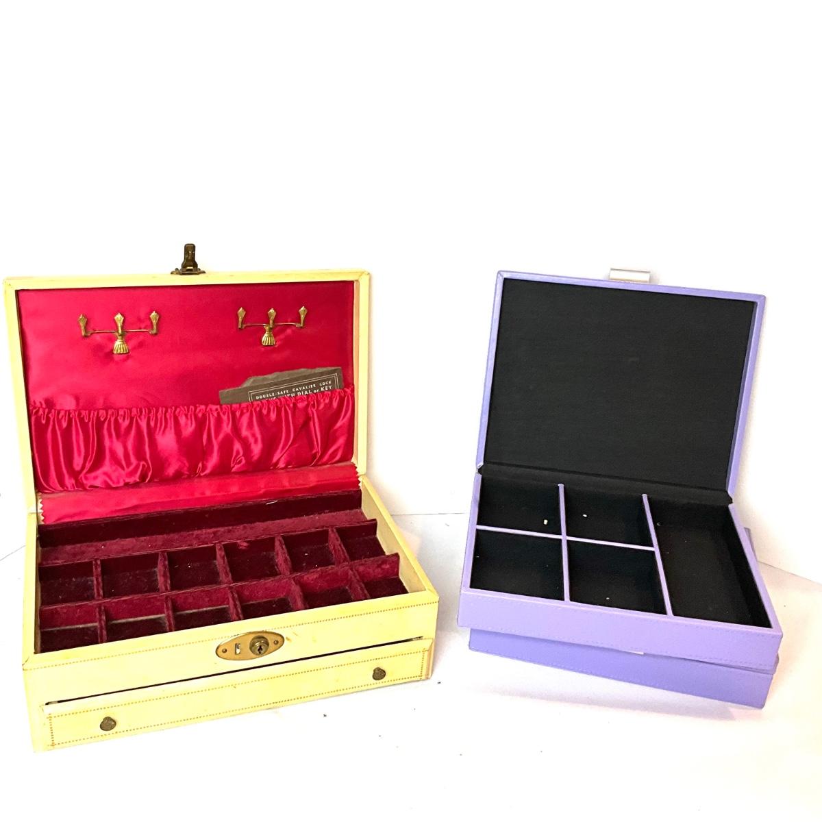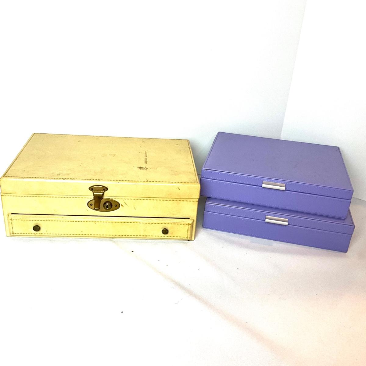 Two are purple and the other has a drawer in front and top opens up with red material and sectioned off