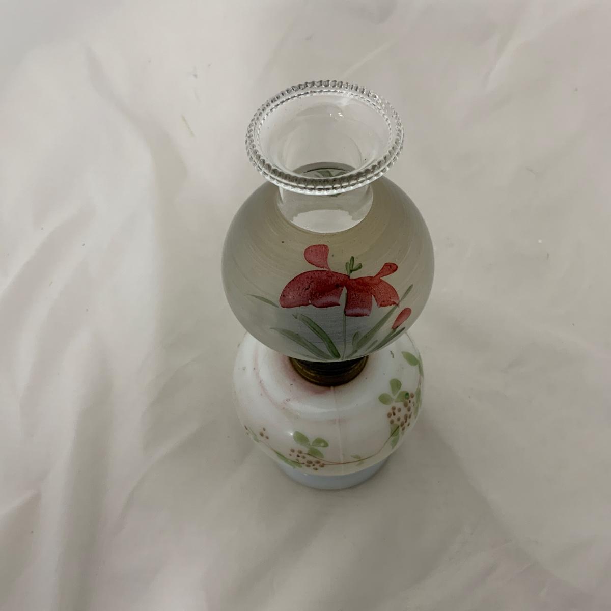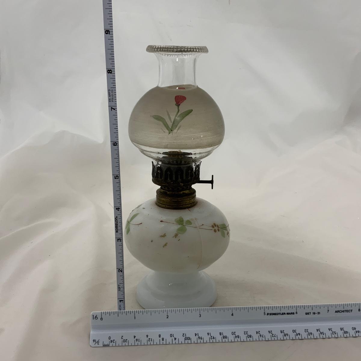 Wonderful and All Original Mini Lamp, circa 1880. I love the flowers on the vase, and I love that the shade shows wear, because it was loved and used for years. Please see photos for details and condition. ::: Shipping is available on this lot. If you require shipping you must let us know at the close of the auction. We will coordinate with you after the item has been won. Shipping fees will include insurance up to or exceeding the value of all items being mailed. If you have any questions regarding this lot please contact the auctioneer either via this website, by direct email or by phone. PICK UP TIMES and other important information can be found in the TERMS and DESCRIPTION of the auction. Please take a look for pertinent information. Thanks!