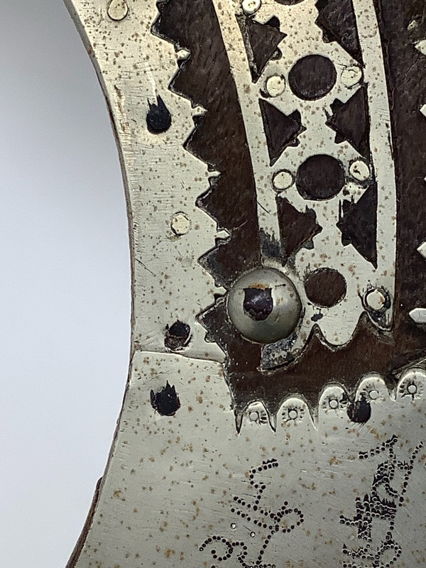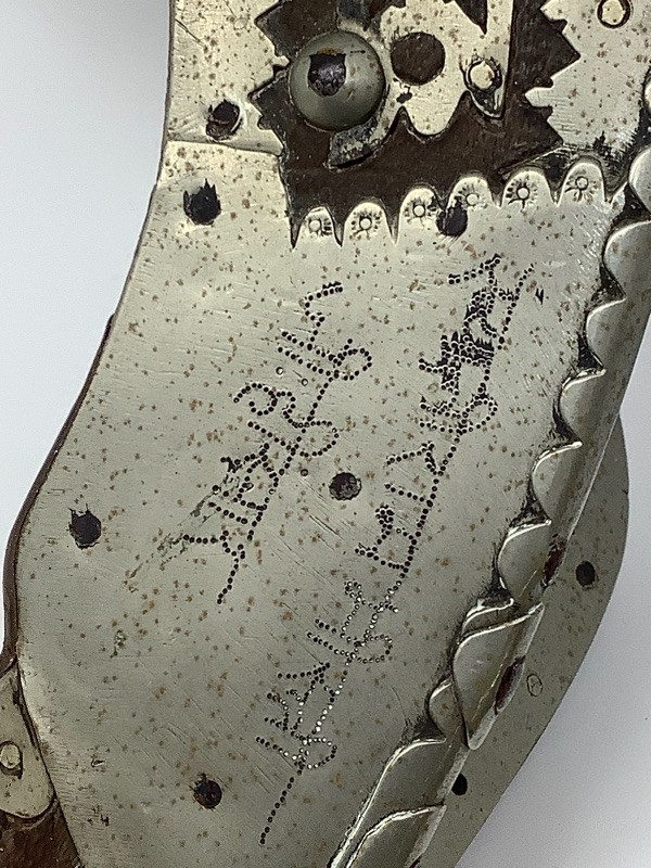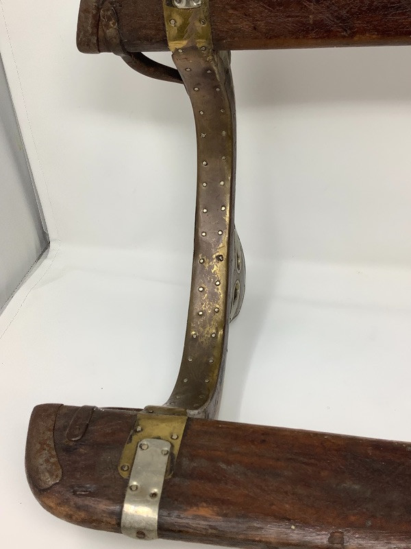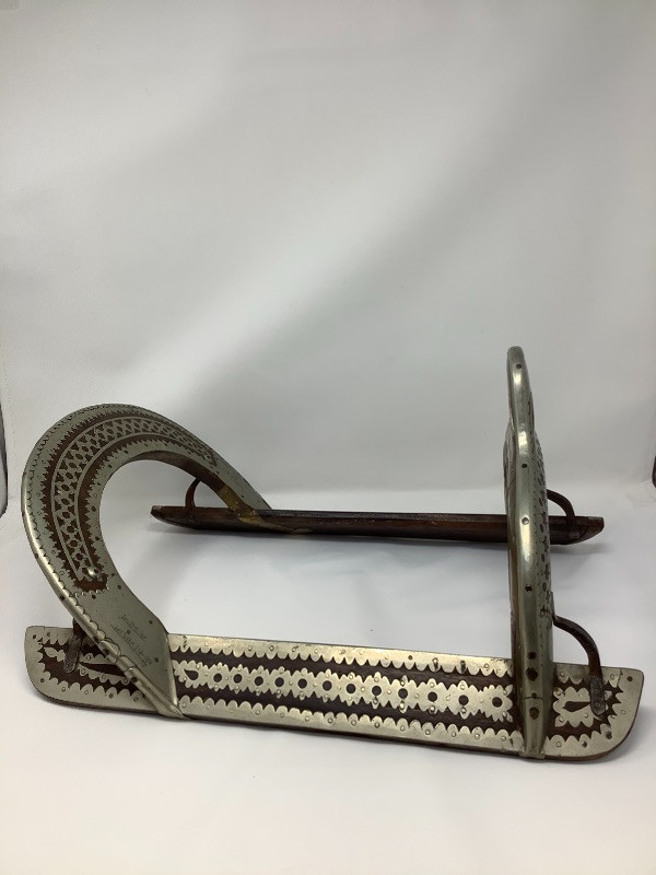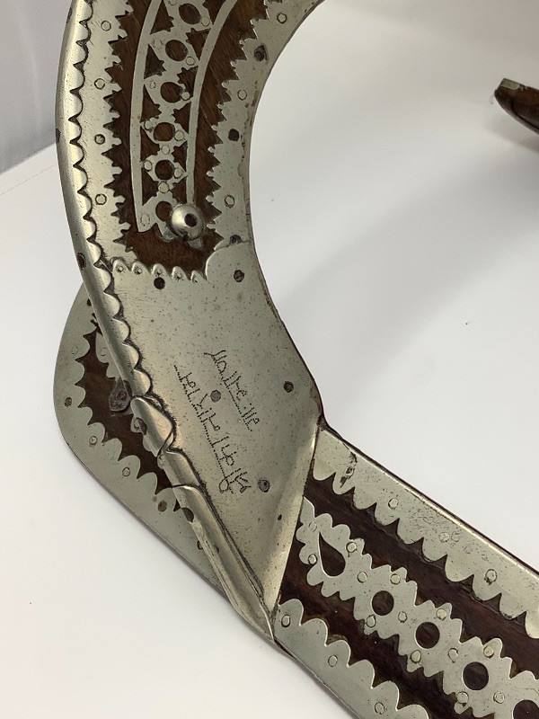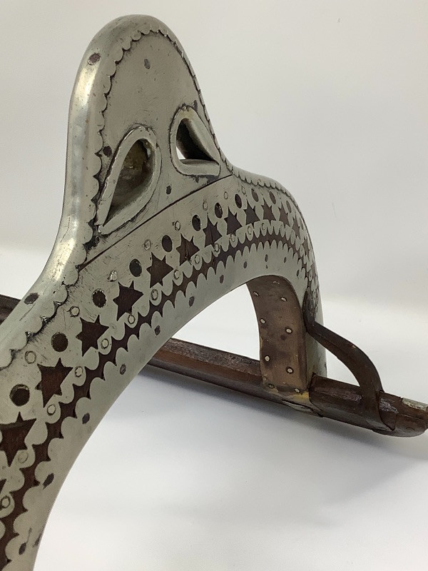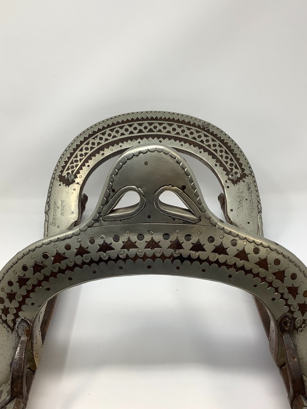 This elegant hand crafted antique horse saddle from the Middle East is made of metal, wood and is hand etched. Measures 13” x 19”