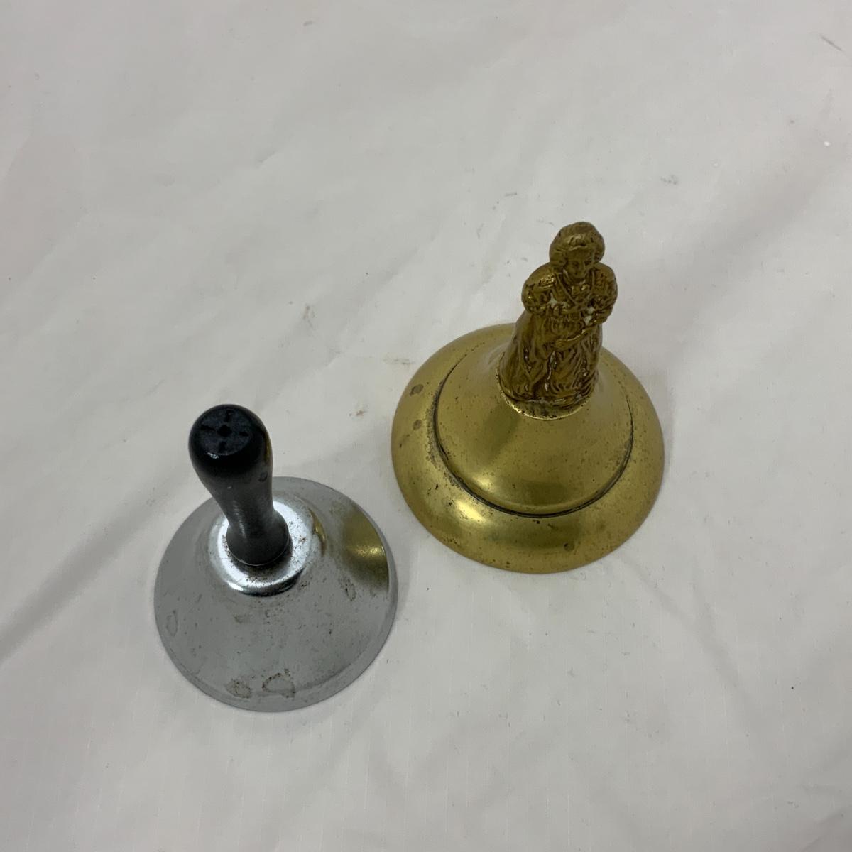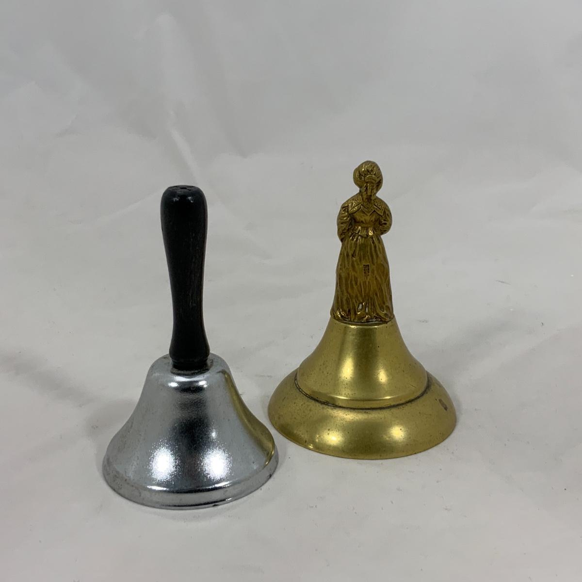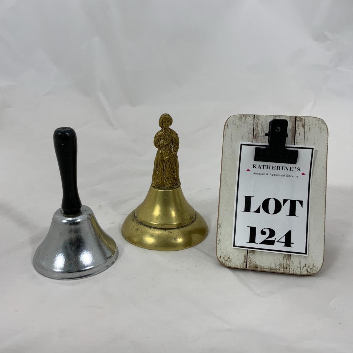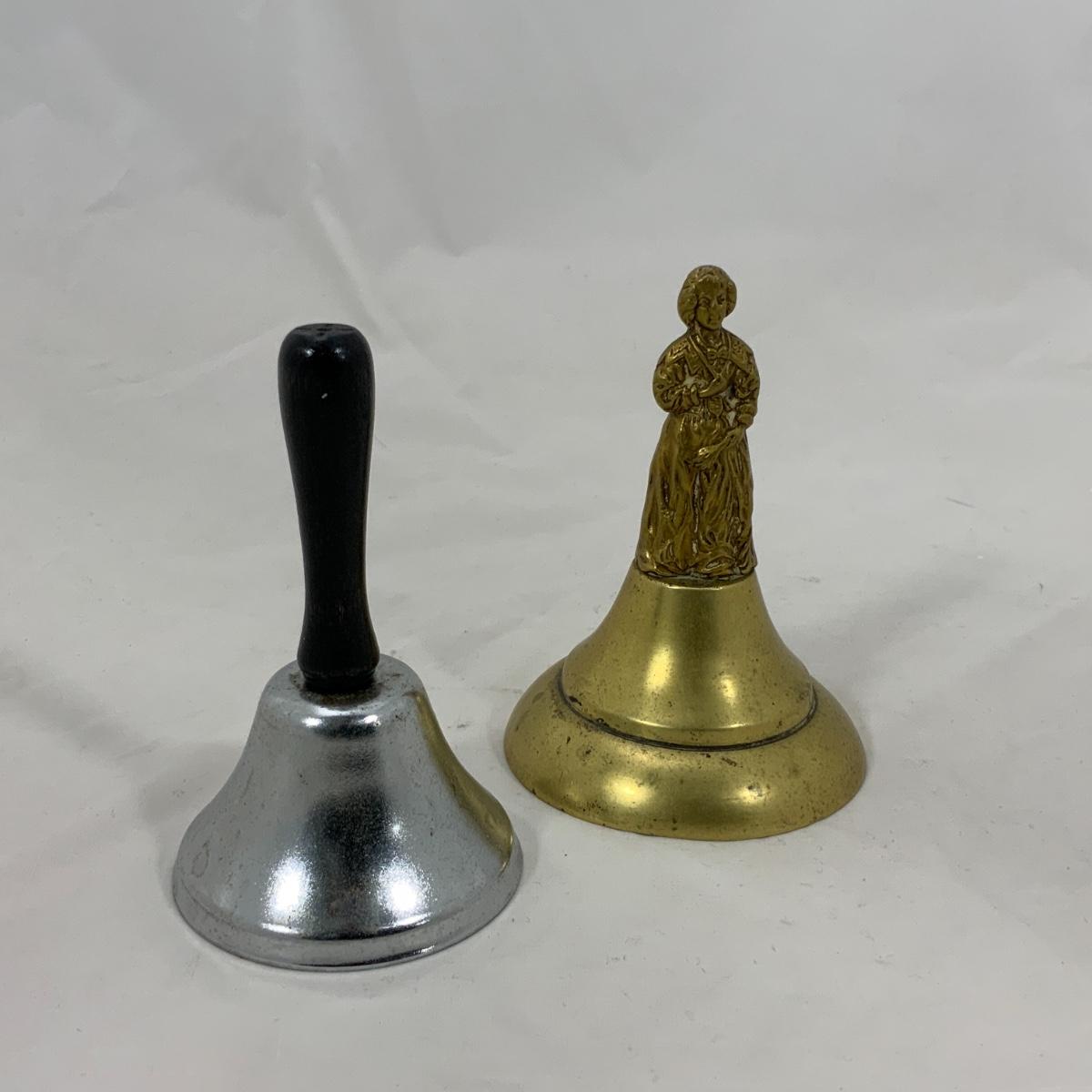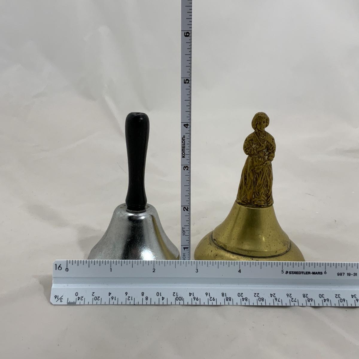From the Estate of Peter and Alice Radovanovich: Two bells. One School Bell or Call Bell for when someone is sick and a Brass Figural Bell. The brass bell has a replaced tongue. Please see photos for details and condition. ::: Shipping is NOT available on this lot. If you have any questions regarding this lot please contact the auctioneer either via this website, by direct email or by phone. PICK UP TIMES and other important information can be found in the TERMS and DESCRIPTION of the auction. Please take a look for pertinent information. Thanks!
