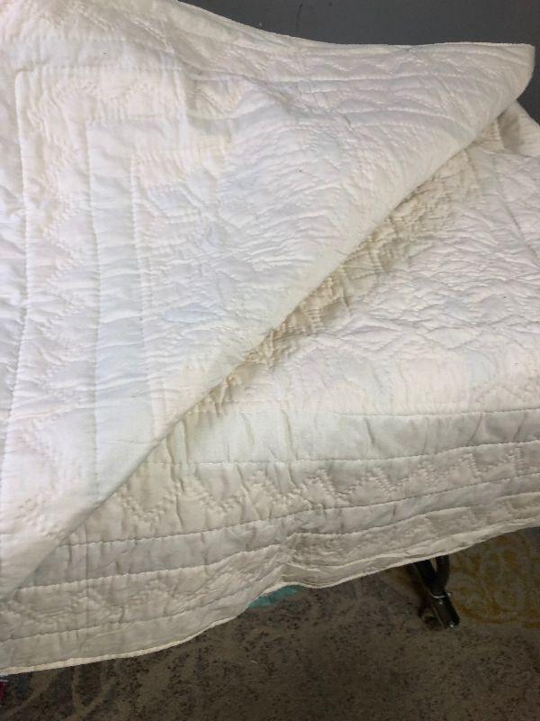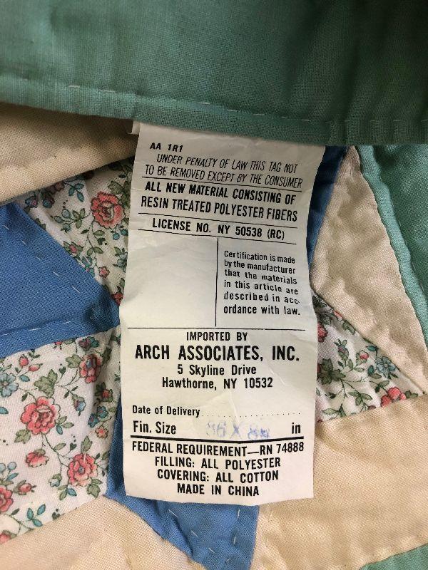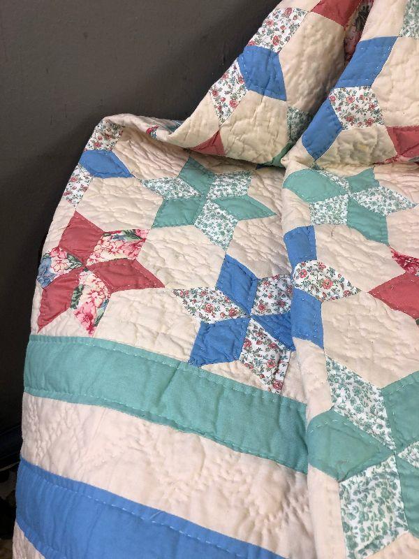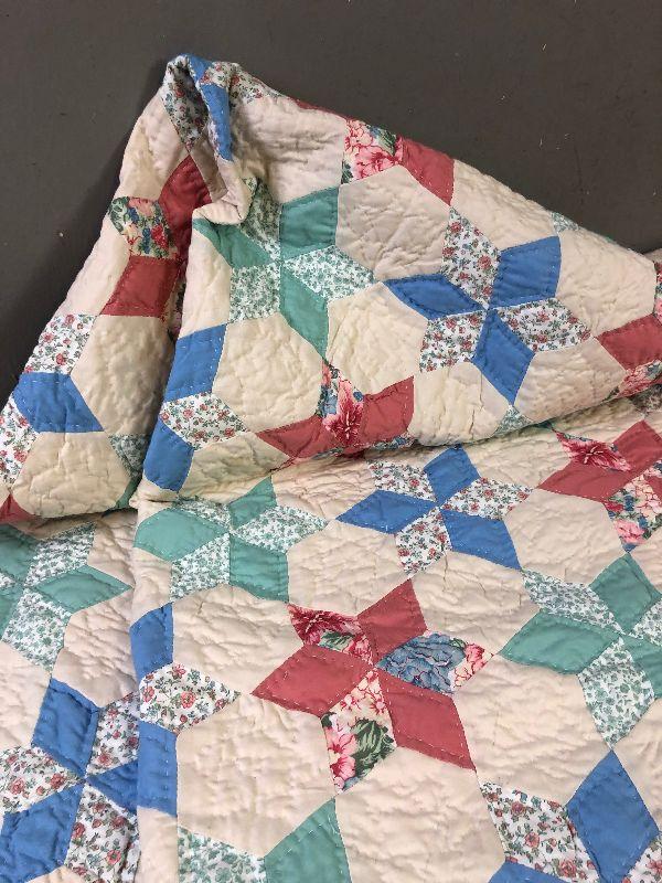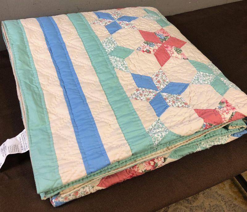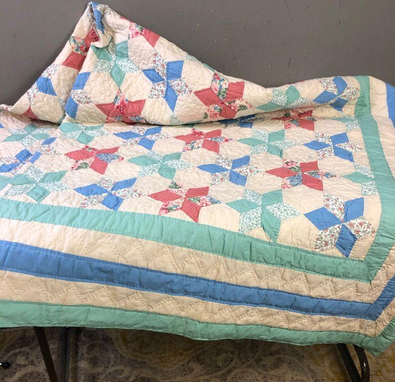 #124 Machine Quilt, Diamond Star Green, cream, blue