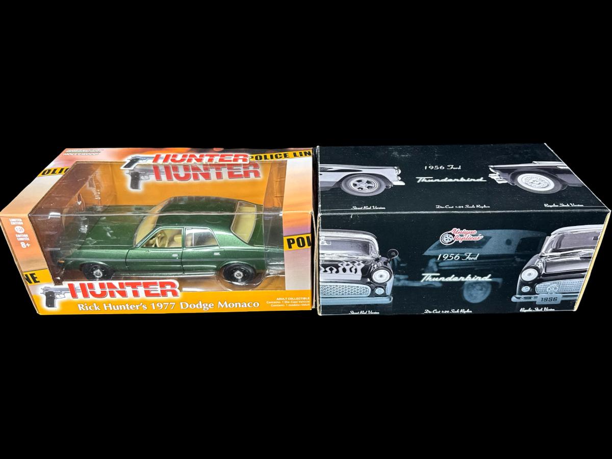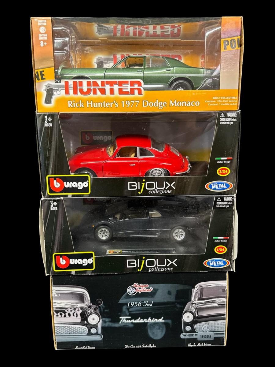 Includes a Burago Lamborghini Diablo, a Burago Porsche 356 B Cabriolet, a GreenLight Hunter 1977 Dodge Monaco, and a Unique Replicas 1956 Ford Thunderbird. Total of four pieces. In the original boxes.