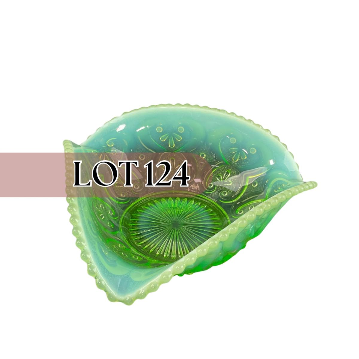 One vintage green triangle shaped opalescent bowl. I am Uranium glass so I DO GLOW under blacklight. This piece does have some scuffs, scratches, marks, or slight damage, but otherwise appears to be in great shape. Please see photos for details and condition. Any condition statement is given as a courtesy to a client, is an opinion, and should not be treated as a statement of fact. Reference to condition written, oral or within a condition report shall not be regarded as a full account of condition and may not include all defects, alterations, or restorations. Absence of a condition report does not imply a lot is flawless or lacking imperfections or damage. Katherine’s Auction & Appraisal Service shall have no responsibility for any error or omission. Returns shall not be accepted on the basis of condition. ::: Shipping is available on this lot. If you require shipping you must let us know at the close of the auction. We will coordinate with you after the item has been won. Shipping fees will include insurance up to or exceeding the value of all items being mailed. If you have any questions regarding this lot please contact the auctioneer either via this website, by direct email or by phone. PICK UP TIMES and other important information can be found in the TERMS and DESCRIPTION of the auction. Please take a look for pertinent information. Thanks!