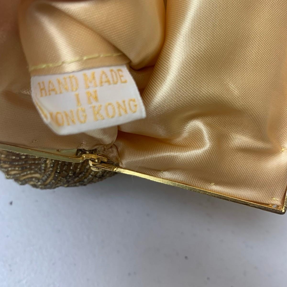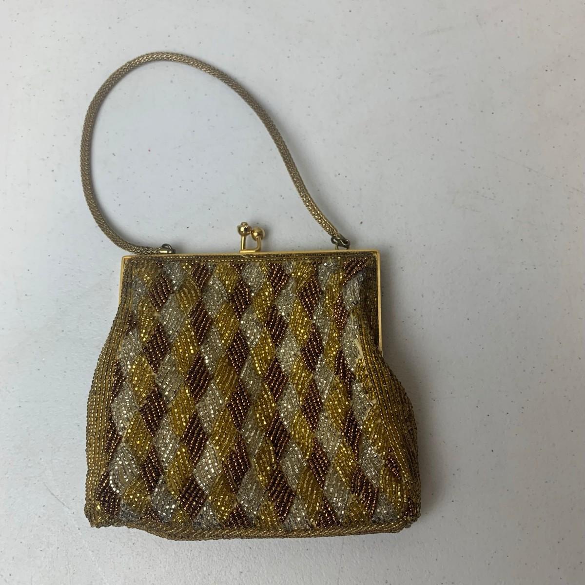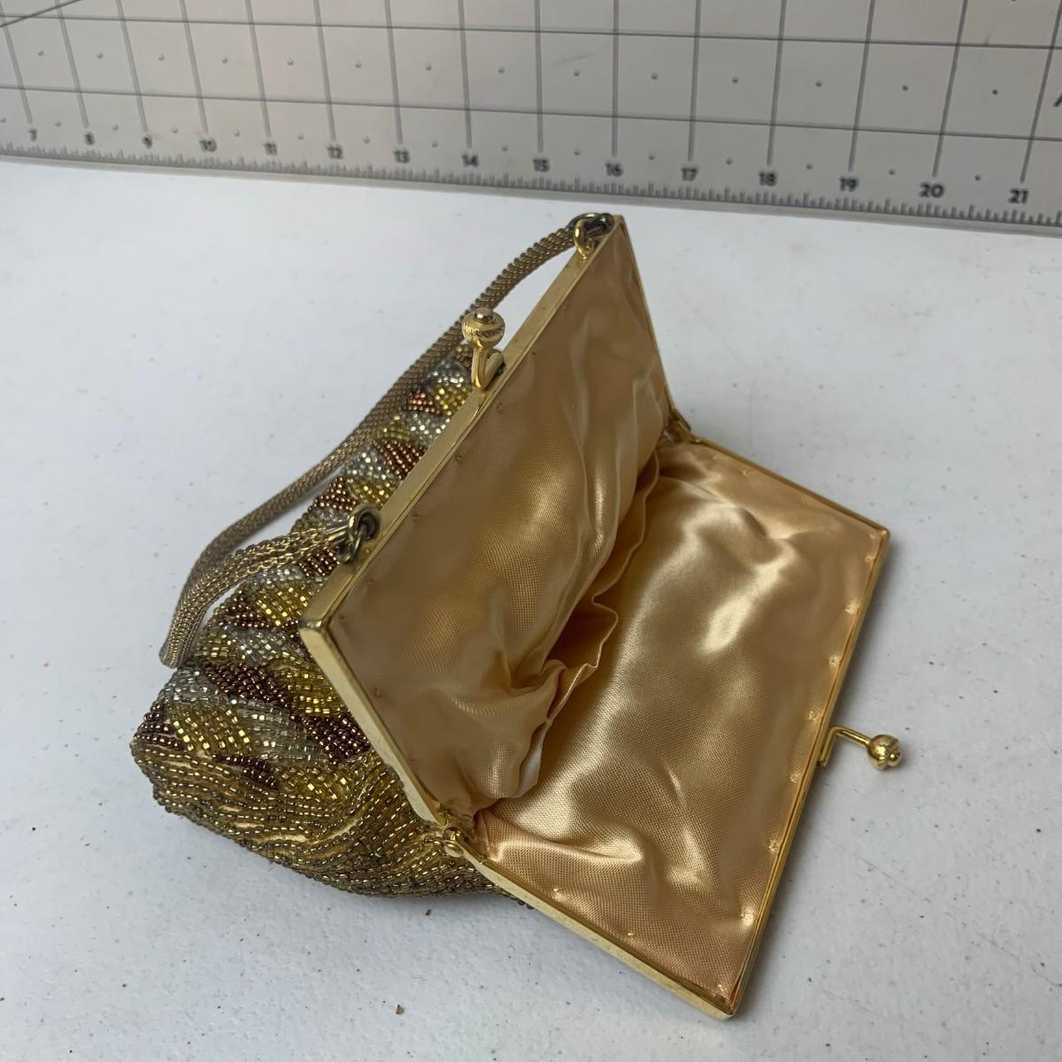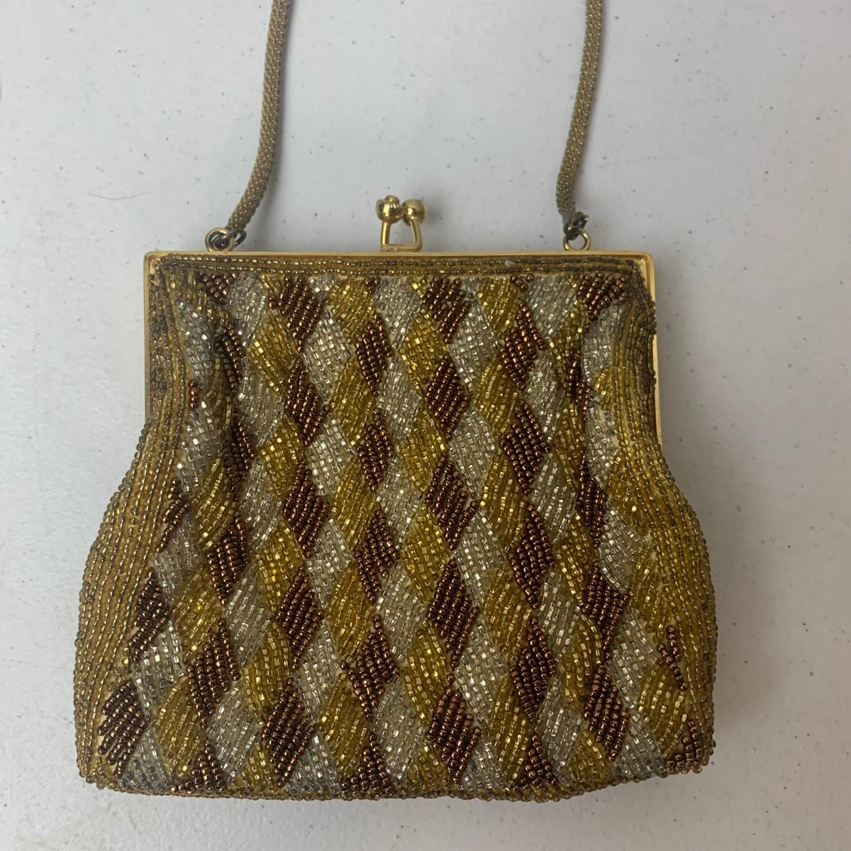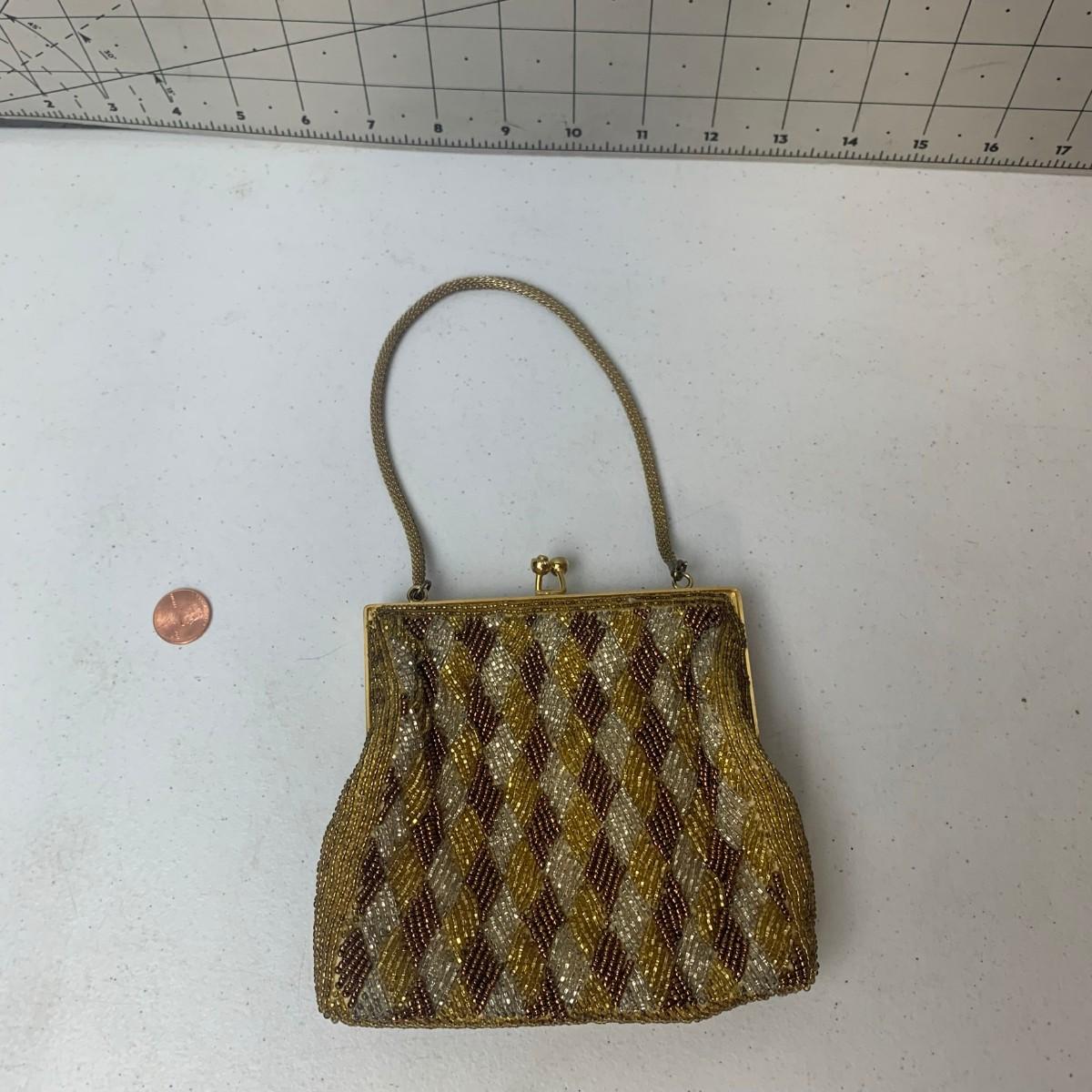 #124 Vintage Beaded Purse Gold & Brown Made In Hong Kong