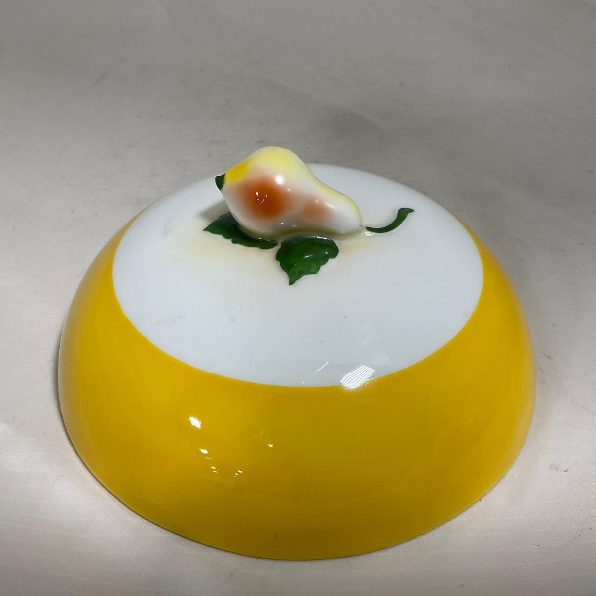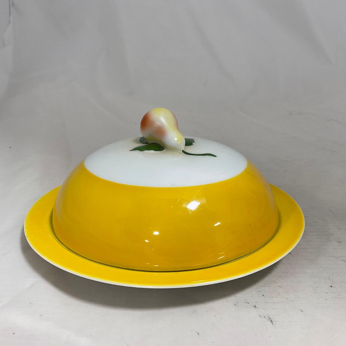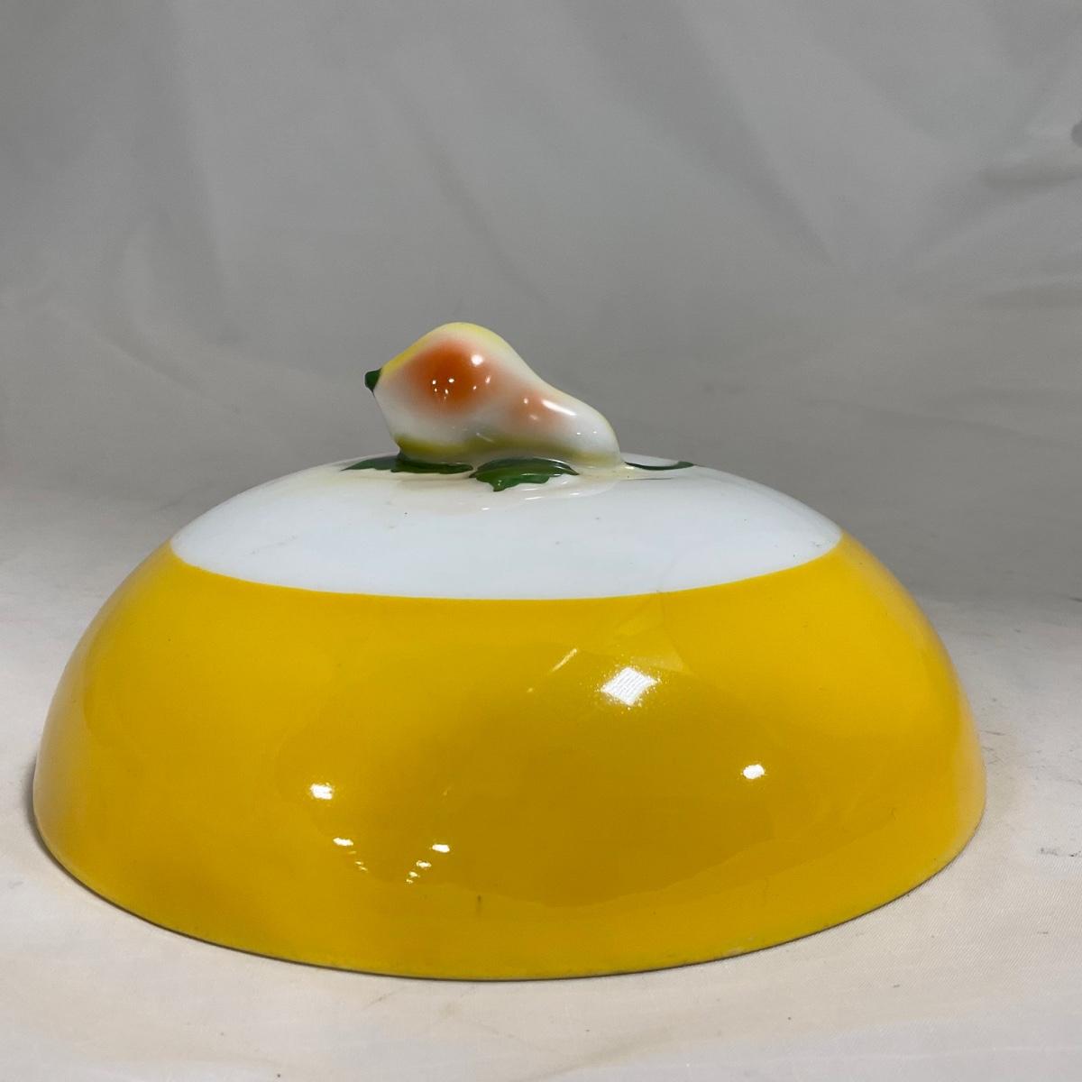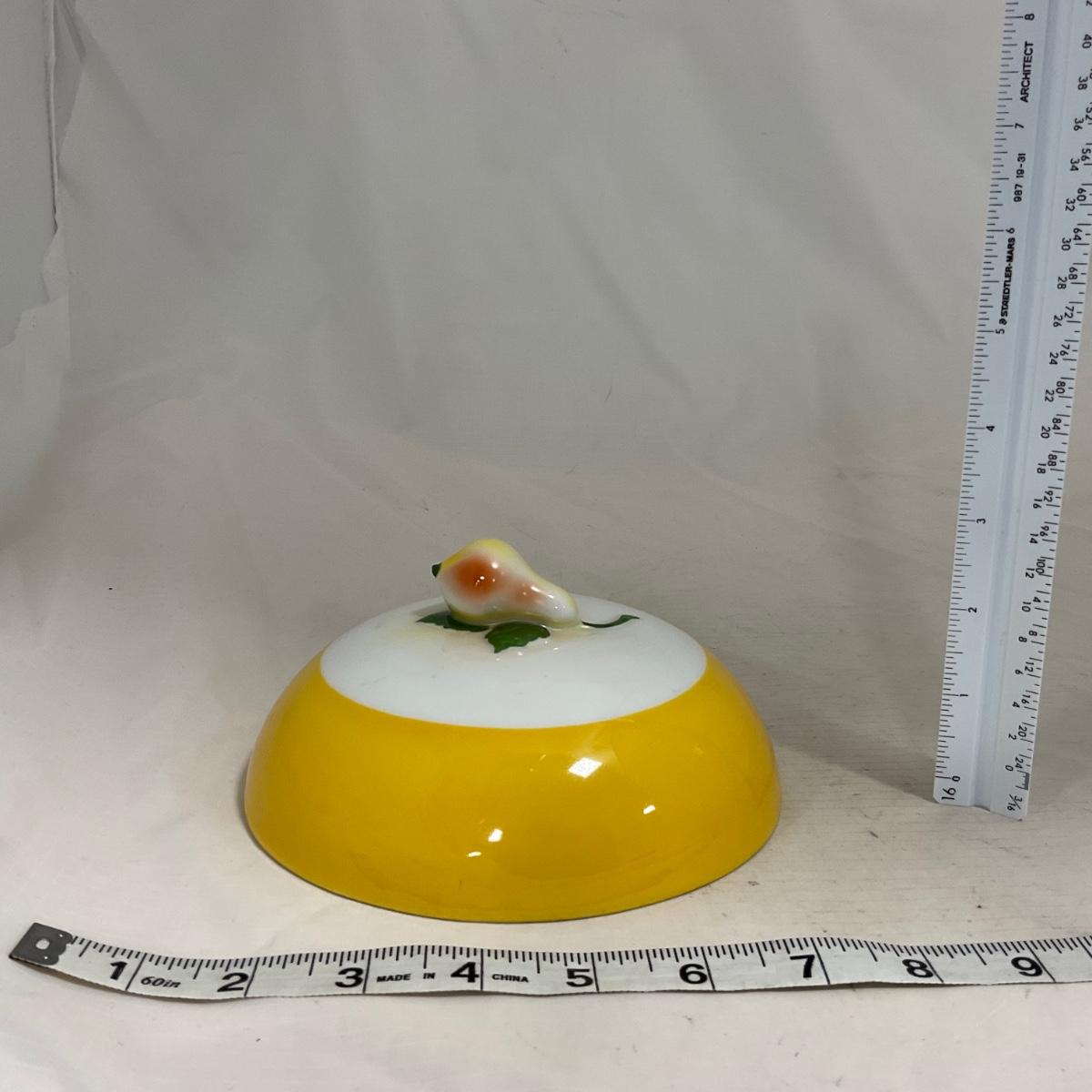 One white with yellow accent covered butter dish with and beautifully topped finial of a “🦆. Pear? Or fruit veggie of some kind! This bright butter dish is the perfect eye catcher for your dinning room table. This piece is well loved and has some coloring fading. Please see photos for details and condition. ::: Shipping is available on this lot. If you require shipping you must let us know at the close of the auction. We will coordinate with you after the item has been won. Shipping fees will include insurance up to or exceeding the value of all items being mailed. If you have any questions regarding this lot please contact the auctioneer either via this website, by direct email or by phone. PICK UP TIMES and other important information can be found in the TERMS and DESCRIPTION of the auction. Please take a look for pertinent information. Thanks!