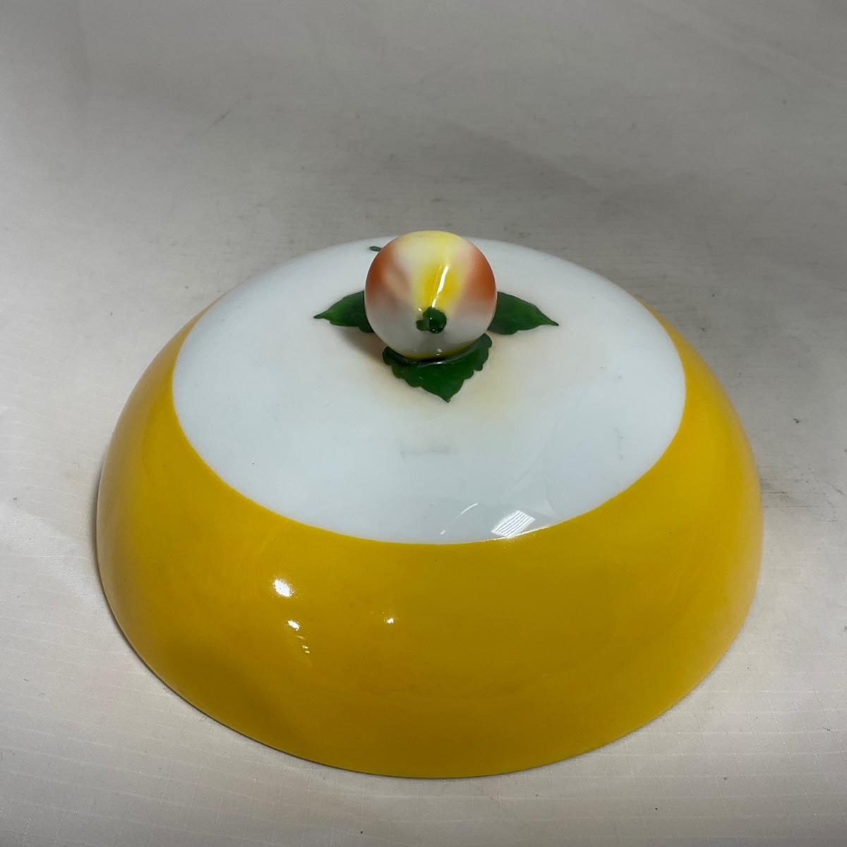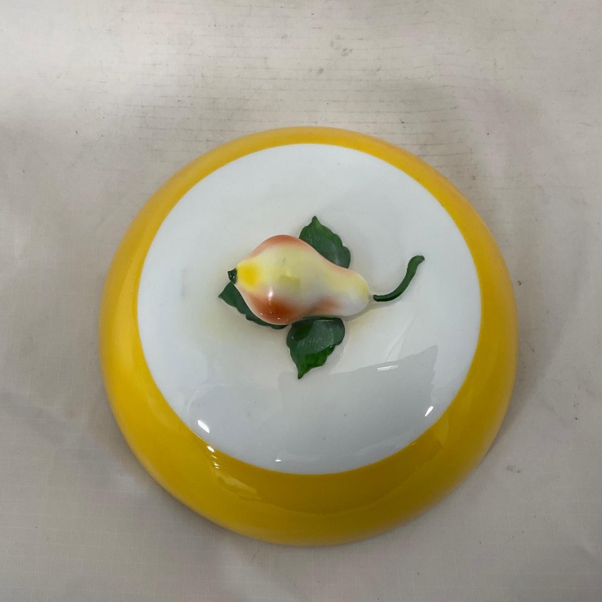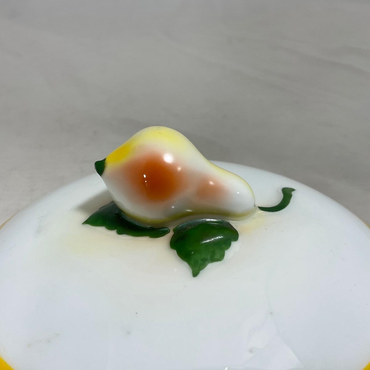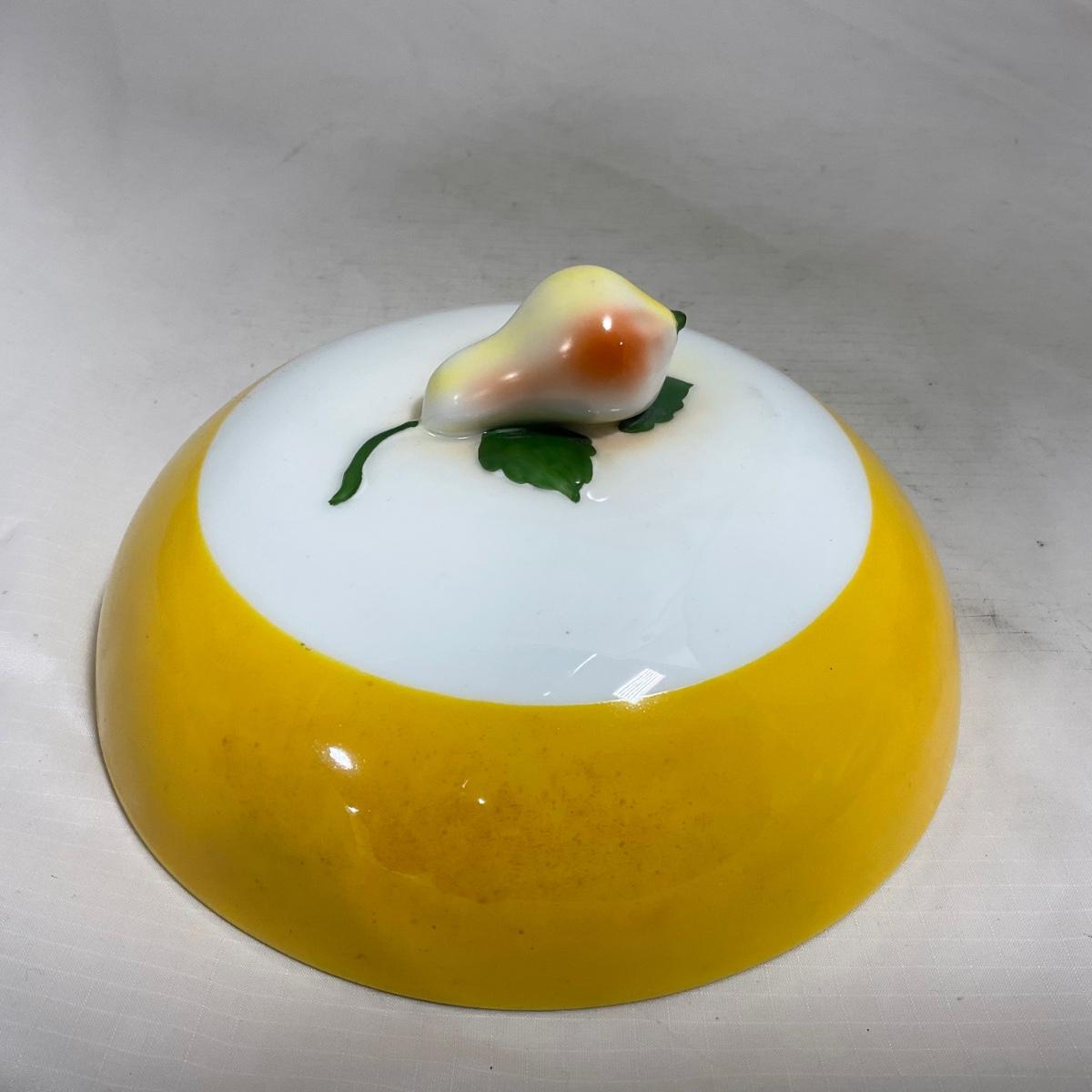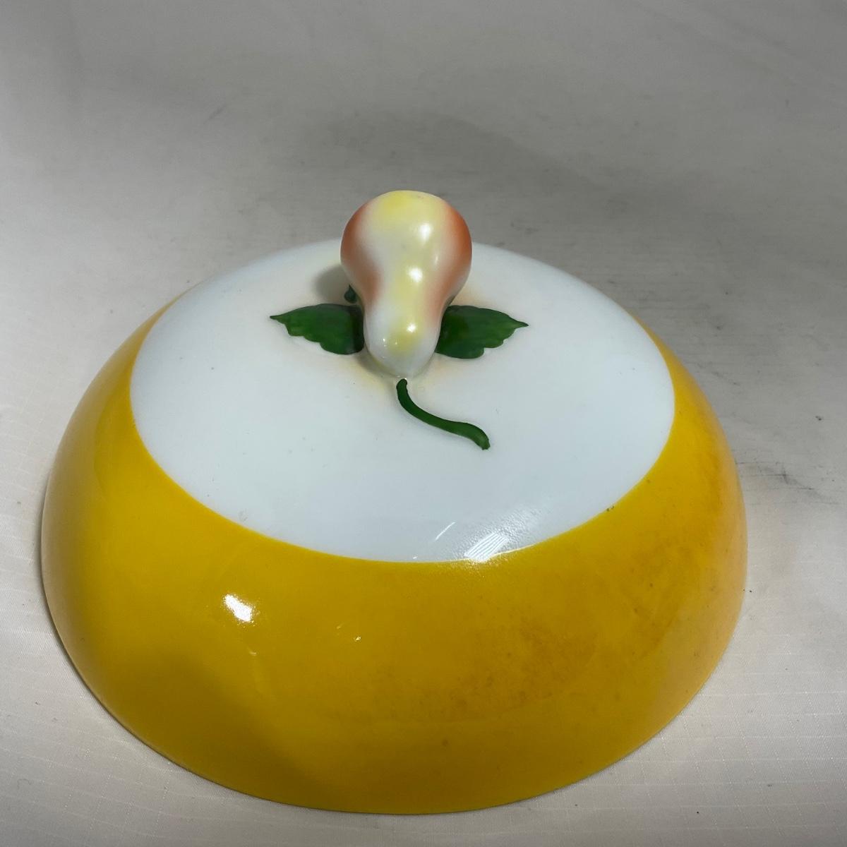 One white with yellow accent covered butter dish with and beautifully topped finial of a “🦆. Pear? Or fruit veggie of some kind! This bright butter dish is the perfect eye catcher for your dinning room table. This piece is well loved and has some coloring fading. Please see photos for details and condition. ::: Shipping is available on this lot. If you require shipping you must let us know at the close of the auction. We will coordinate with you after the item has been won. Shipping fees will include insurance up to or exceeding the value of all items being mailed. If you have any questions regarding this lot please contact the auctioneer either via this website, by direct email or by phone. PICK UP TIMES and other important information can be found in the TERMS and DESCRIPTION of the auction. Please take a look for pertinent information. Thanks!