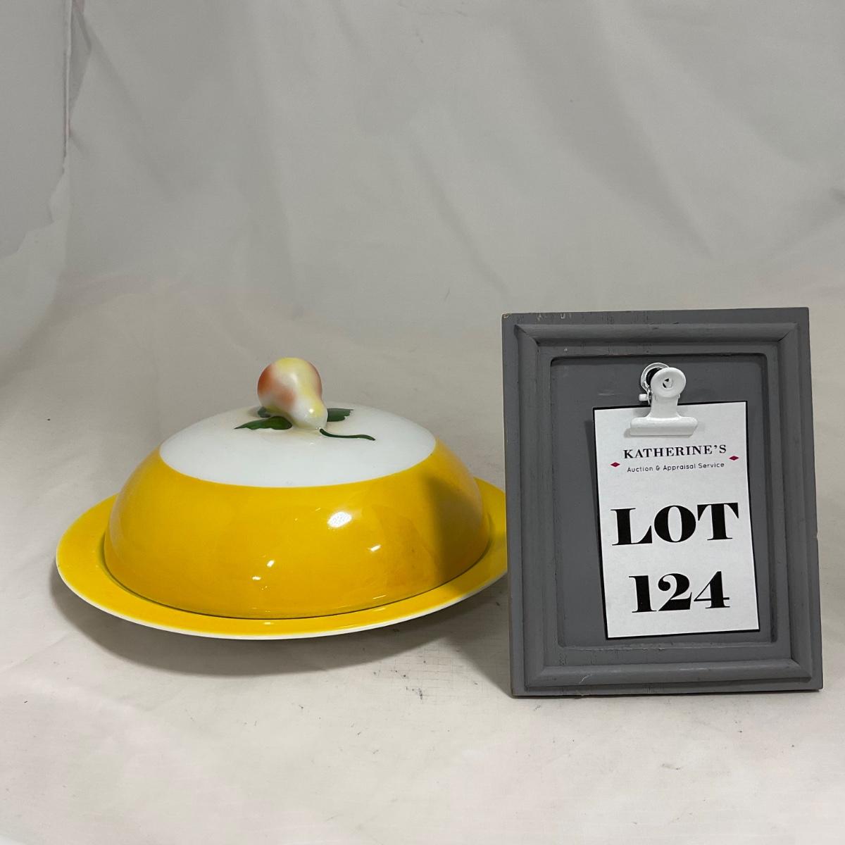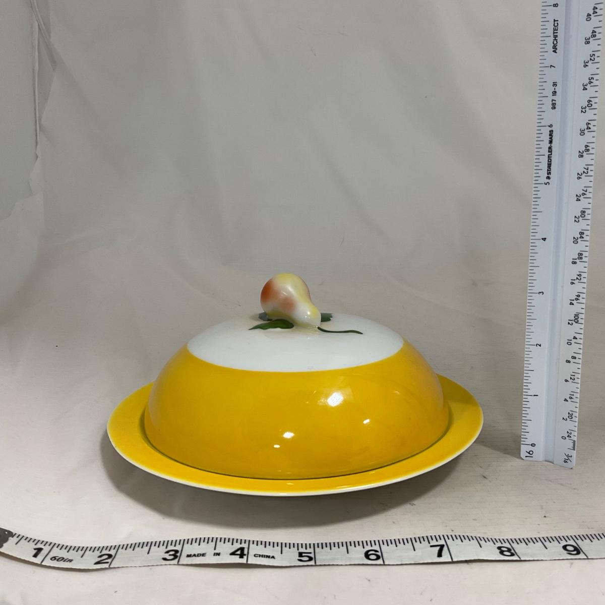 -124- White & Yellow | Pear Finial | Marked | Covered Butter Dish