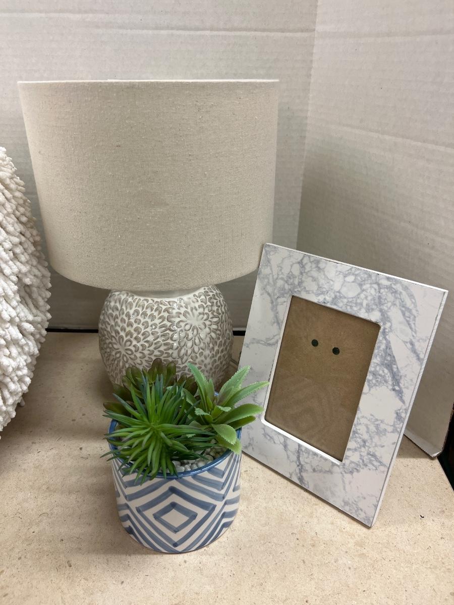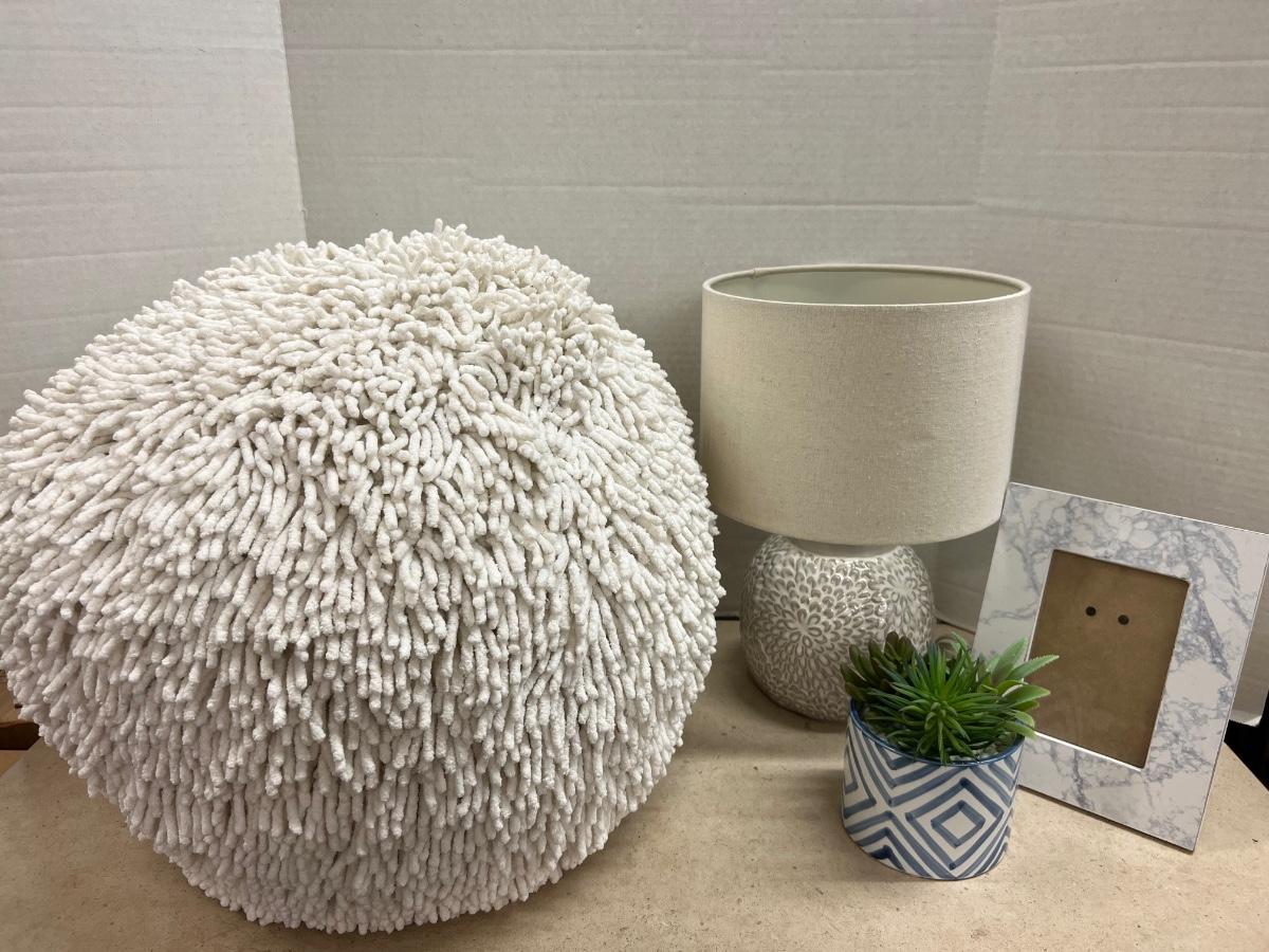White ottoman with ceramic white lamp, faux marble picture frame and faux succulent decor