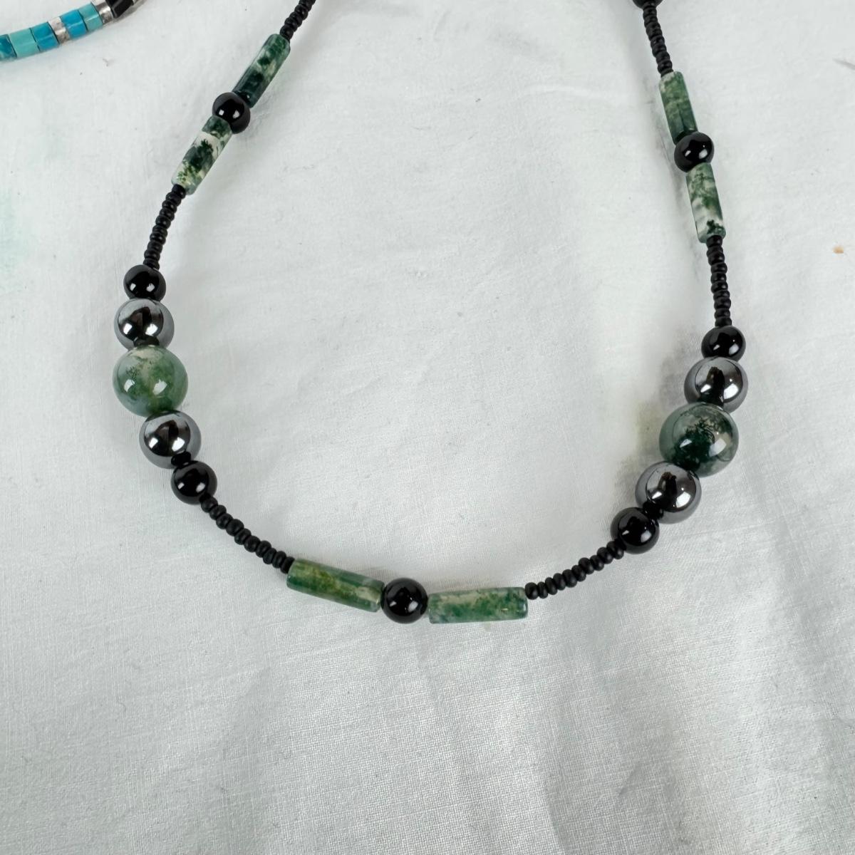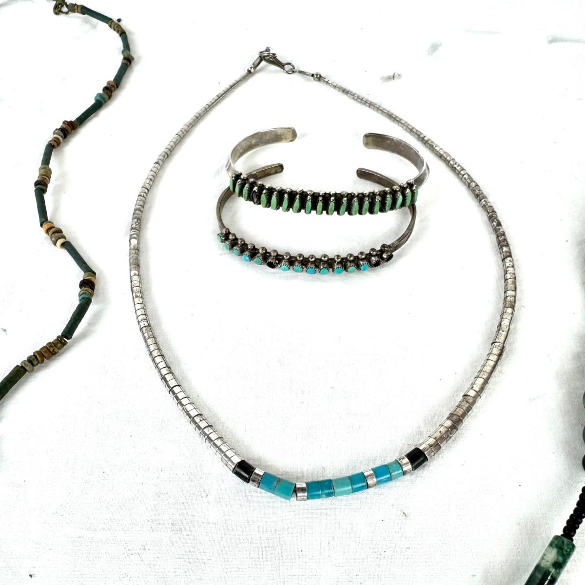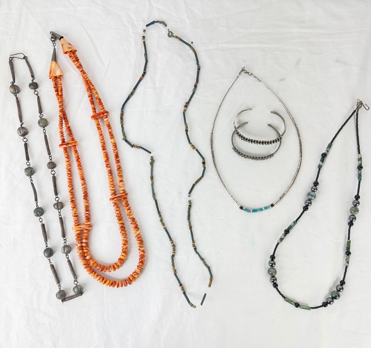 various length shell, stone, necklaces with two silver cuff bracelets and stones, (some missing)