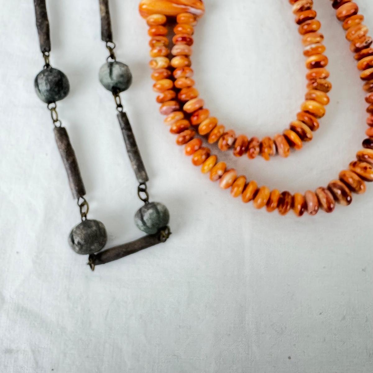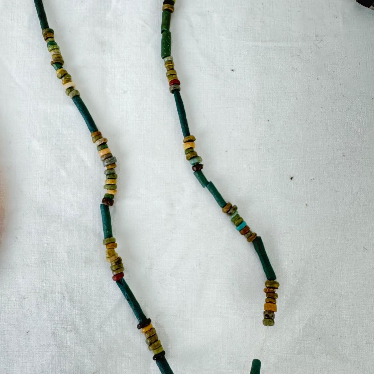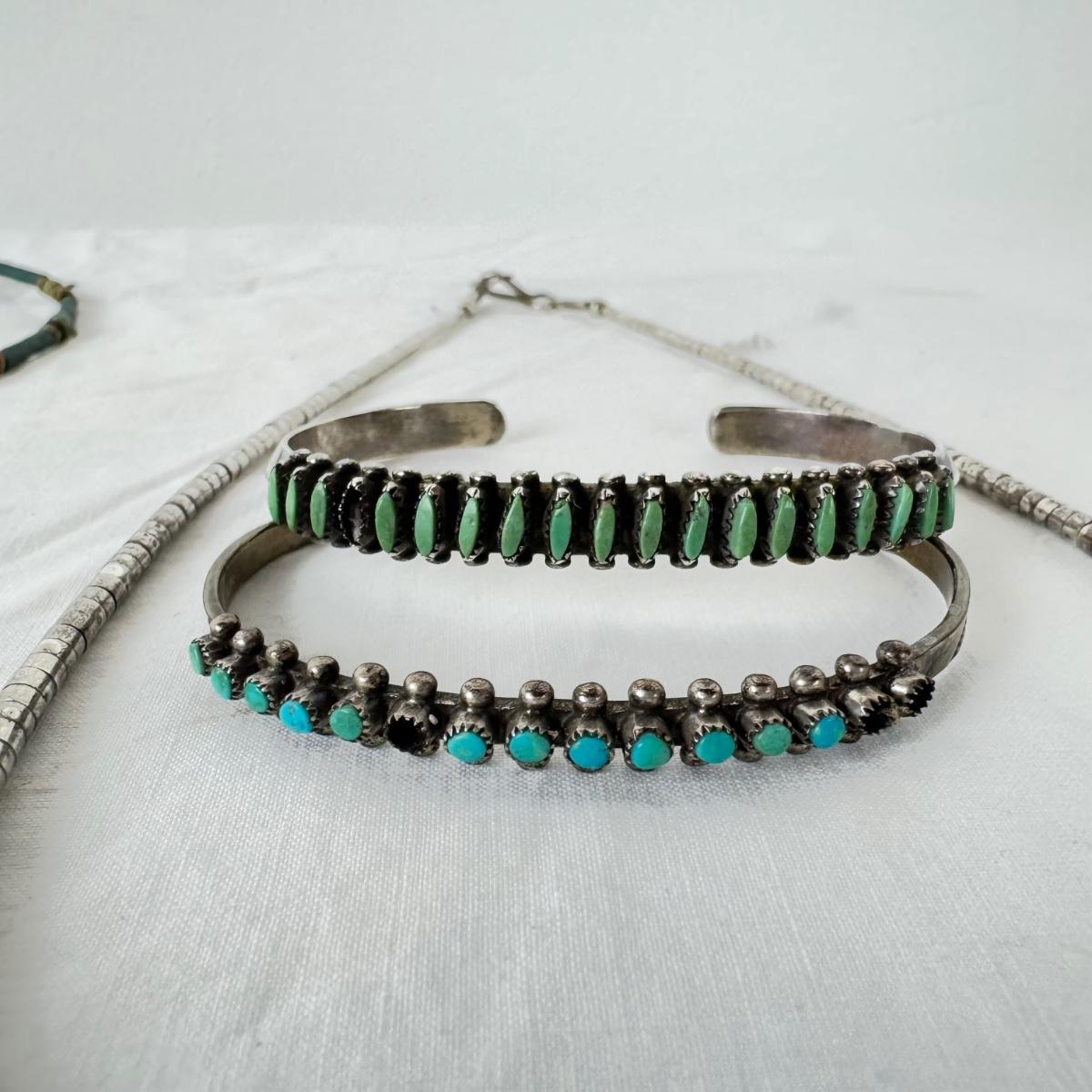 various length shell, stone, necklaces with two silver cuff bracelets and stones, (some missing)