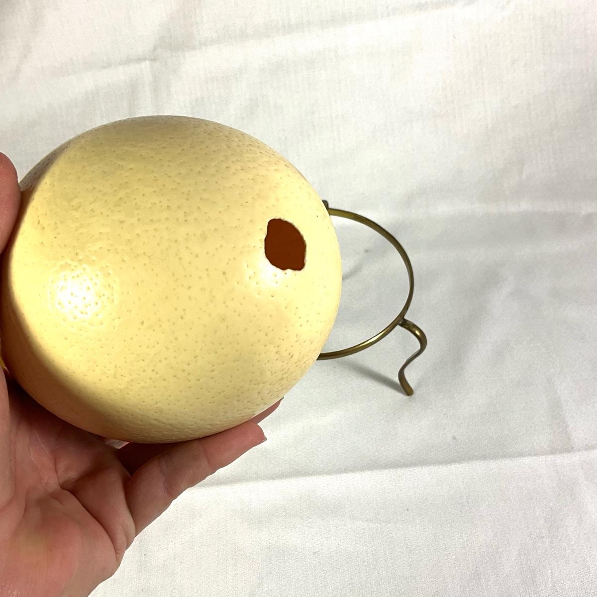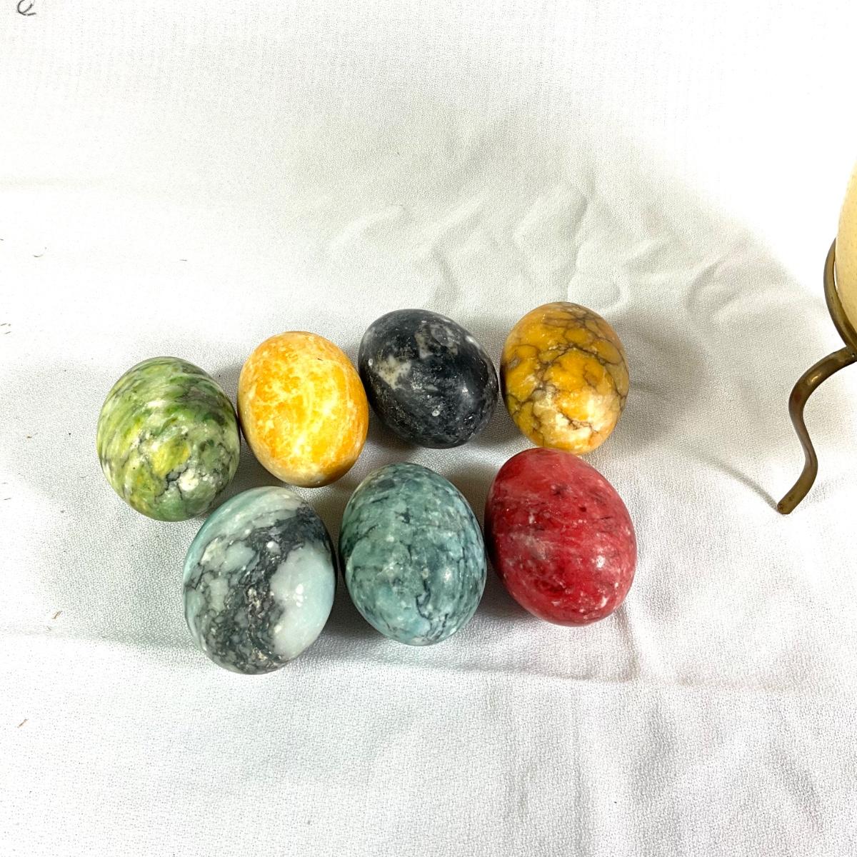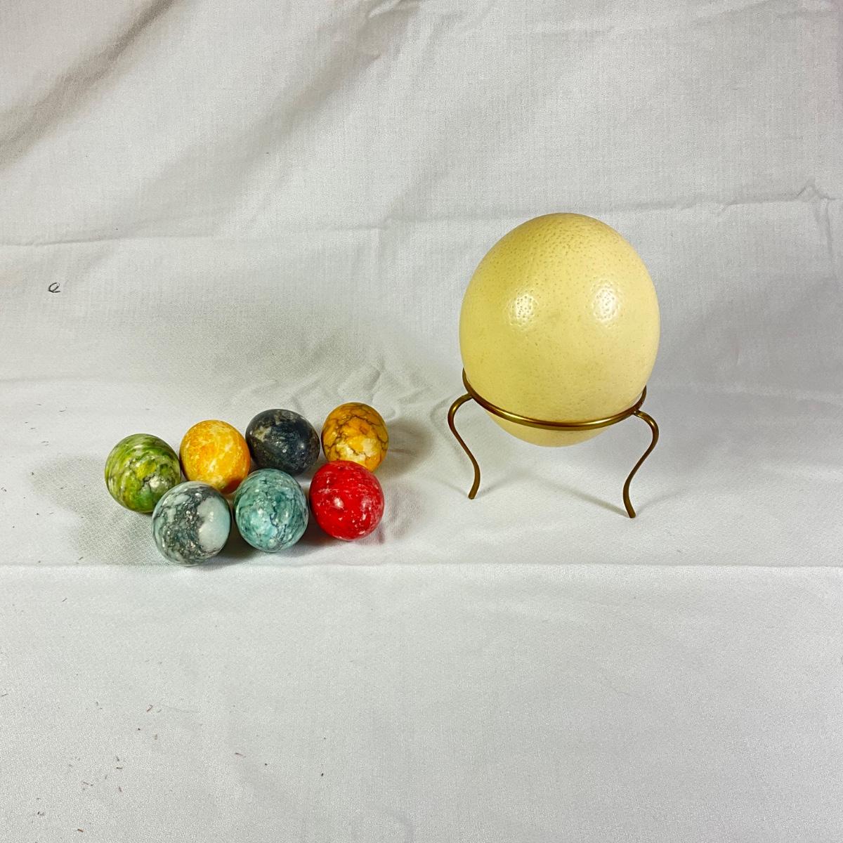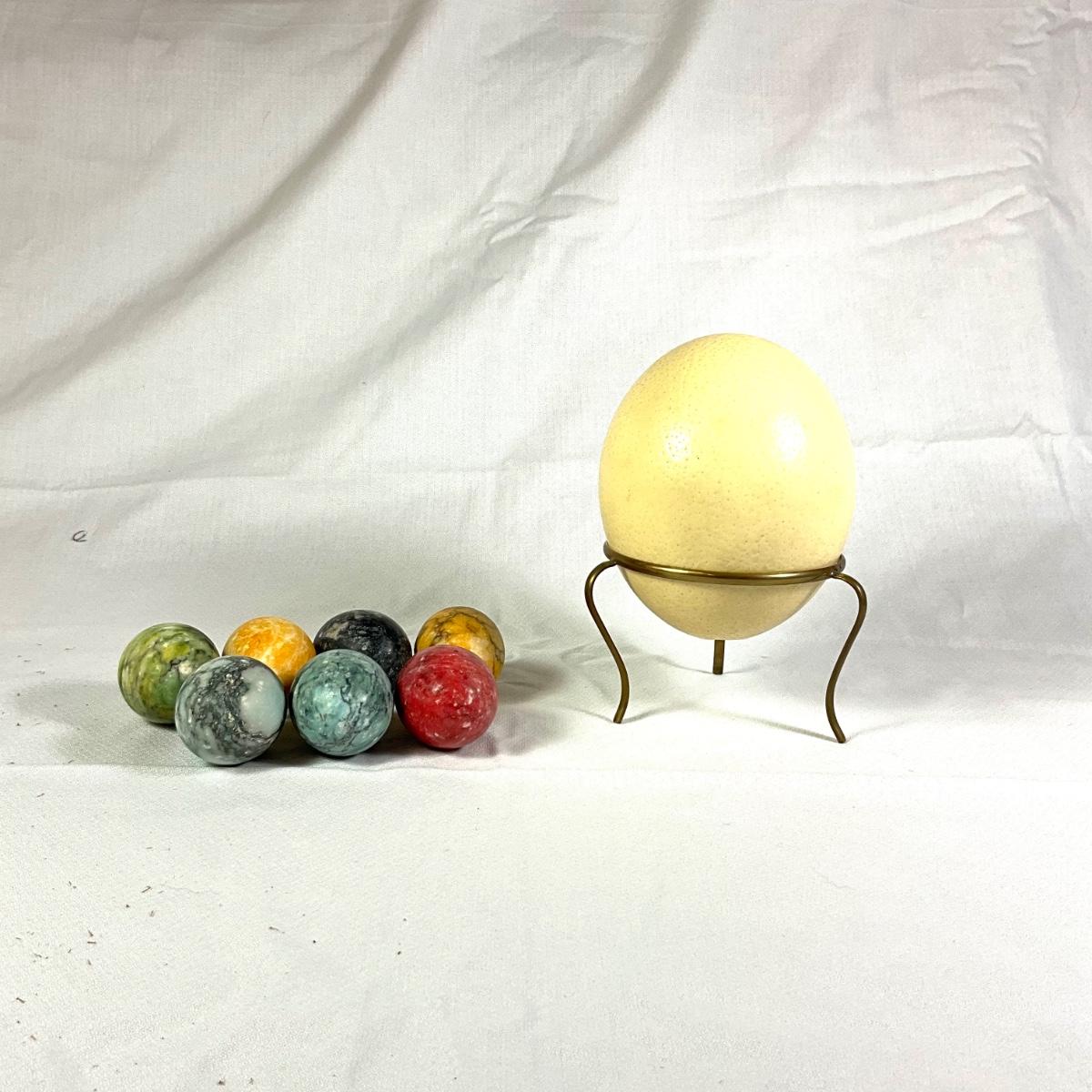 1245 Vintage Ostrich Egg on Stand with 7 Colored Marble Eggs