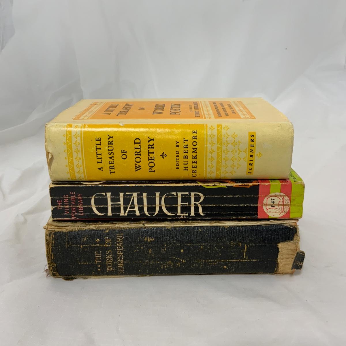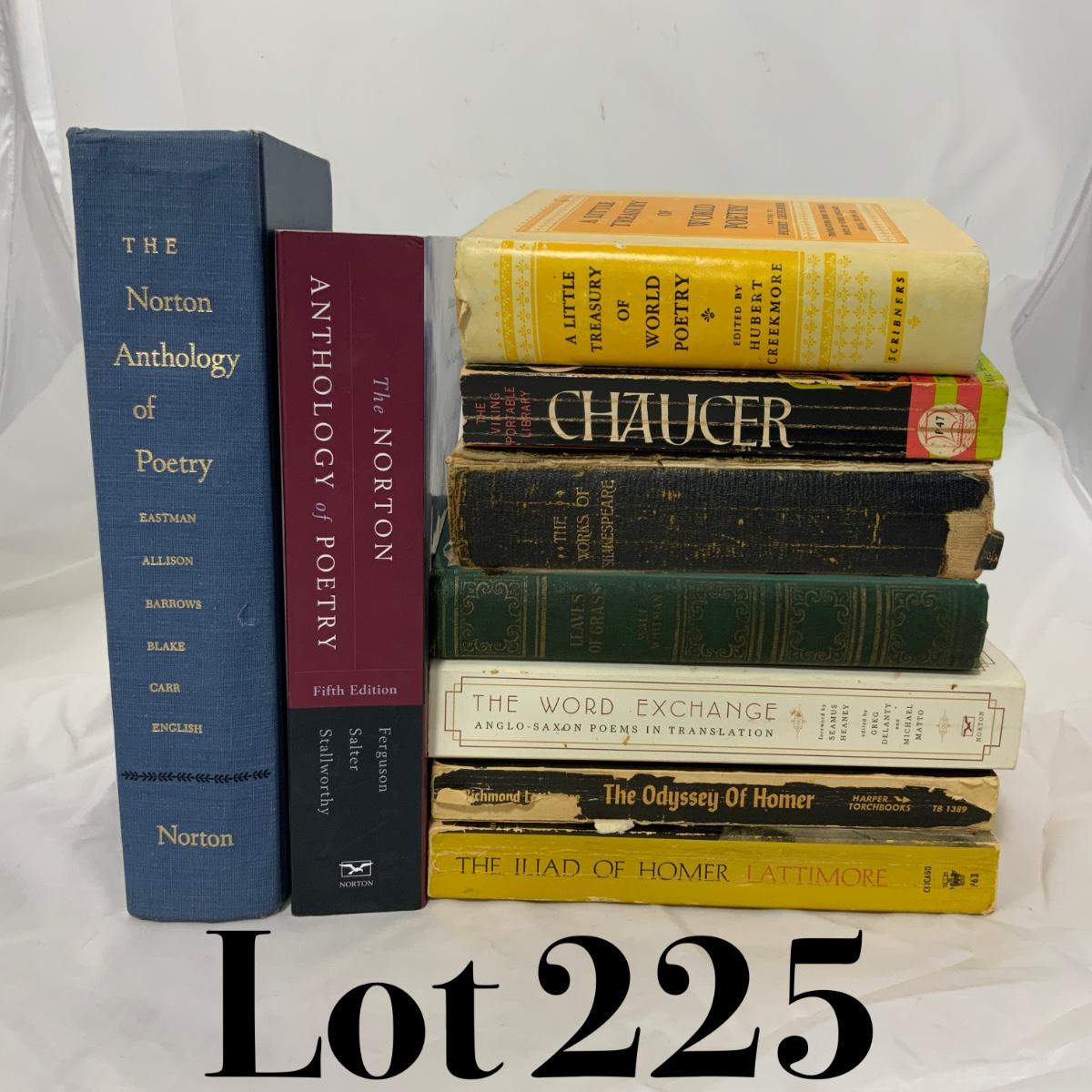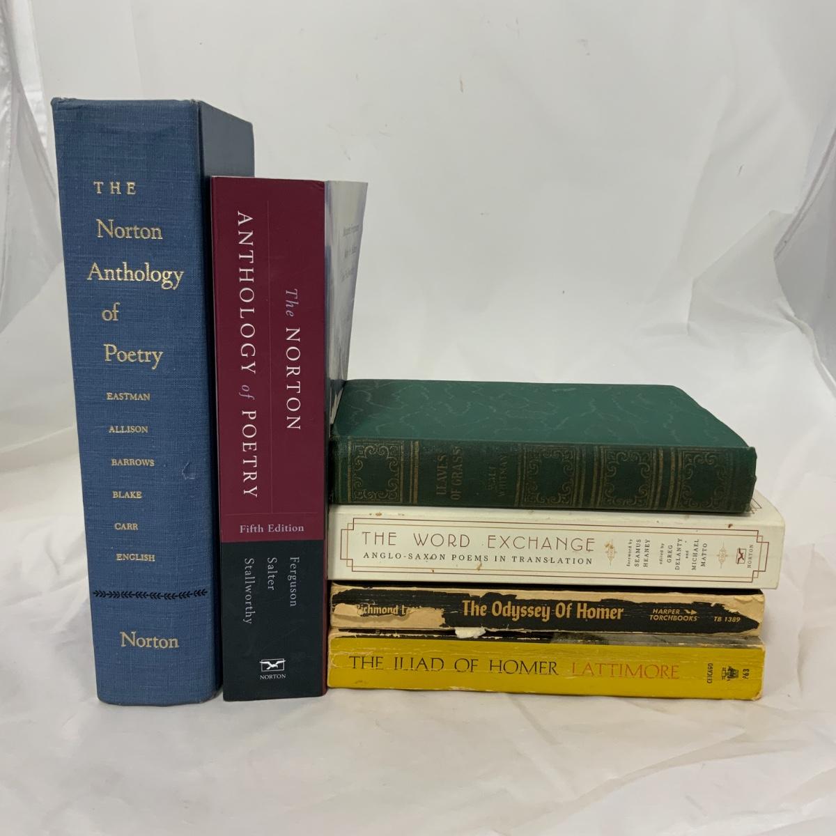 From the Estate of Peter and Alice Radovanovich: Three Poetry Books. Books included are: The Complete Works of Shakespeare | The Portable Chaucer | A Little Treasury of World Poetry edited by Hubert Creekmore. Books are in poor to fair used condition. // Six Poetry Books. Books included are: The Norton Anthology of Poetry, 5th and 1st editions | Iliad of Homer | The Odyssey of Homer | The Word Exchange edited by Greg Delanty and Michael Matto | Leaves of Grass by Walt Whitman. Books are in fair to excellent condition. Please see photos for details and condition. ::: Shipping is available on this lot. If you require shipping you must let us know at the close of the auction. We will coordinate with you after the item has been won. Shipping fees will include insurance up to or exceeding the value of all items being mailed. If you have any questions regarding this lot please contact the auctioneer either via this website, by direct email or by phone. PICK UP TIMES and other important information can be found in the TERMS and DESCRIPTION of the auction. Please take a look for pertinent information. Thanks!