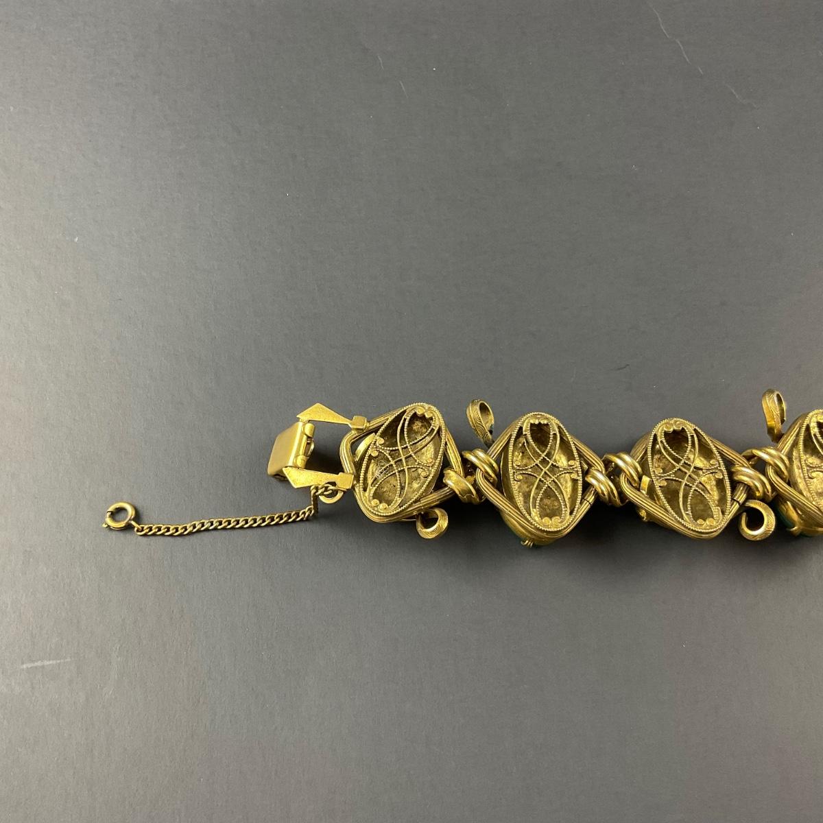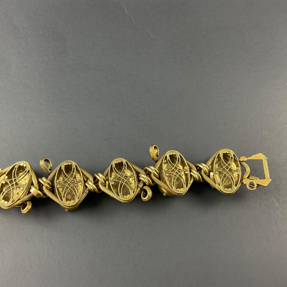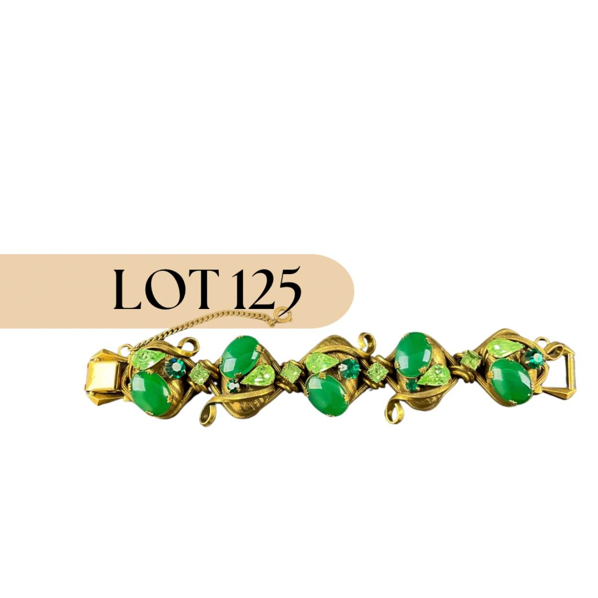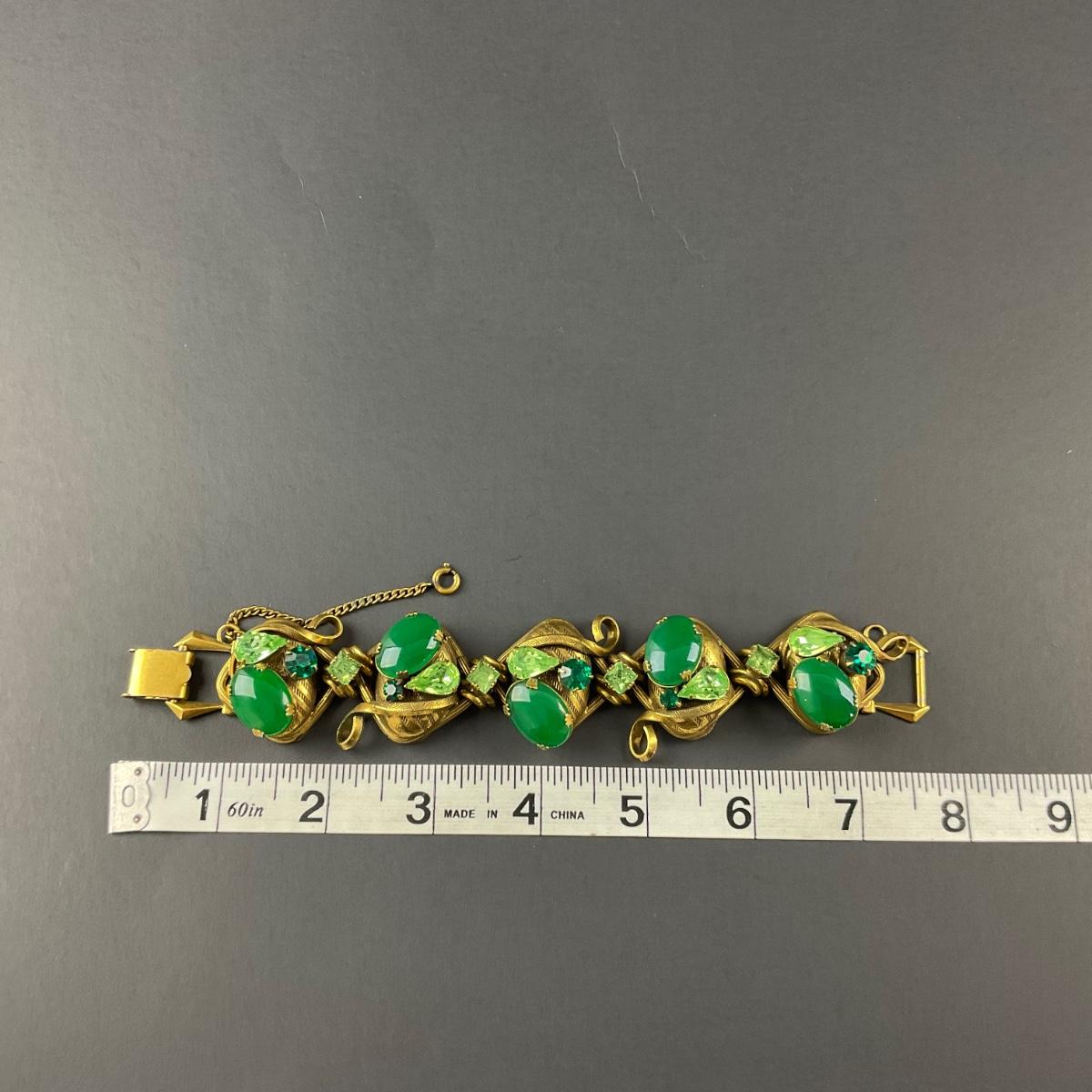 One vintage believed to be but unmarked and not guaranteed Henkel & Gross for Dior 1950’s chunky jade stone bracelet. This piece does have some scuffs, scratches, marks, or slight damage, but otherwise appears to be in great shape. Please see photos for details and condition. Any condition statement is given as a courtesy to a client, is an opinion, and should not be treated as a statement of fact. Reference to condition written, oral or within a condition report shall not be regarded as a full account of condition and may not include all defects, alterations, or restorations. Absence of a condition report does not imply a lot is flawless or lacking imperfections or damage. Katherine’s Auction & Appraisal Service shall have no responsibility for any error or omission. Returns shall not be accepted on the basis of condition. ::: Shipping is available on this lot. If you require shipping you must let us know at the close of the auction. We will coordinate with you after the item has been won. Shipping fees will include insurance up to or exceeding the value of all items being mailed. If you have any questions regarding this lot please contact the auctioneer either via this website, by direct email or by phone. PICK UP TIMES and other important information can be found in the TERMS and DESCRIPTION of the auction. Please take a look for pertinent information. Thanks!