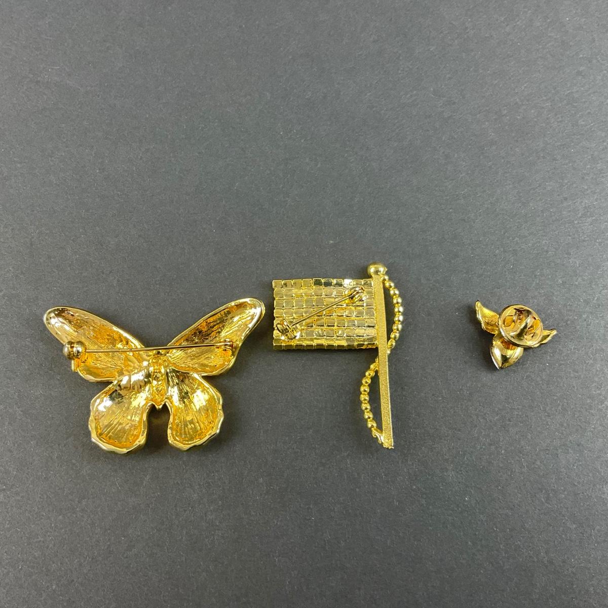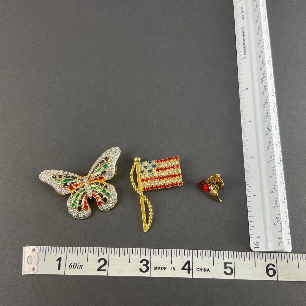 Three decorative pins including one American red, white, and blue rhinestone patriotic pin. One Avon angel pin, and one unmarked butterfly pin (damage to the butterfly pin missing antennas). Please see photos for details and condition. Any condition statement is given as a courtesy to a client, is an opinion, and should not be treated as a statement of fact. Reference to condition written, oral or within a condition report shall not be regarded as a full account of condition and may not include all defects, alterations, or restorations. Absence of a condition report does not imply a lot is flawless or lacking imperfections or damage. Katherine’s Auction & Appraisal Service shall have no responsibility for any error or omission. Returns shall not be accepted on the basis of condition. ::: Shipping is available on this lot. If you require shipping you must let us know at the close of the auction. We will coordinate with you after the item has been won. Shipping fees will include insurance up to or exceeding the value of all items being mailed. If you have any questions regarding this lot please contact the auctioneer either via this website, by direct email or by phone. PICK UP TIMES and other important information can be found in the TERMS and DESCRIPTION of the auction. Please take a look for pertinent information. Thanks!