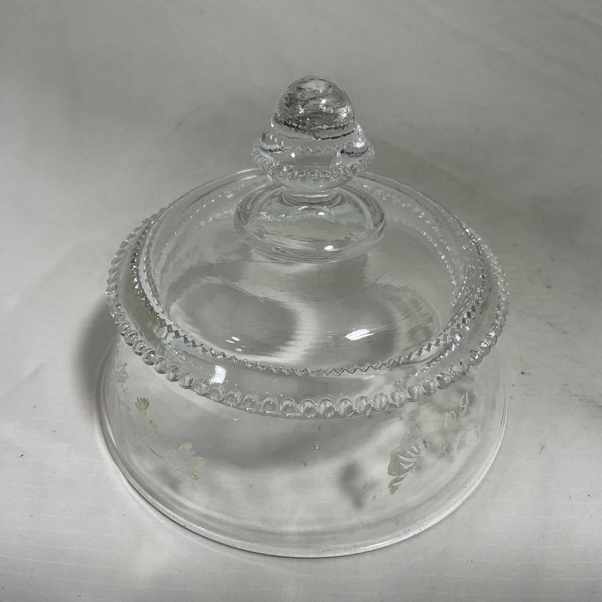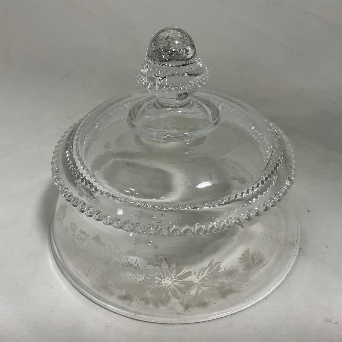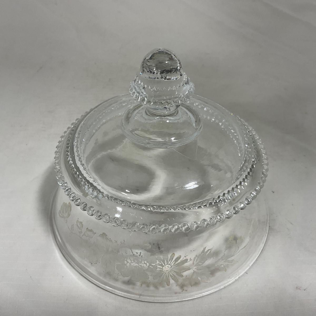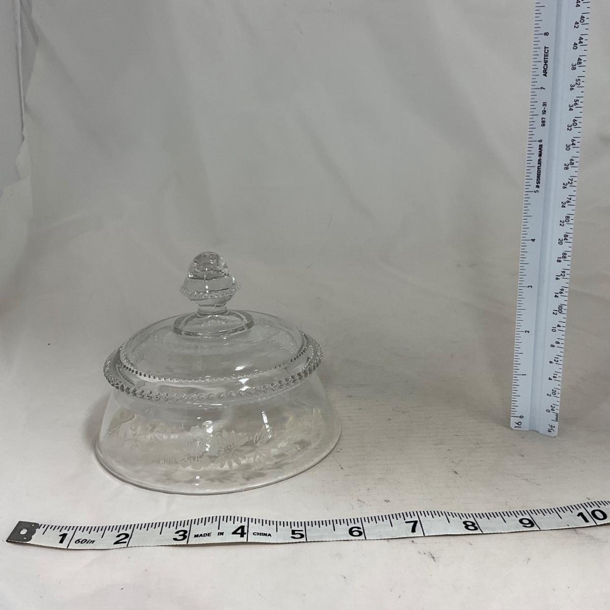 -126- Clear Glass & Floral | Marked | Covered Butter Dish