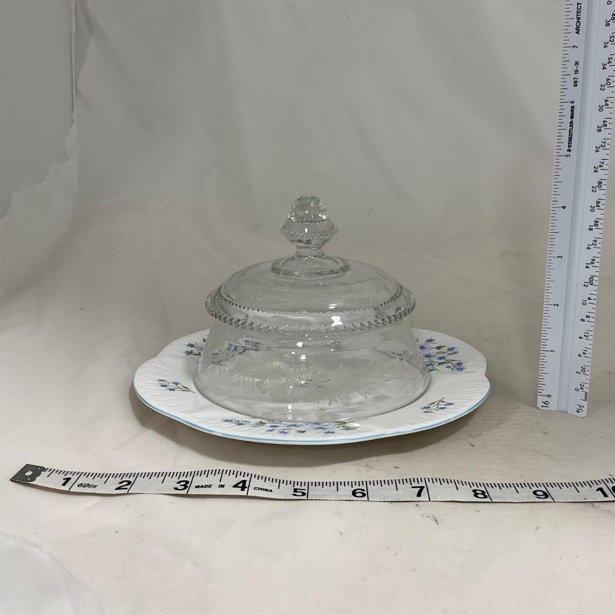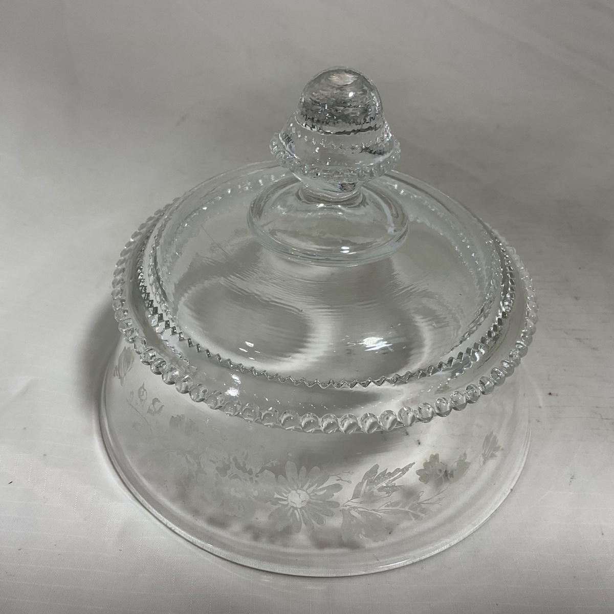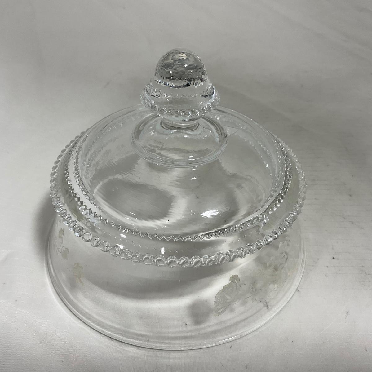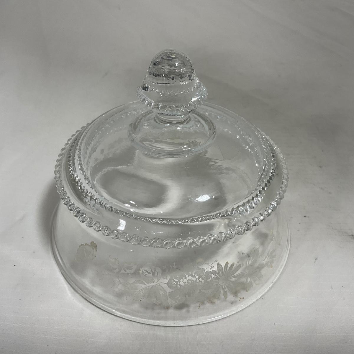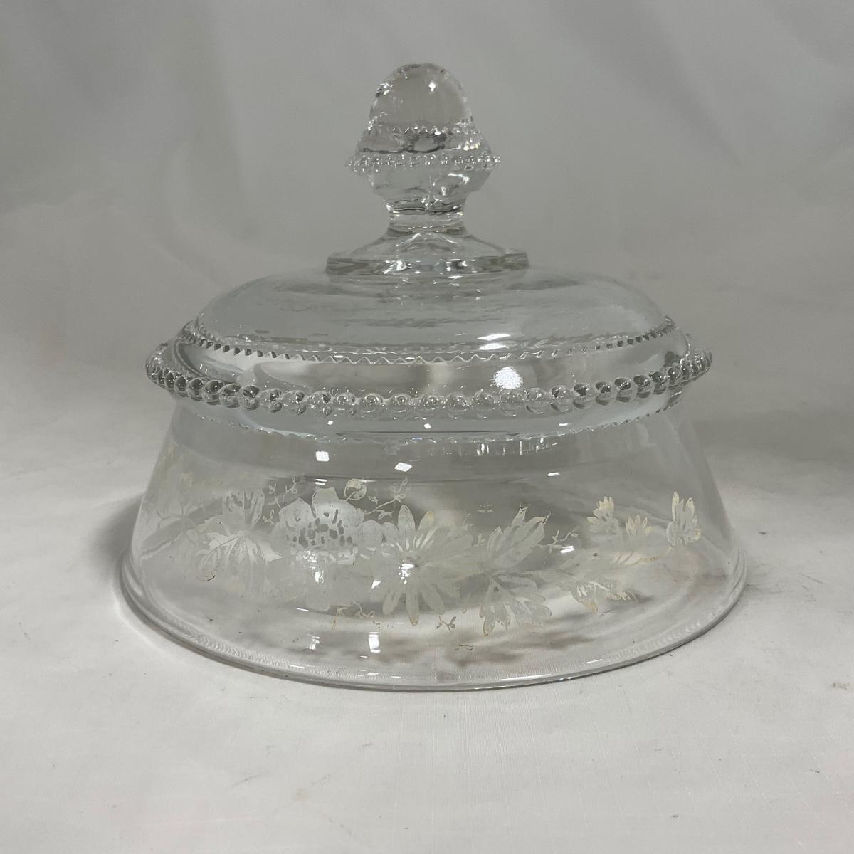 -126- Clear Glass & Floral | Marked | Covered Butter Dish