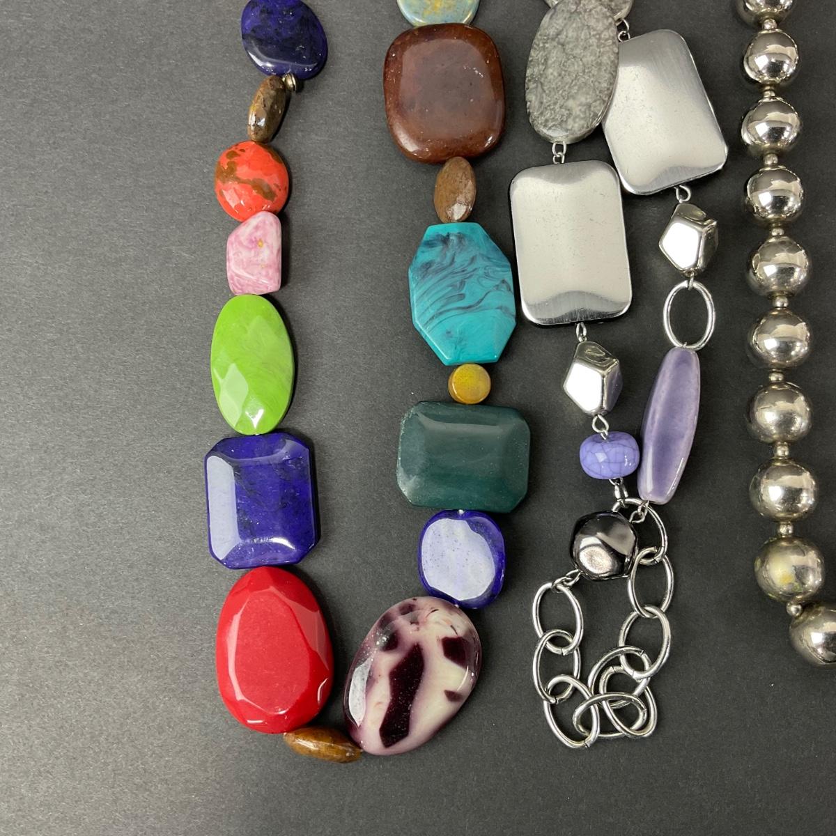 Assortment of seven costume jewelry necklaces. Please see photos for details and condition. Any condition statement is given as a courtesy to a client, is an opinion, and should not be treated as a statement of fact. Reference to condition written, oral or within a condition report shall not be regarded as a full account of condition and may not include all defects, alterations, or restorations. Absence of a condition report does not imply a lot is flawless or lacking imperfections or damage. Katherine’s Auction & Appraisal Service shall have no responsibility for any error or omission. Returns shall not be accepted on the basis of condition. ::: Shipping is available on this lot. If you require shipping you must let us know at the close of the auction. We will coordinate with you after the item has been won. Shipping fees will include insurance up to or exceeding the value of all items being mailed. If you have any questions regarding this lot please contact the auctioneer either via this website, by direct email or by phone. PICK UP TIMES and other important information can be found in the TERMS and DESCRIPTION of the auction. Please take a look for pertinent information. Thanks!