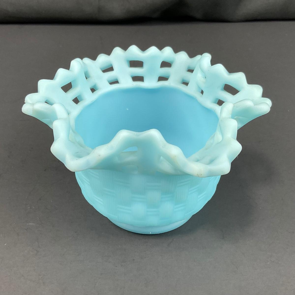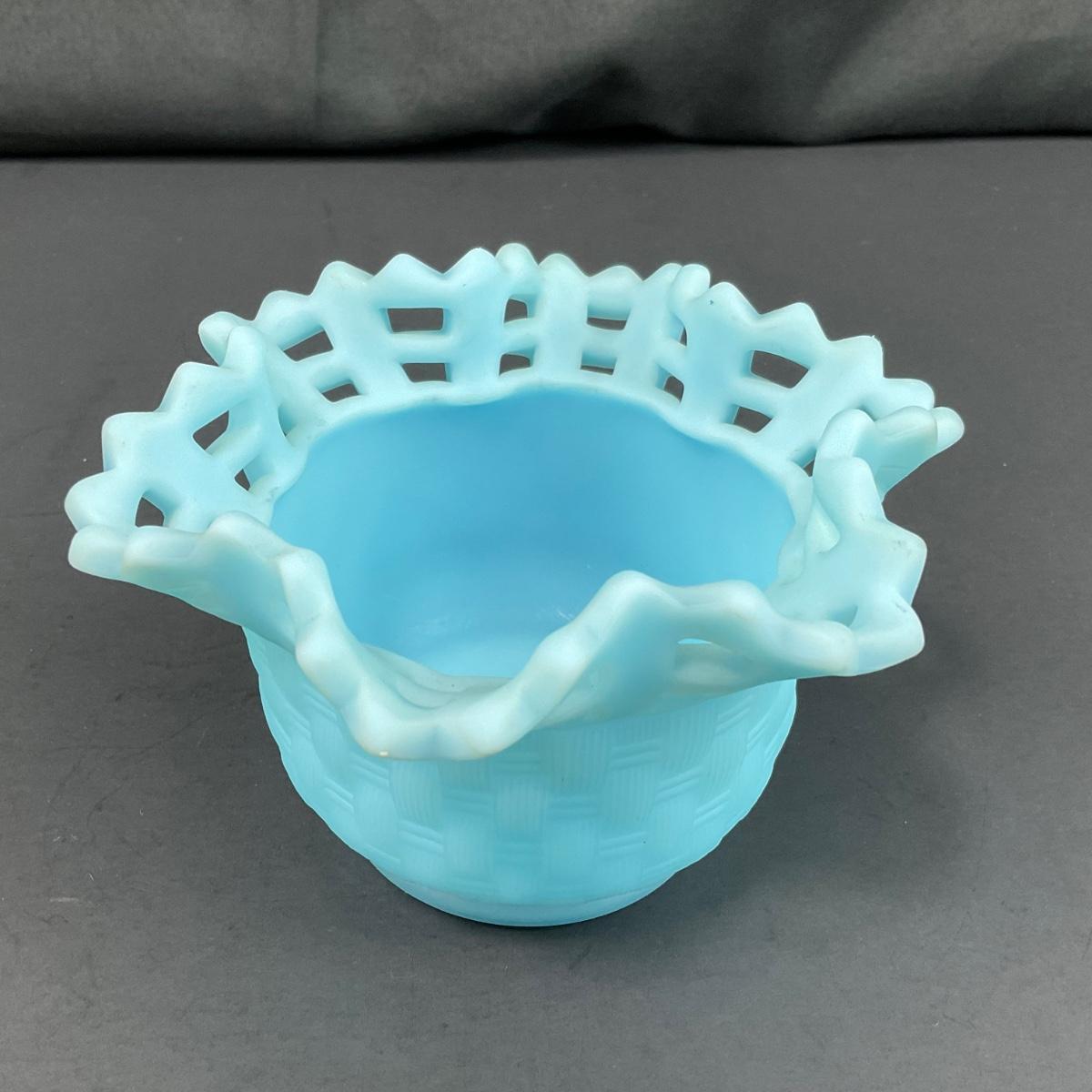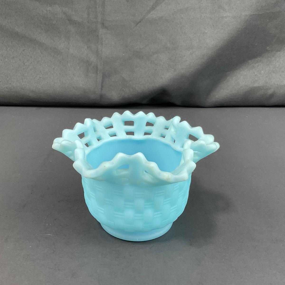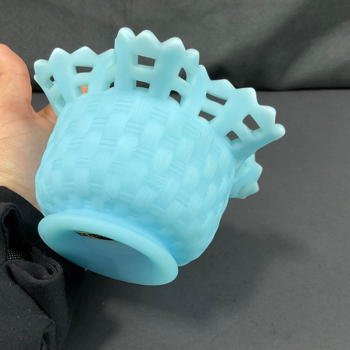 -126- FENTON | Satin Blue Basketweave Small Vase | Marked