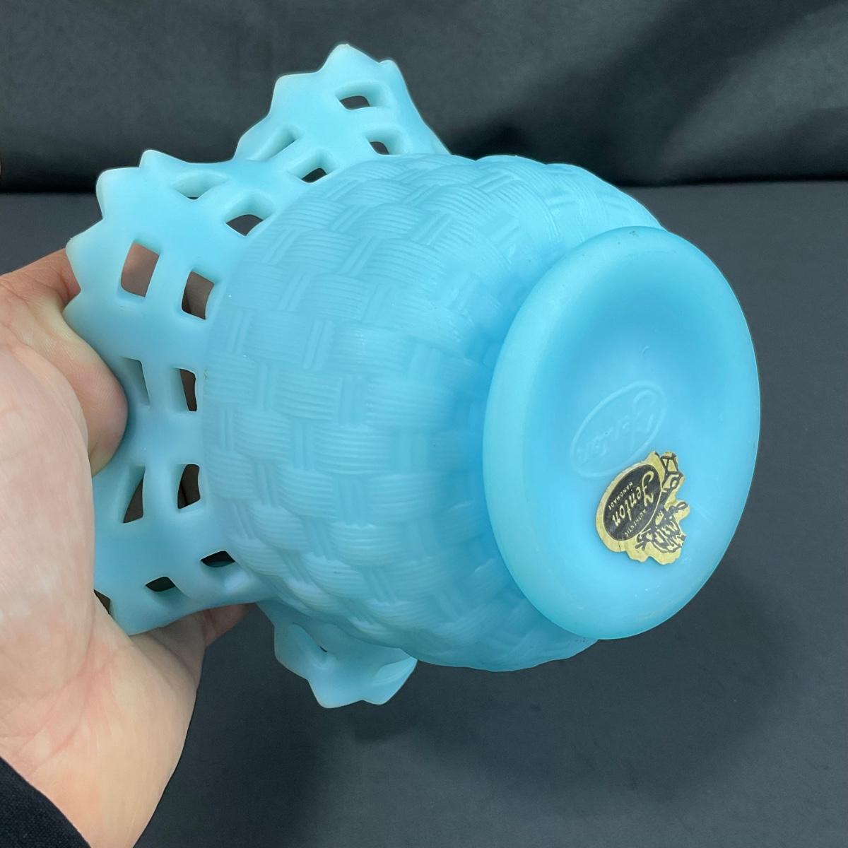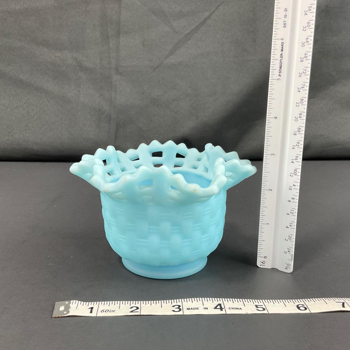 One vintage blue Fenton satin basketweave small vase. Please see photos for details and condition. Any condition statement is given as a courtesy to a client, is an opinion, and should not be treated as a statement of fact. Reference to condition written, oral or within a condition report shall not be regarded as a full account of condition and may not include all defects, alterations, or restorations. Absence of a condition report does not imply a lot is flawless or lacking imperfections or damage. Katherine’s Auction & Appraisal Service shall have no responsibility for any error or omission. Returns shall not be accepted on the basis of condition. ::: Shipping is available on this lot. If you require shipping you must let us know at the close of the auction. We will coordinate with you after the item has been won. Shipping fees will include insurance up to or exceeding the value of all items being mailed. If you have any questions regarding this lot please contact the auctioneer either via this website, by direct email or by phone. PICK UP TIMES and other important information can be found in the TERMS and DESCRIPTION of the auction. Please take a look for pertinent information. Thanks!