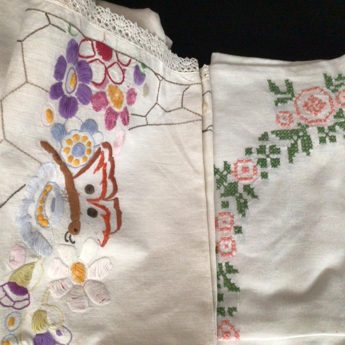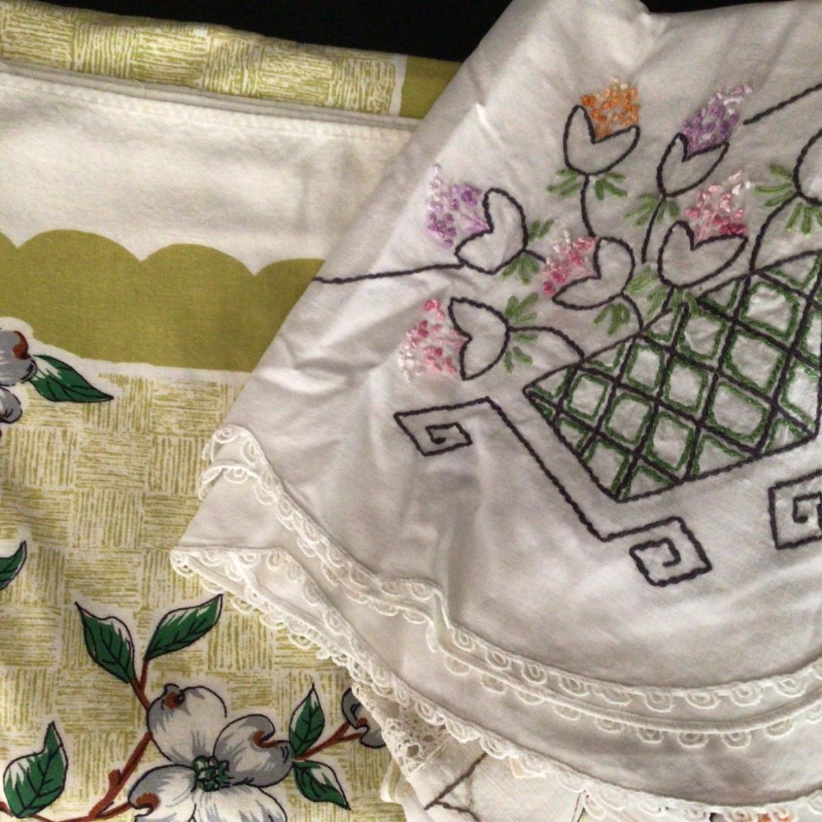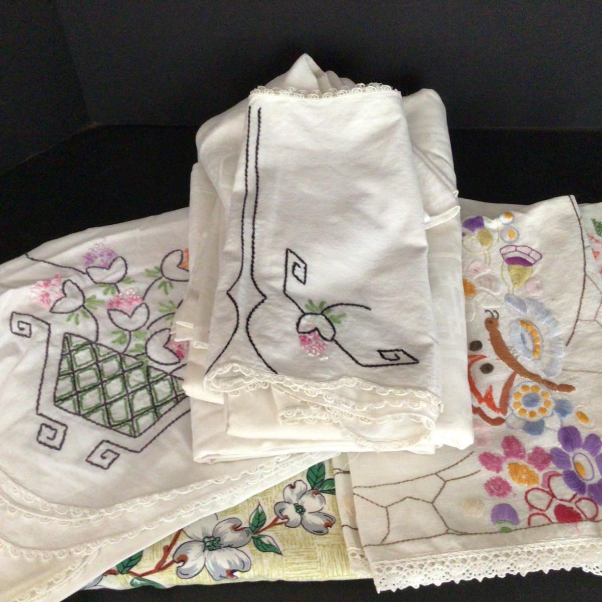 Lot has assorted table cloths that are hand stitched, they have some areas of discoloration.