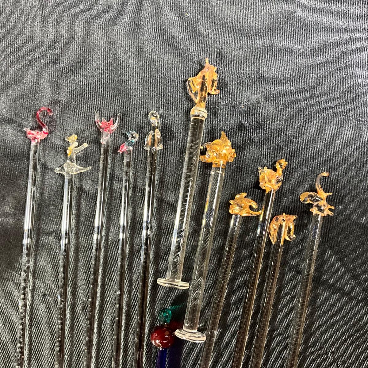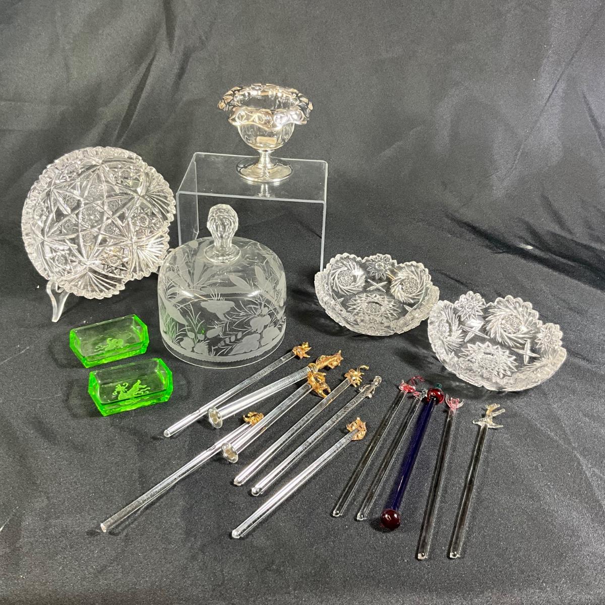 One larger bowl measures 6" diameter, the other smaller bowls measure 5" diameter and one bowl has a chip , the dome top has etching of fish swimming in the water and measures 5" diameter and 5.5" high the two uranium salt dishes measure 3" x 2" deep , the glass drink mixing sticks measure approximately 7" and are of various animals with sterling silver overlay crystal vase