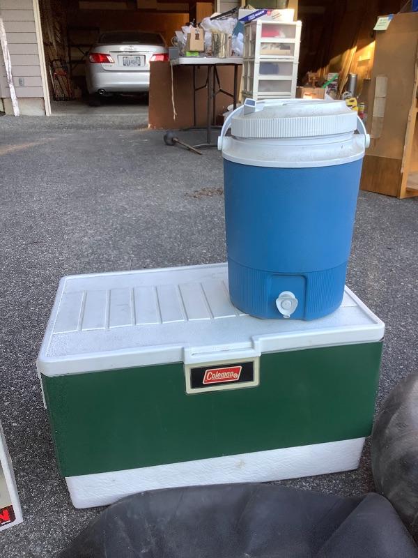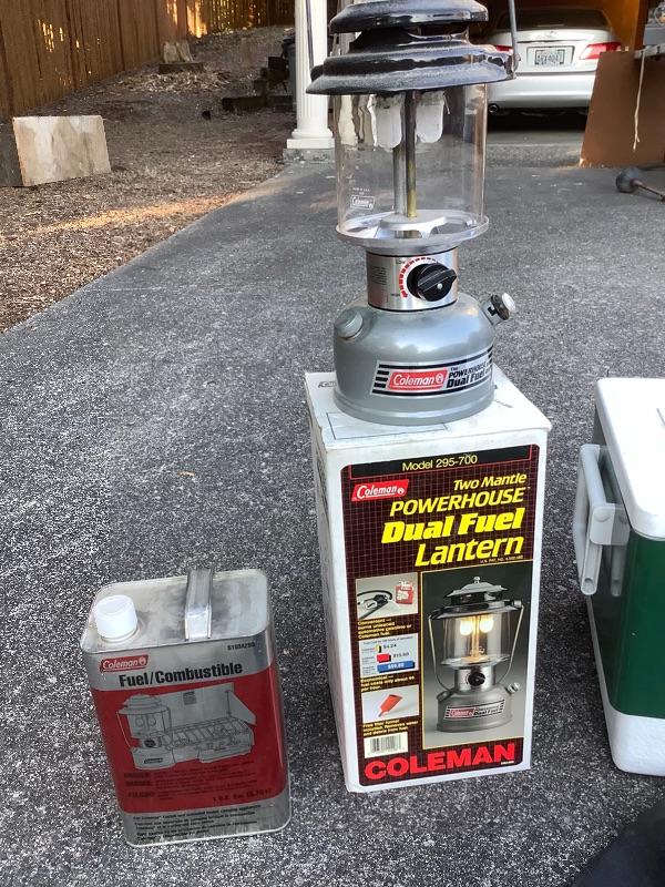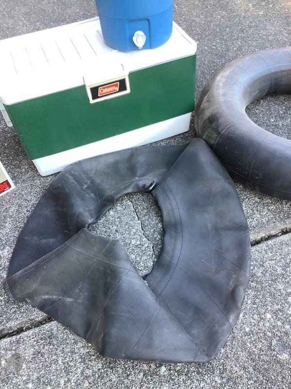 Coleman dual fuel lantern, Coleman cooler, water thermos, inertubes