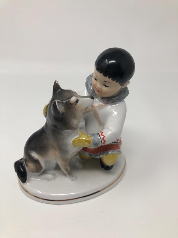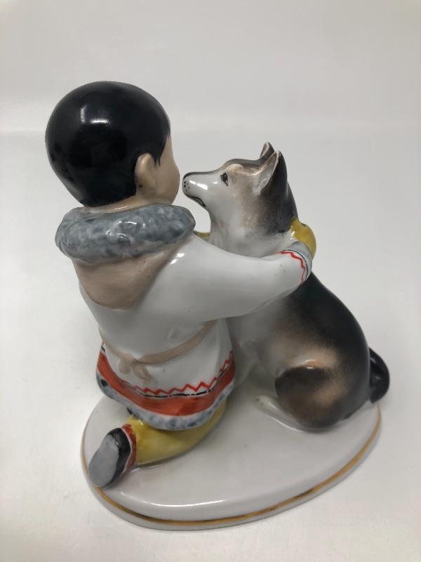 126: USSR Eskimo Girl and Boy with Dog Signed Figurine