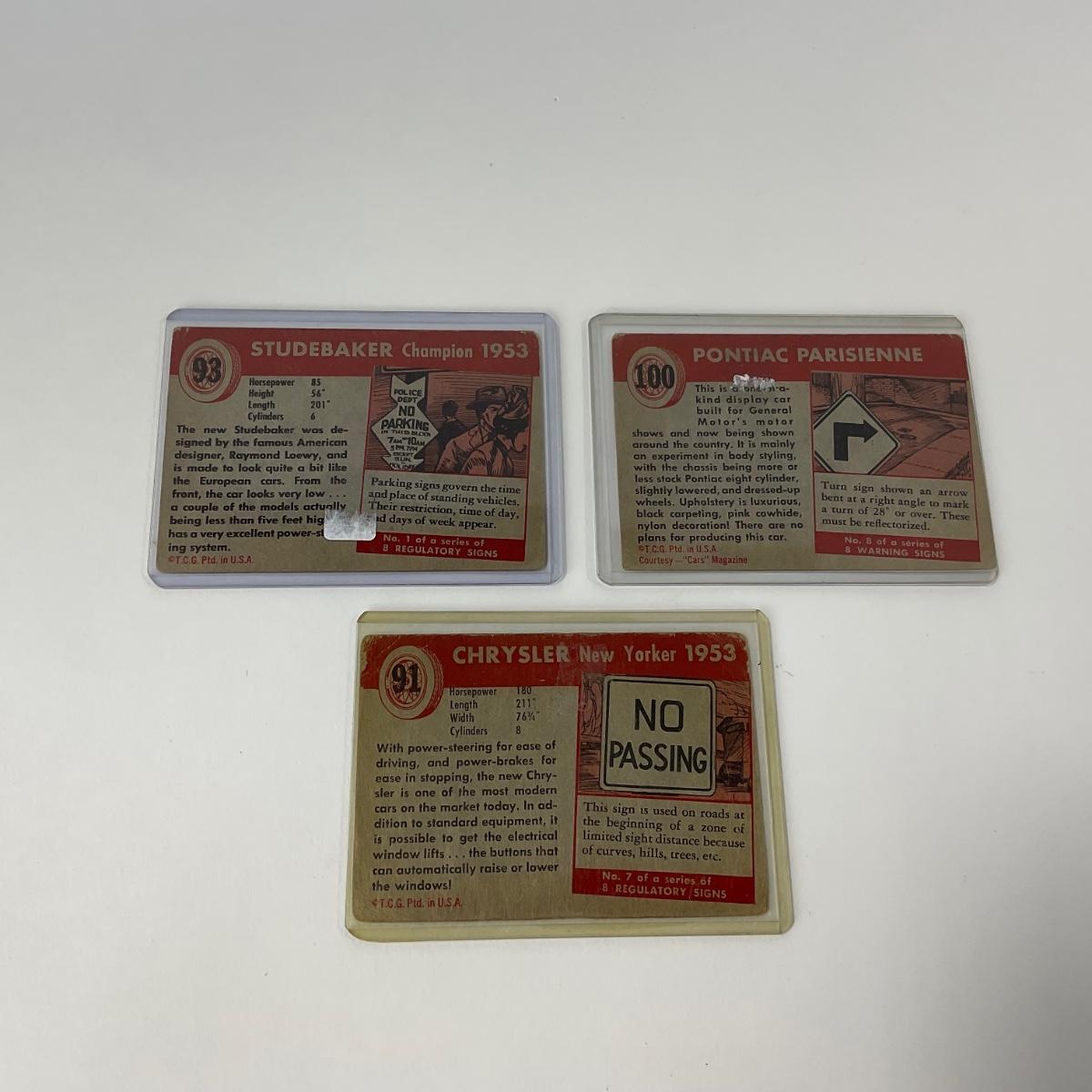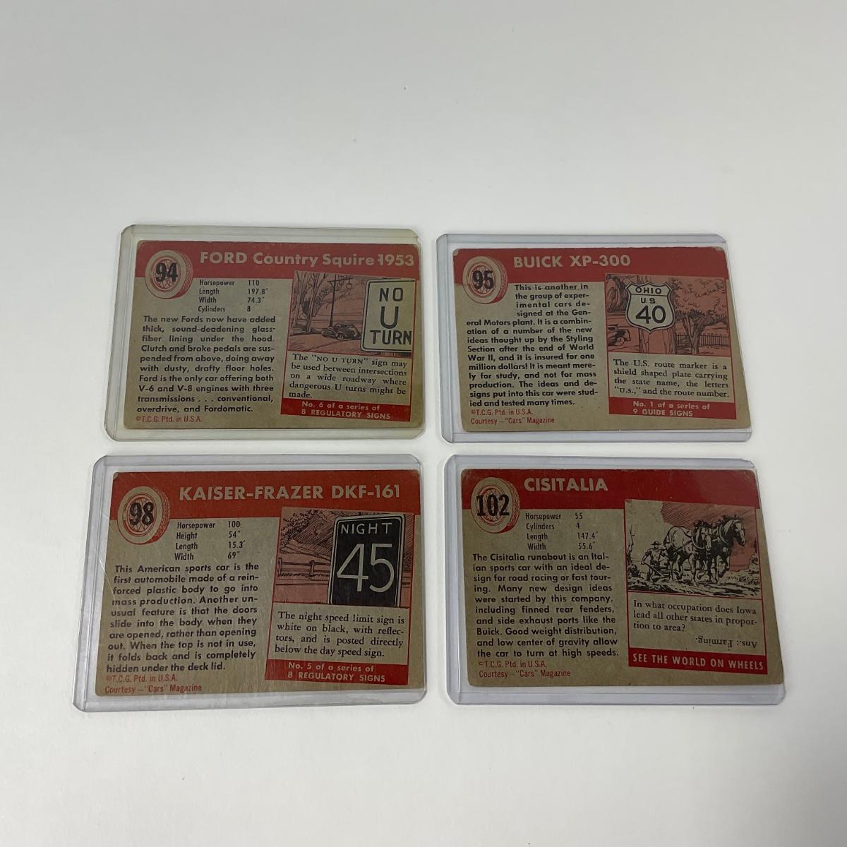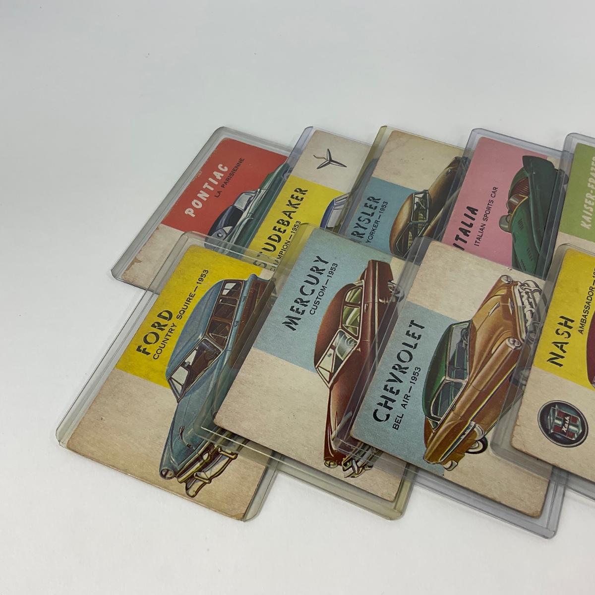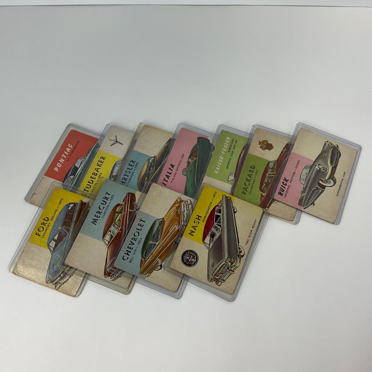 11 1953 Topps wheels of today car cards in plastic sleeves. Please see photos for details and condition. ::: Shipping is available on this lot. If you require shipping you must let us know at the close of the auction. We will coordinate with you after the item has been won. Shipping fees will include insurance up to or exceeding the value of all items being mailed. If you have any questions regarding this lot please contact the auctioneer either via this website, by direct email or by phone. PICK UP TIMES and other important information can be found in the TERMS and DESCRIPTION of the auction. Please take a look for pertinent information. Thanks!