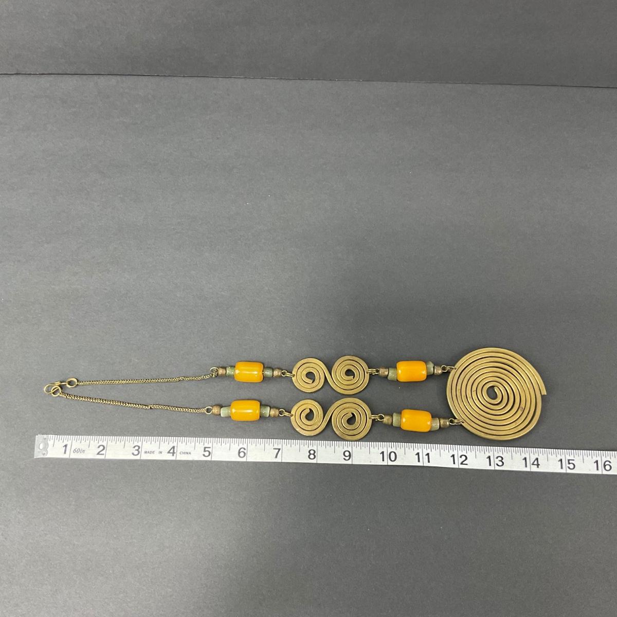 One what appears to be brass and beaded very unique chummy statement necklace. Please see photos for details and condition. Any condition statement is given as a courtesy to a client, is an opinion, and should not be treated as a statement of fact. Reference to condition written, oral or within a condition report shall not be regarded as a full account of condition and may not include all defects, alterations, or restorations. Absence of a condition report does not imply a lot is flawless or lacking imperfections or damage. Katherine’s Auction & Appraisal Service shall have no responsibility for any error or omission. Returns shall not be accepted on the basis of condition. ::: Shipping is available on this lot. If you require shipping you must let us know at the close of the auction. We will coordinate with you after the item has been won. Shipping fees will include insurance up to or exceeding the value of all items being mailed. If you have any questions regarding this lot please contact the auctioneer either via this website, by direct email or by phone. PICK UP TIMES and other important information can be found in the TERMS and DESCRIPTION of the auction. Please take a look for pertinent information. Thanks!