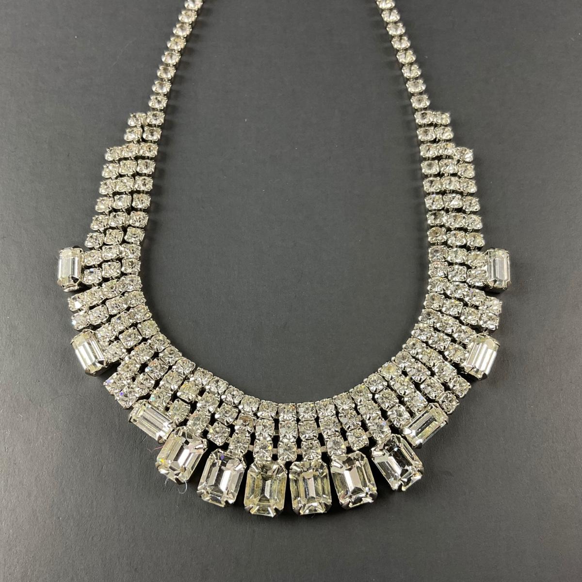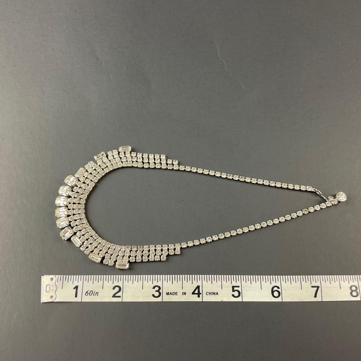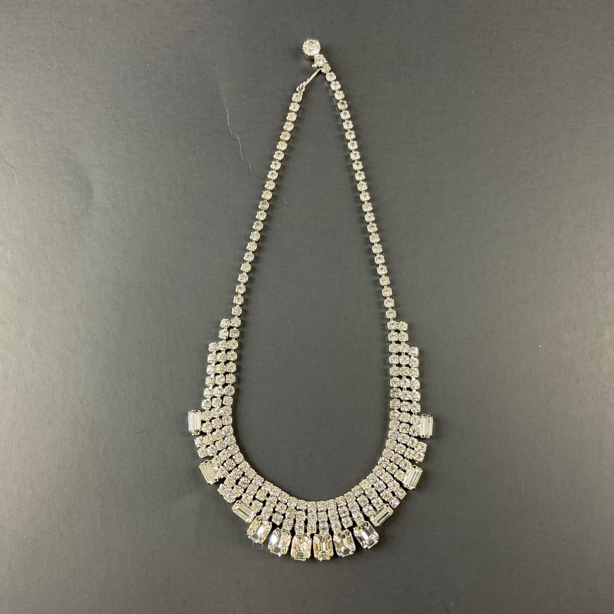 One marked costume jewelry rhinestone necklace . This piece has no damage, and appears to be in great shape with no visable chips, cracks, or broken pieces. Please see photos for details and condition. Any condition statement is given as a courtesy to a client, is an opinion, and should not be treated as a statement of fact. Reference to condition written, oral or within a condition report shall not be regarded as a full account of condition and may not include all defects, alterations, or restorations. Absence of a condition report does not imply a lot is flawless or lacking imperfections or damage. Katherine’s Auction & Appraisal Service shall have no responsibility for any error or omission. Returns shall not be accepted on the basis of condition. ::: Shipping is available on this lot. If you require shipping you must let us know at the close of the auction. We will coordinate with you after the item has been won. Shipping fees will include insurance up to or exceeding the value of all items being mailed. If you have any questions regarding this lot please contact the auctioneer either via this website, by direct email or by phone. PICK UP TIMES and other important information can be found in the TERMS and DESCRIPTION of the auction. Please take a look for pertinent information. Thanks!
