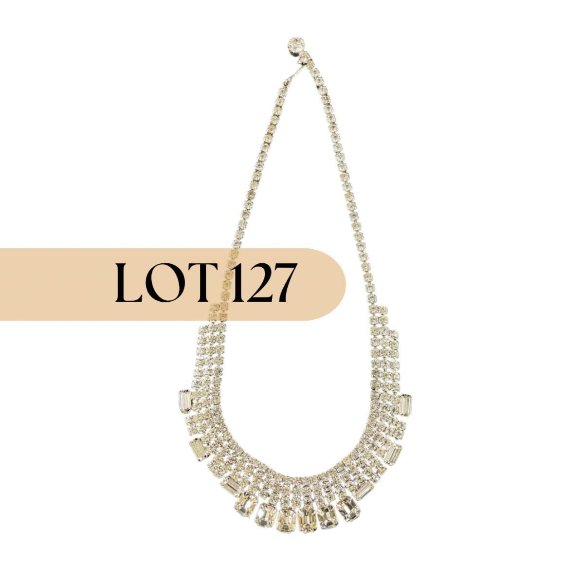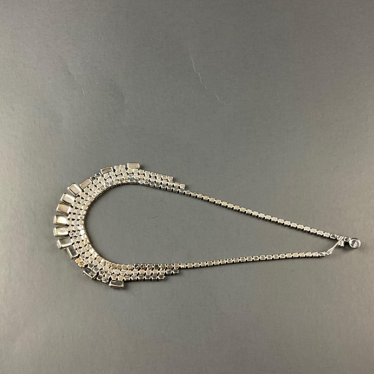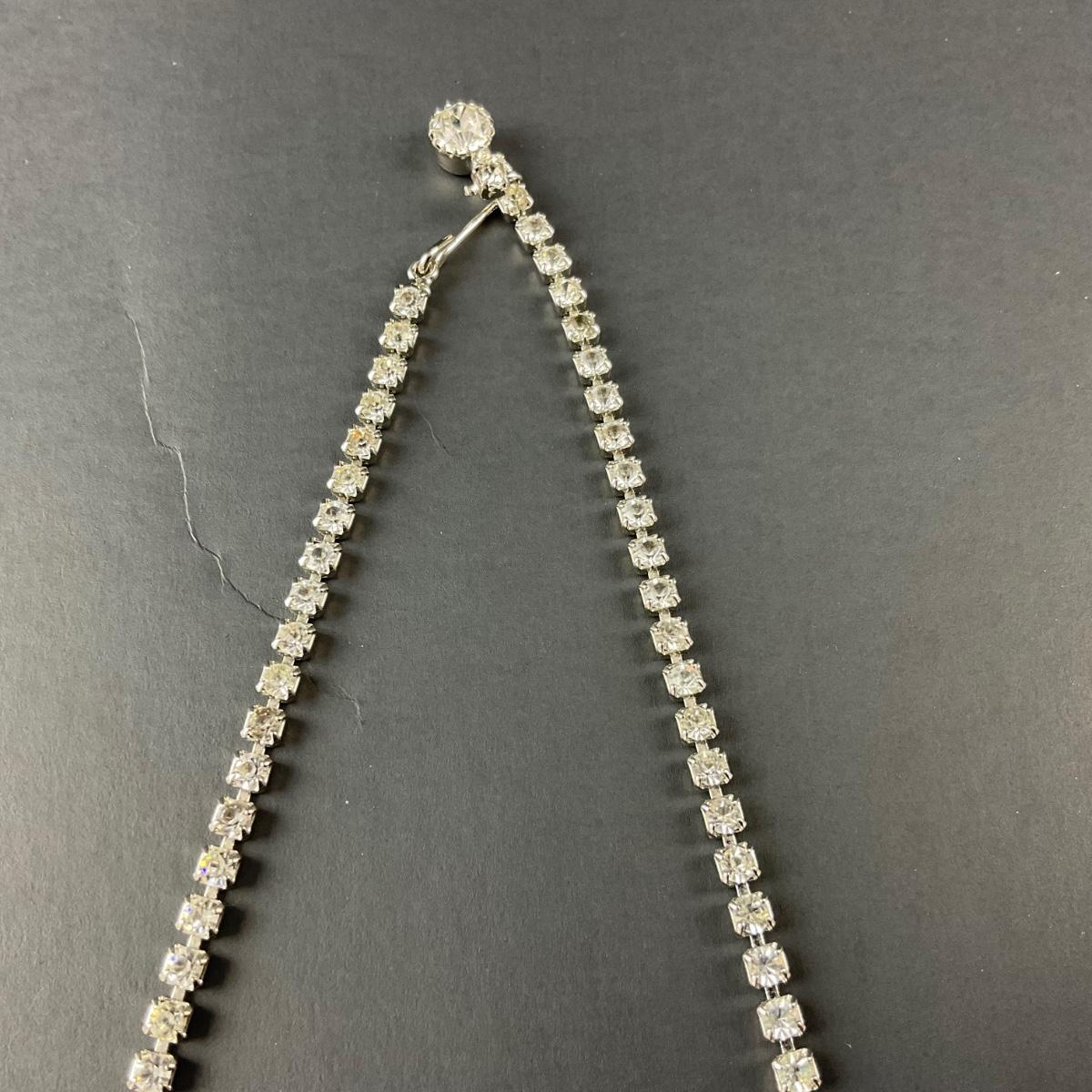 One marked costume jewelry rhinestone necklace . This piece has no damage, and appears to be in great shape with no visable chips, cracks, or broken pieces. Please see photos for details and condition. Any condition statement is given as a courtesy to a client, is an opinion, and should not be treated as a statement of fact. Reference to condition written, oral or within a condition report shall not be regarded as a full account of condition and may not include all defects, alterations, or restorations. Absence of a condition report does not imply a lot is flawless or lacking imperfections or damage. Katherine’s Auction & Appraisal Service shall have no responsibility for any error or omission. Returns shall not be accepted on the basis of condition. ::: Shipping is available on this lot. If you require shipping you must let us know at the close of the auction. We will coordinate with you after the item has been won. Shipping fees will include insurance up to or exceeding the value of all items being mailed. If you have any questions regarding this lot please contact the auctioneer either via this website, by direct email or by phone. PICK UP TIMES and other important information can be found in the TERMS and DESCRIPTION of the auction. Please take a look for pertinent information. Thanks!
