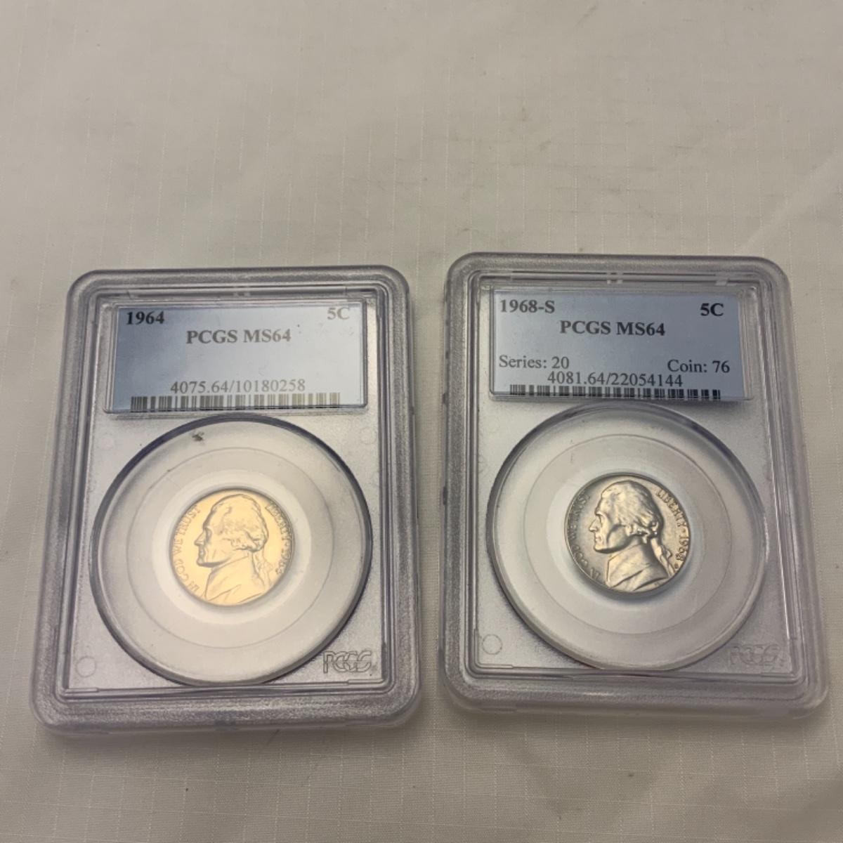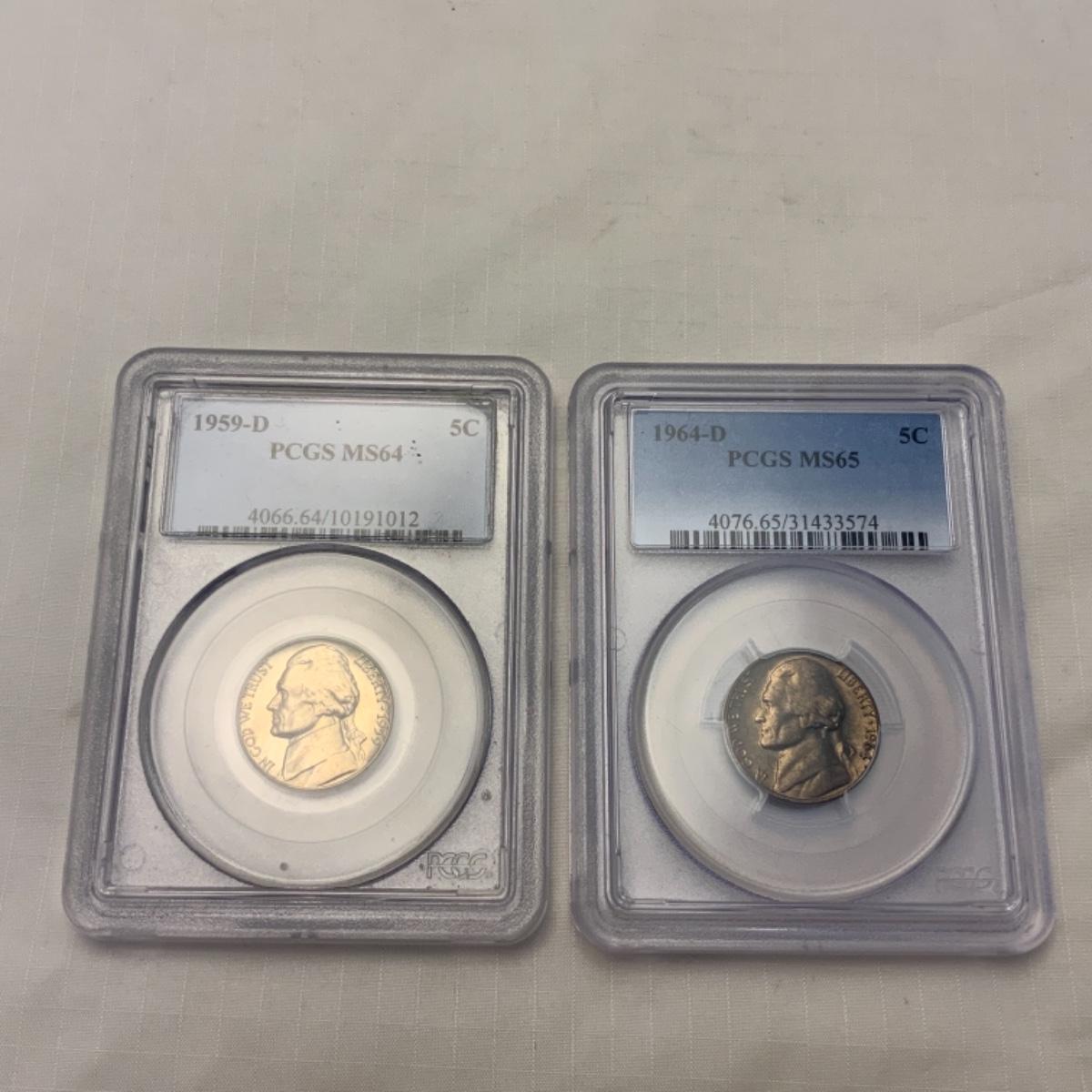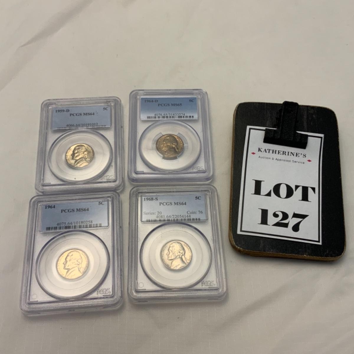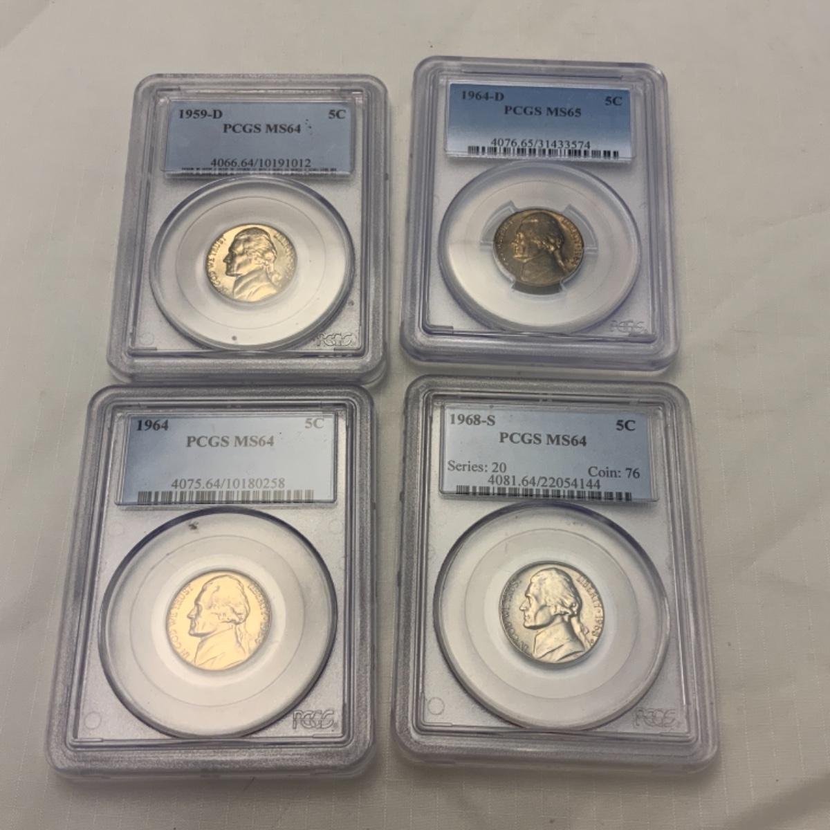 Four Graded Jefferson Nickels in Slabs. 1959 D - MS64 // 1964 D - MS65 // 1964 - MS64 // 1968 S - MS64. All graded by PCGS. Please see photos for details and condition. ::: Shipping is available on this lot. If you require shipping you must let us know at the close of the auction. We will coordinate with you after the item has been won. Shipping fees will include insurance up to or exceeding the value of all items being mailed. If you have any questions regarding this lot please contact the auctioneer either via this website, by direct email or by phone. PICK UP TIMES and other important information can be found in the TERMS and DESCRIPTION of the auction. Please take a look for pertinent information. Thanks!