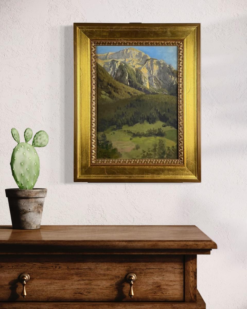 Original oil painting depicting a dramatic mountain landscape, likely inspired by the European Alps. Painted in a traditional early–mid 20th century style with layered brushwork and naturalistic color palette. Signed lower corner (signature partially legible; artist unidentified).