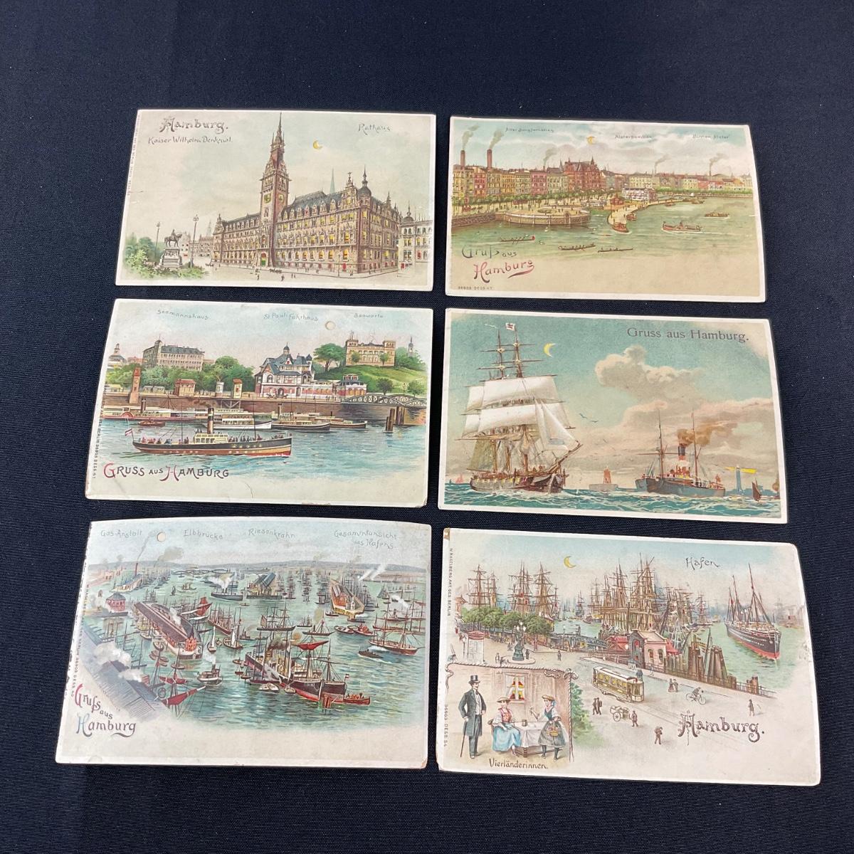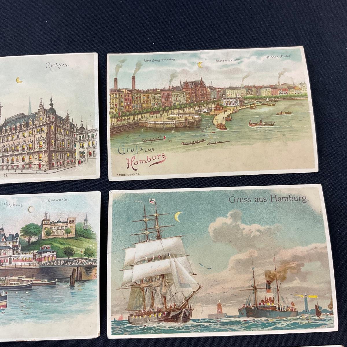 Six vintage Hamburg hold to the light postcards, which special cutouts for like to glow through. Please see photos for details and condition. Any condition statement is given as a courtesy to a client, is an opinion, and should not be treated as a statement of fact. Reference to condition written, oral or within a condition report shall not be regarded as a full account of condition and may not include all defects, alterations, or restorations. Absence of a condition report does not imply a lot is flawless or lacking imperfections or damage. Katherine’s Auction & Appraisal Service shall have no responsibility for any error or omission. Returns shall not be accepted on the basis of condition. ::: Shipping is available on this lot. If you require shipping you must let us know at the close of the auction. We will coordinate with you after the item has been won. Shipping fees will include insurance up to or exceeding the value of all items being mailed. If you have any questions regarding this lot please contact the auctioneer either via this website, by direct email or by phone. PICK UP TIMES and other important information can be found in the TERMS and DESCRIPTION of the auction. Please take a look for pertinent information. Thanks!