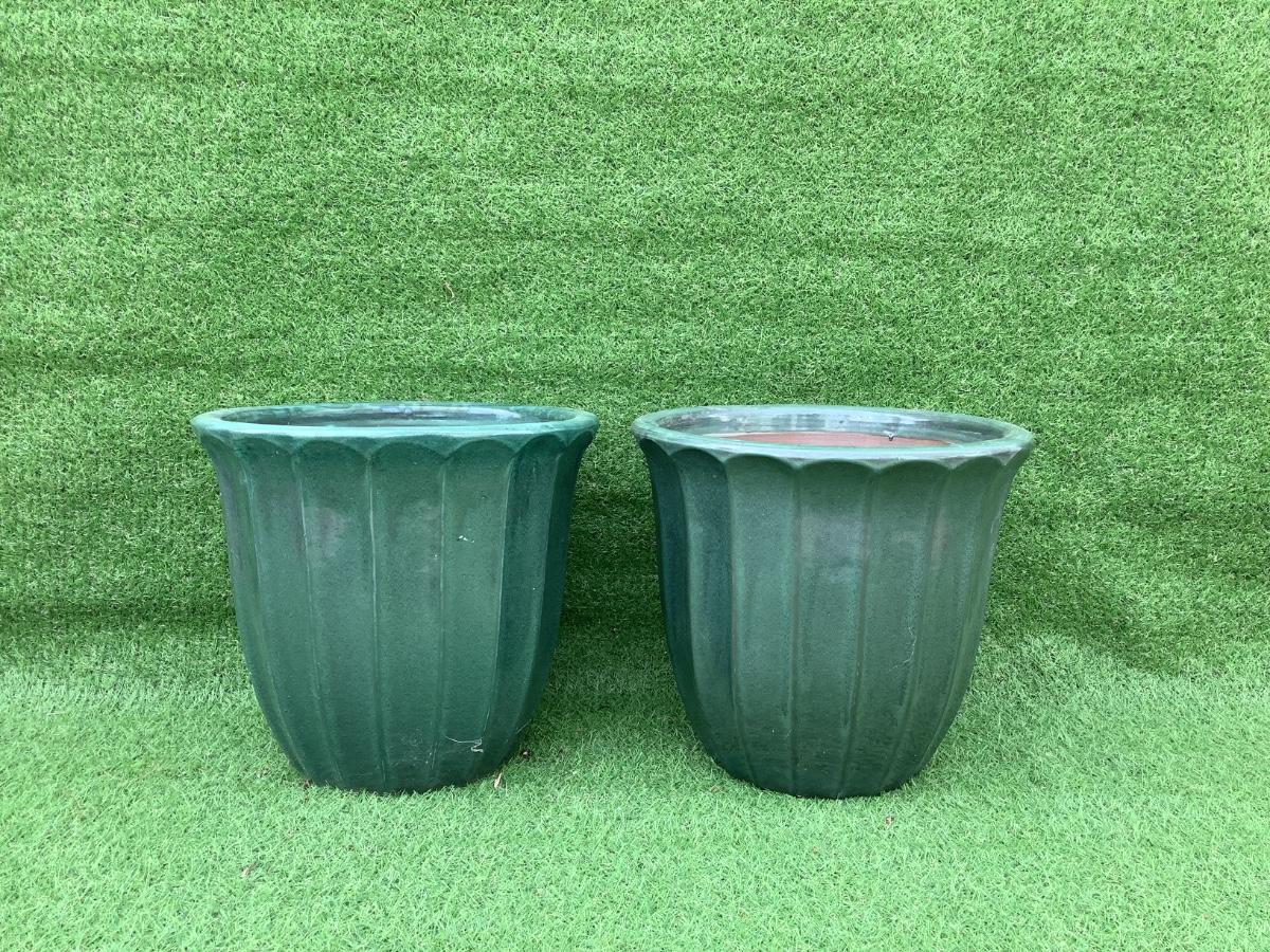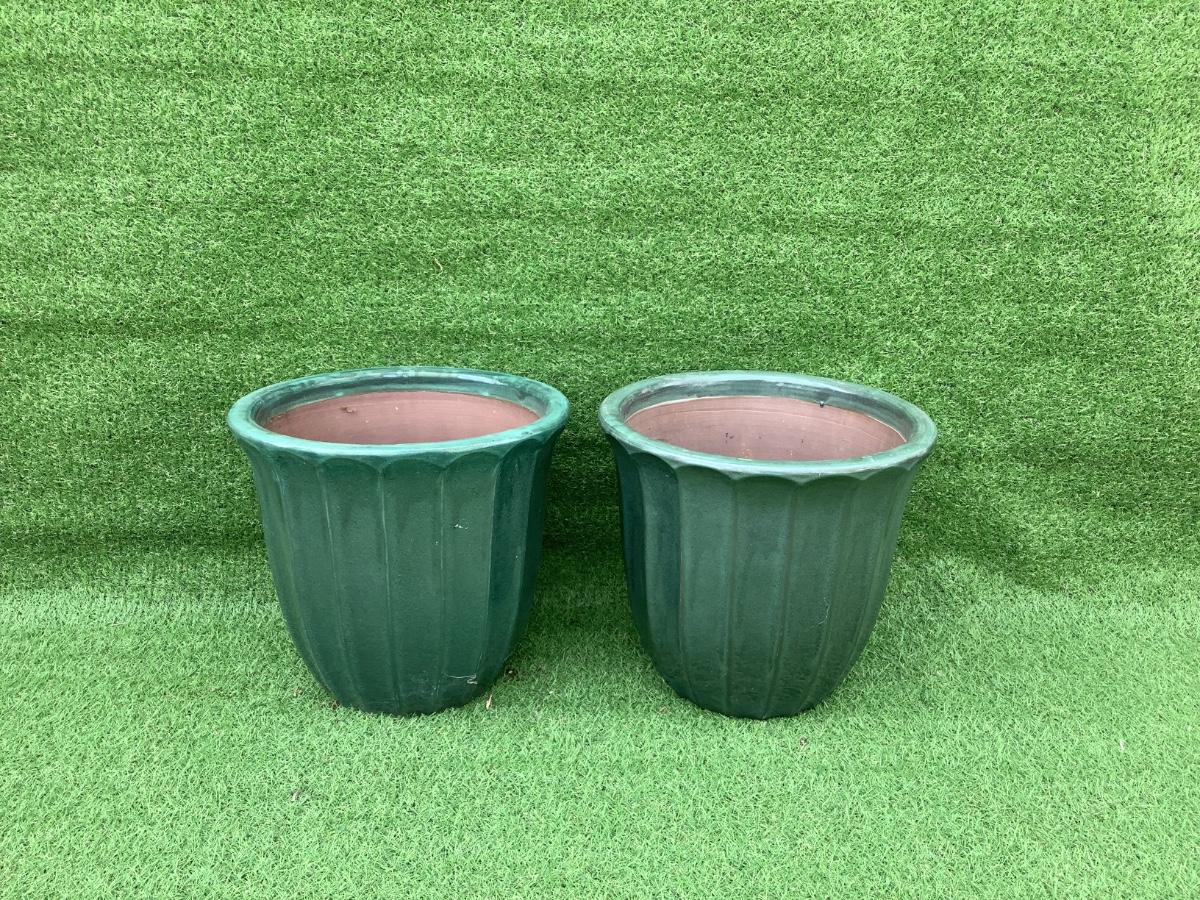 Pair of matching green glaze terracotta planters, they measure 14.5" tall and 16" diameter.