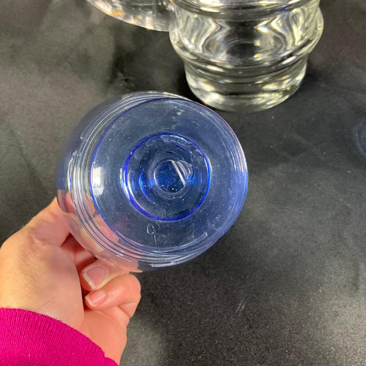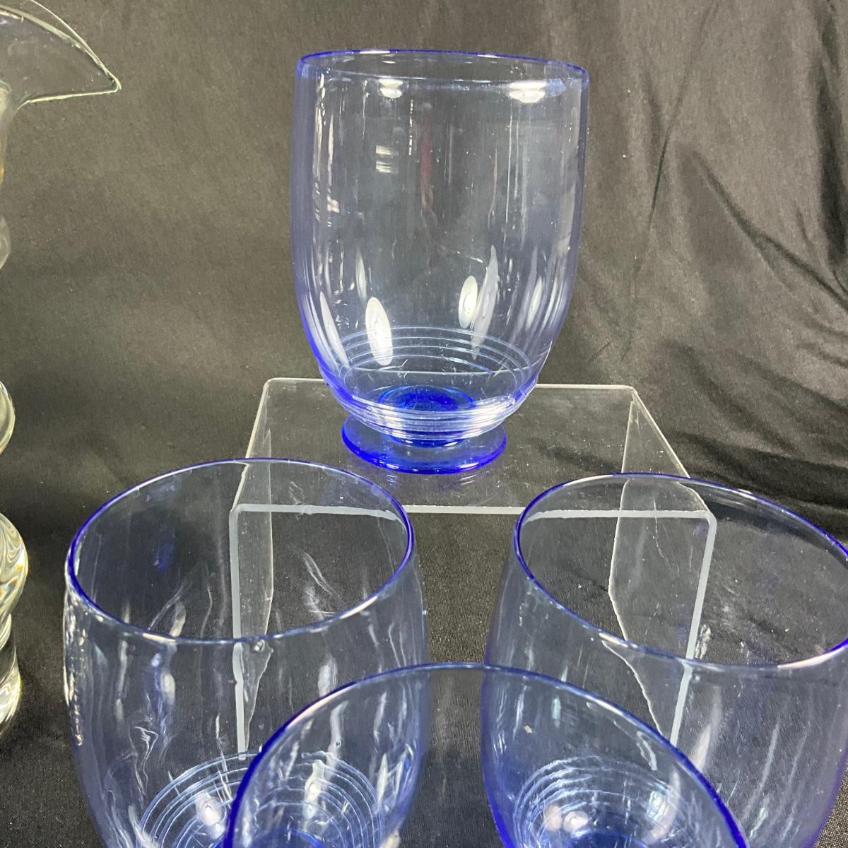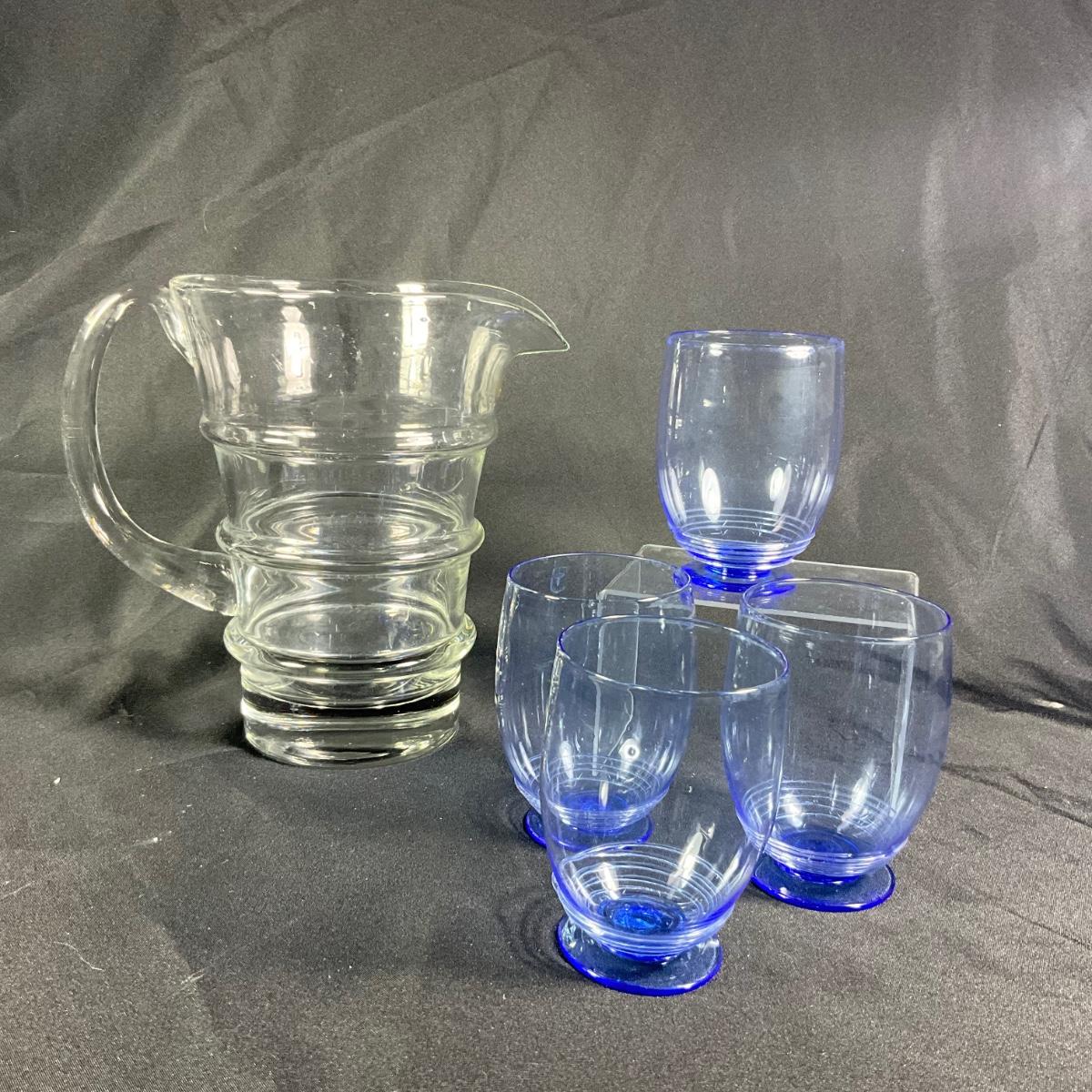 1270 Vintage Italian Glass Pitcher and Handblown Blue Pedestal Water Glasses