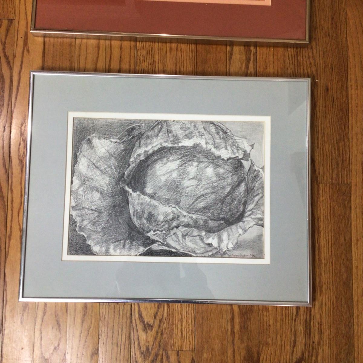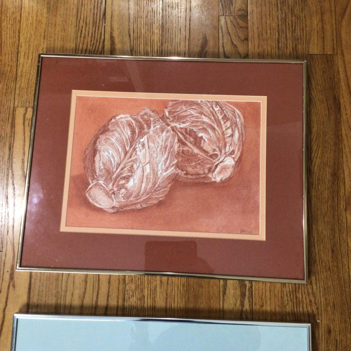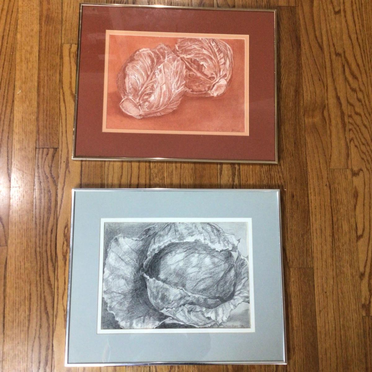 There are 2 framed sketches of cabbage by local artist Marlen Binder.