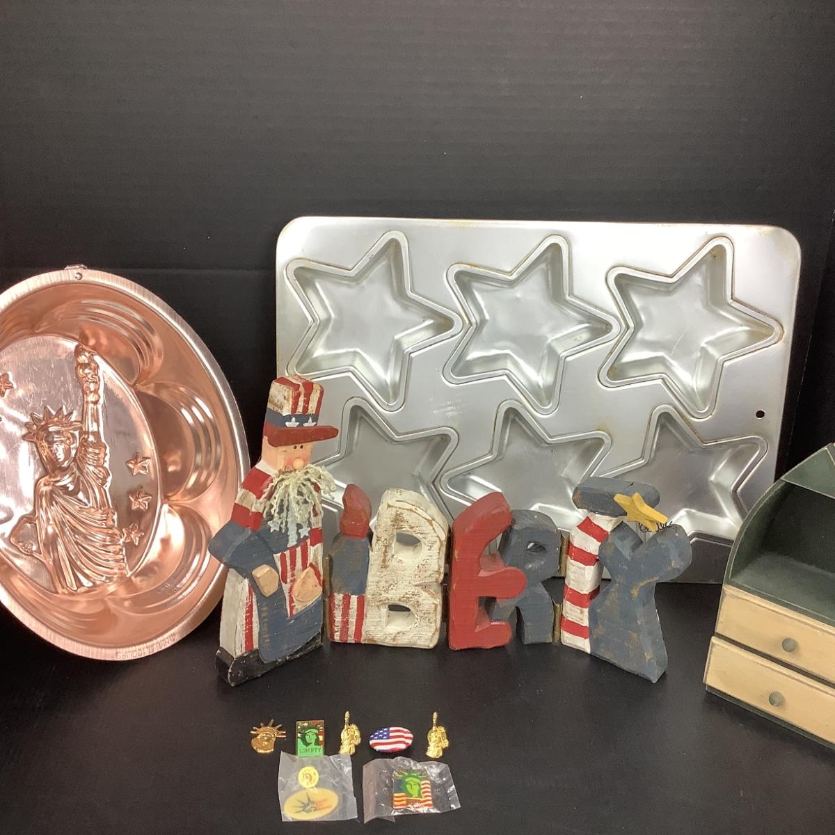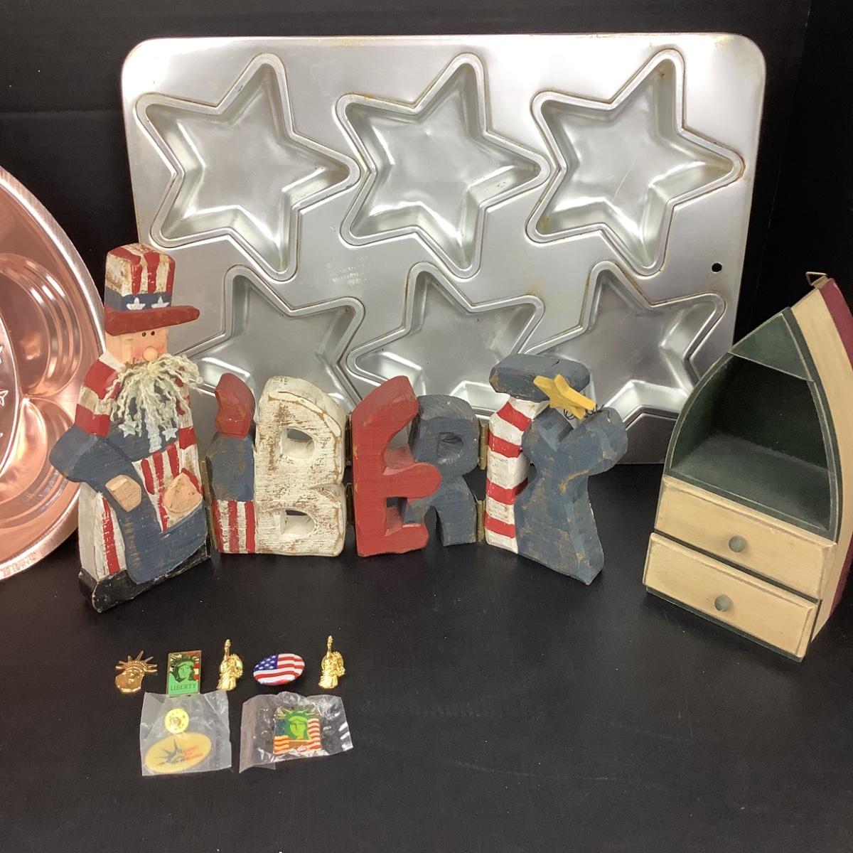Liberty sign, assorted patriotic pins, Liberty pan and star baking pan