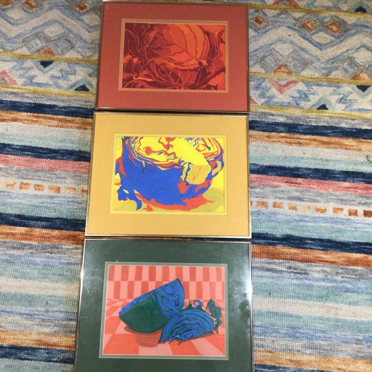 There are 3 matted and framed art block pictures by local artist Marlen Binder.