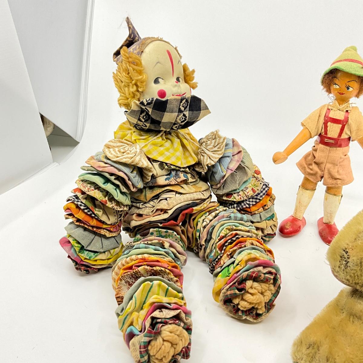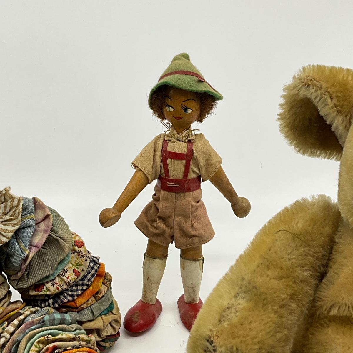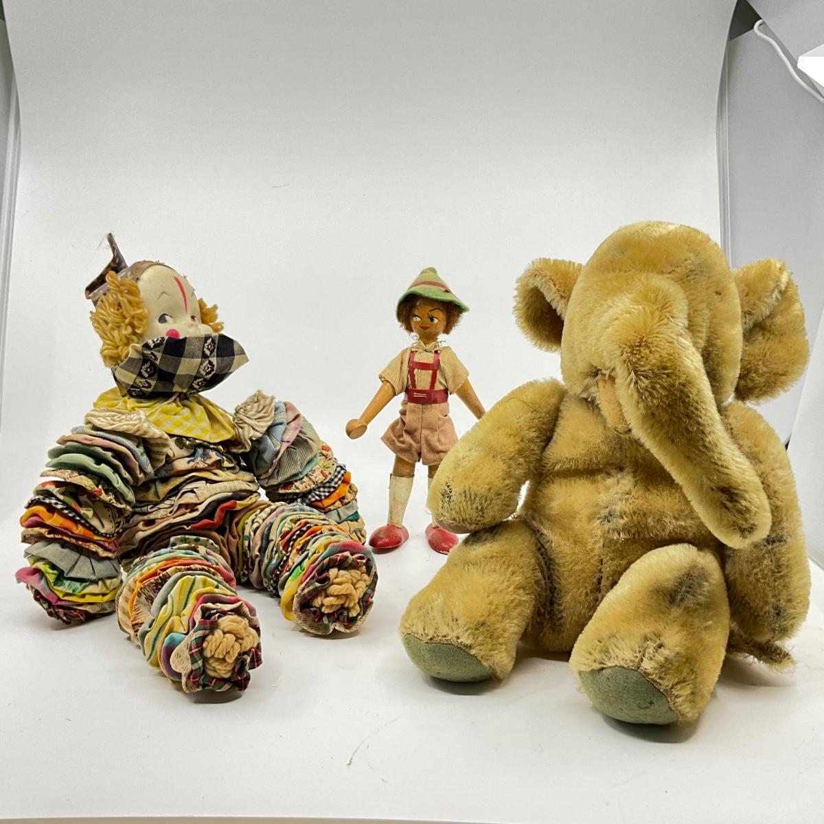 1274 Vintage Steiff Elephant with Rag Doll and German Wooden Doll